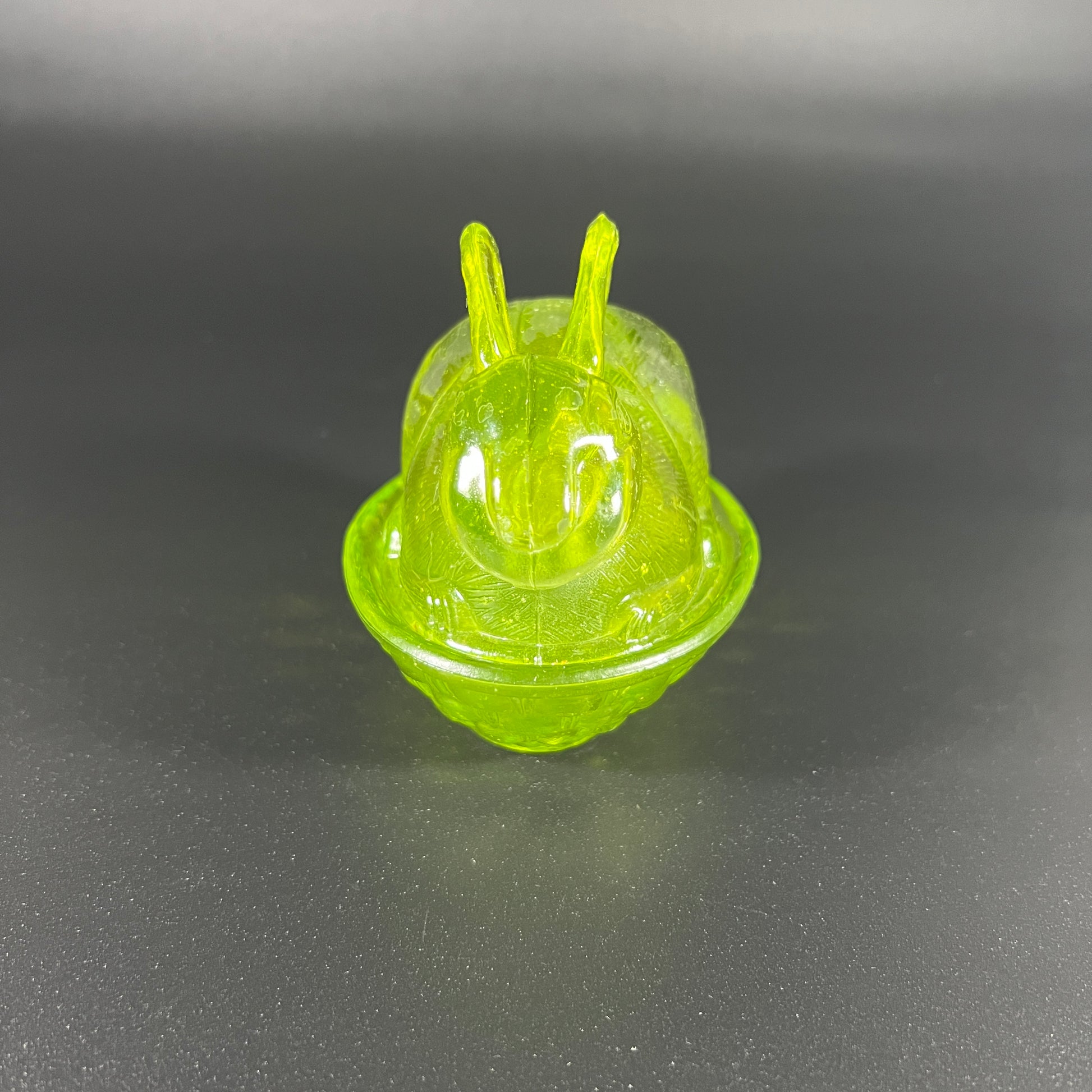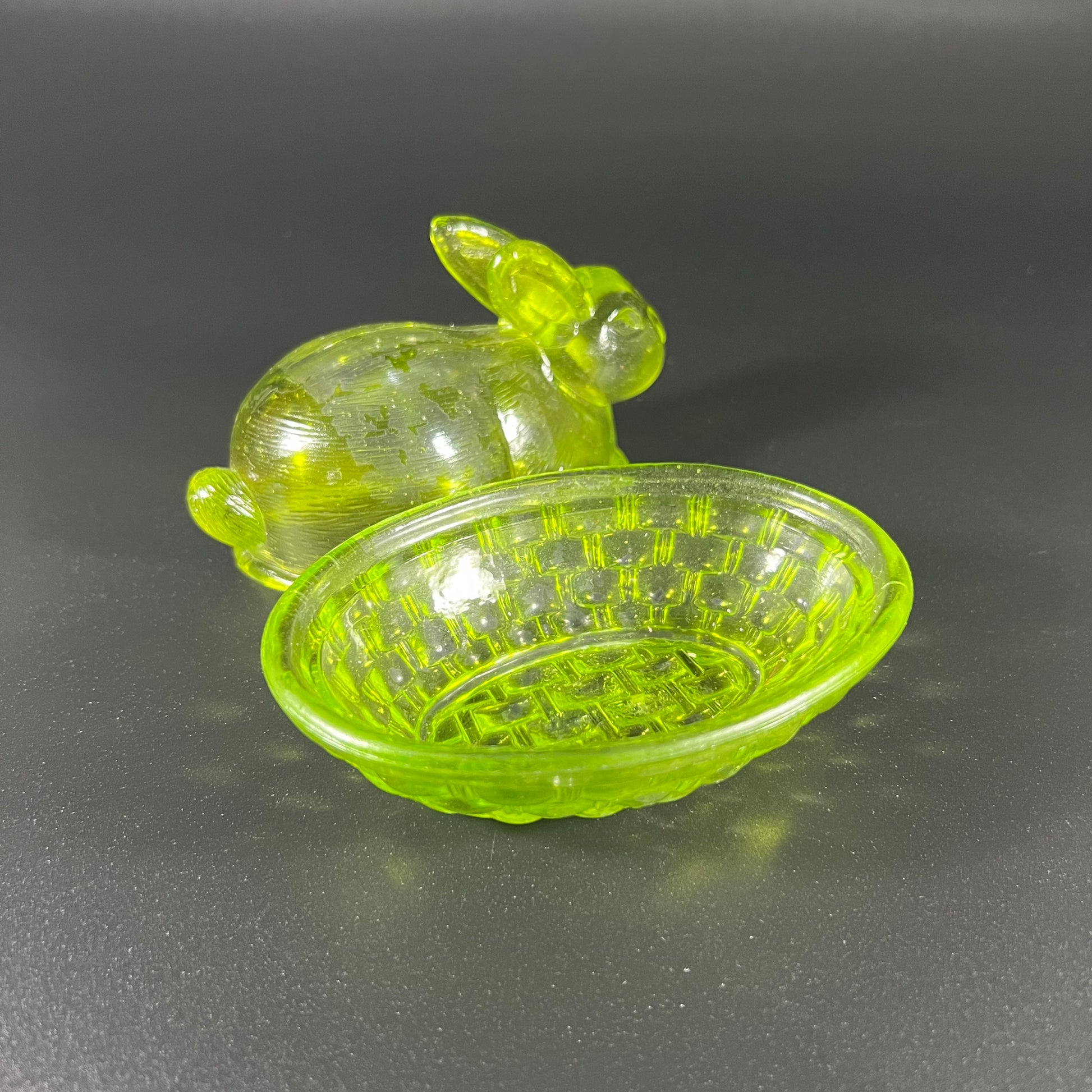 This adorable vintage green glass nested bunny candy/trinket dish is a charming piece perfect for Easter treats or storing small treasures. The molded glass bunny sits atop a beautifully weaved basket, adding a whimsical touch to any decor. It appears to be painted glass, and there appears to be some missing paint on the back, as seen in the photos. No chips or cracks in the glass. The bunny dish measures 5" long x 3.5" wide and 4" tall.