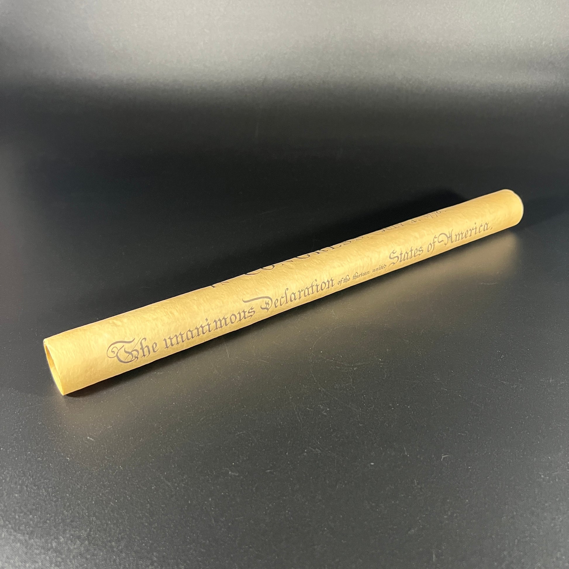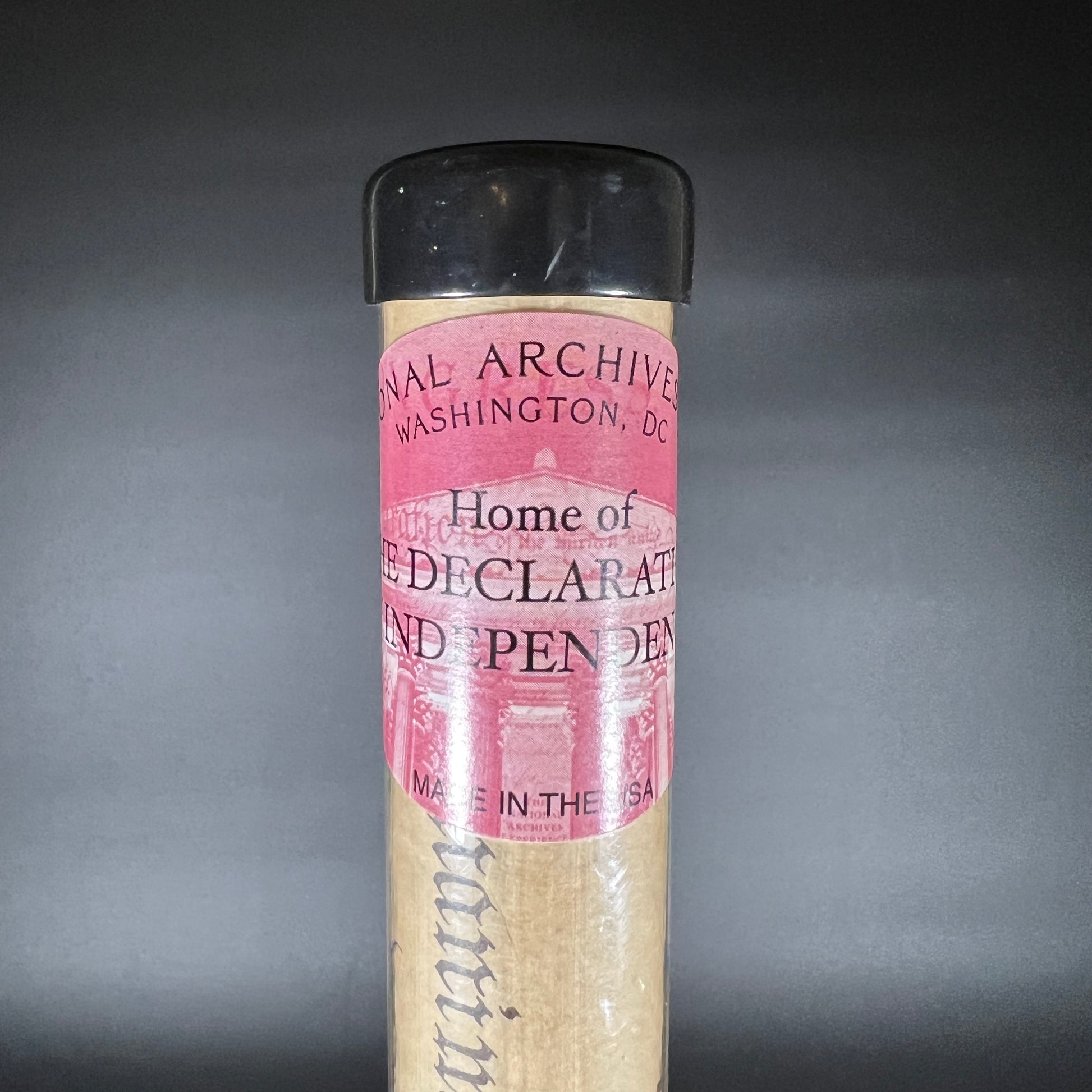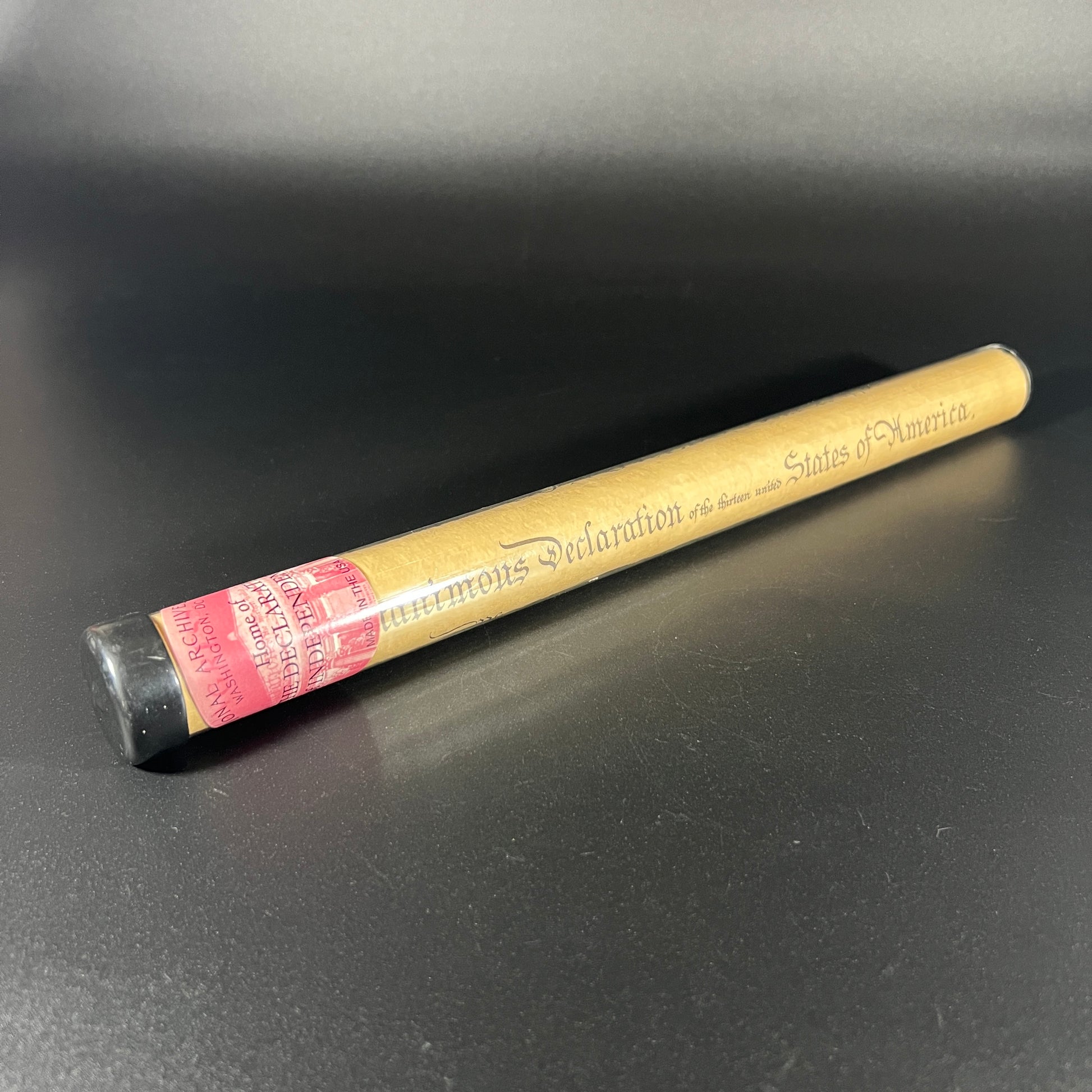 Replica of the Declaration of Independence from the National Archives in Washington, D.C. This beautifully printed reproduction is on weathered parchment paper, designed to capture the authentic look and feel of the original document. It comes with the original packaging tube, though one end cap is missing. In good pre-owned condition, with minimal signs of wear. The packaging measures approximately 14.25 inches in length and 1.5 inches in width, making it a unique and historic piece for any collection.