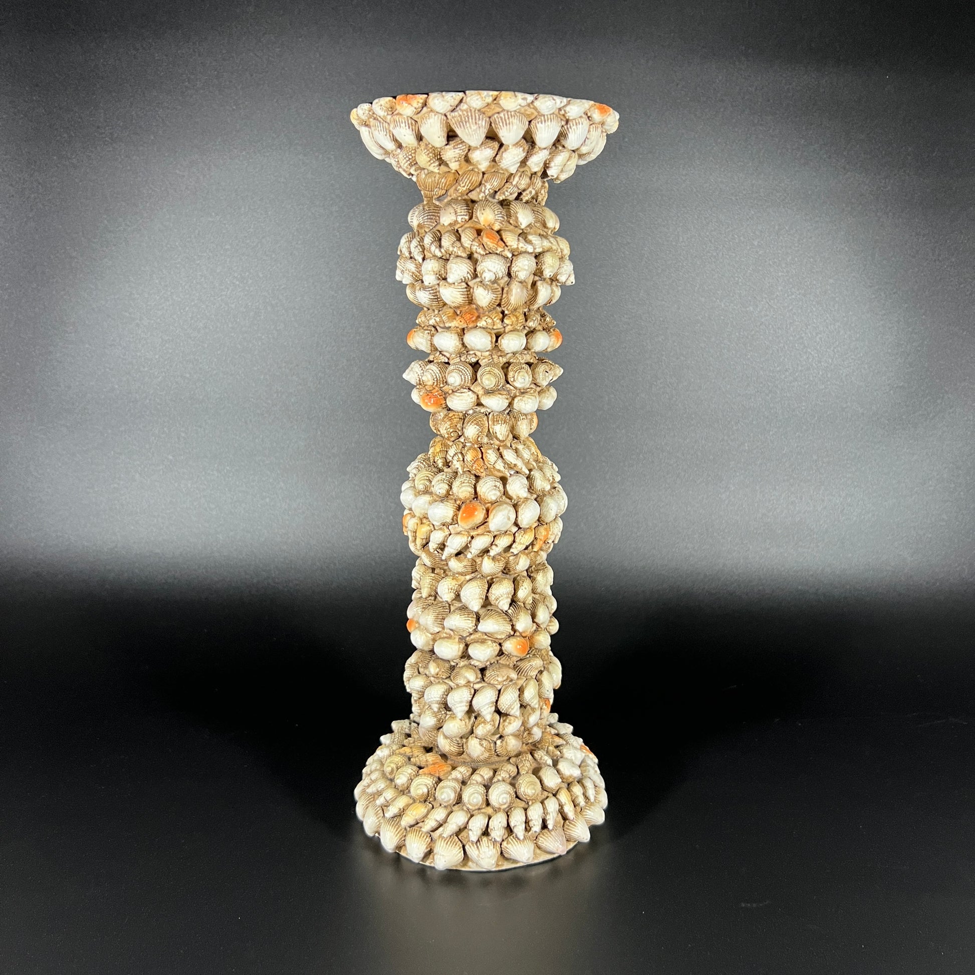 Vintage tropical island-inspired resin shell candle holder, perfect for adding a coastal touch to any space. Measures 12" H with a 4" diameter.