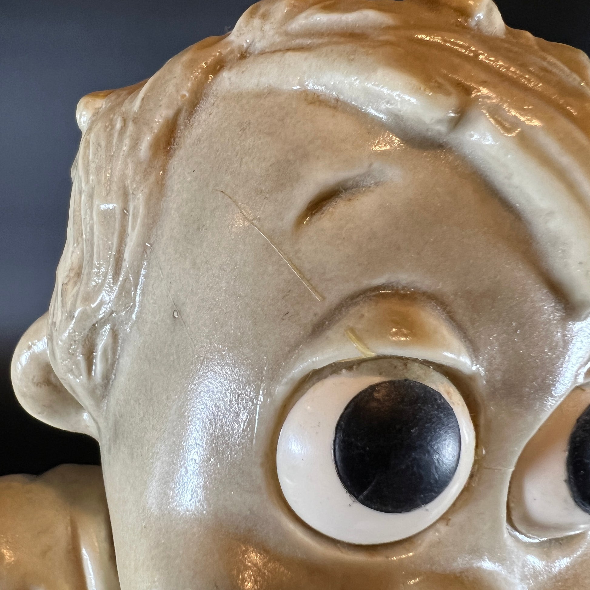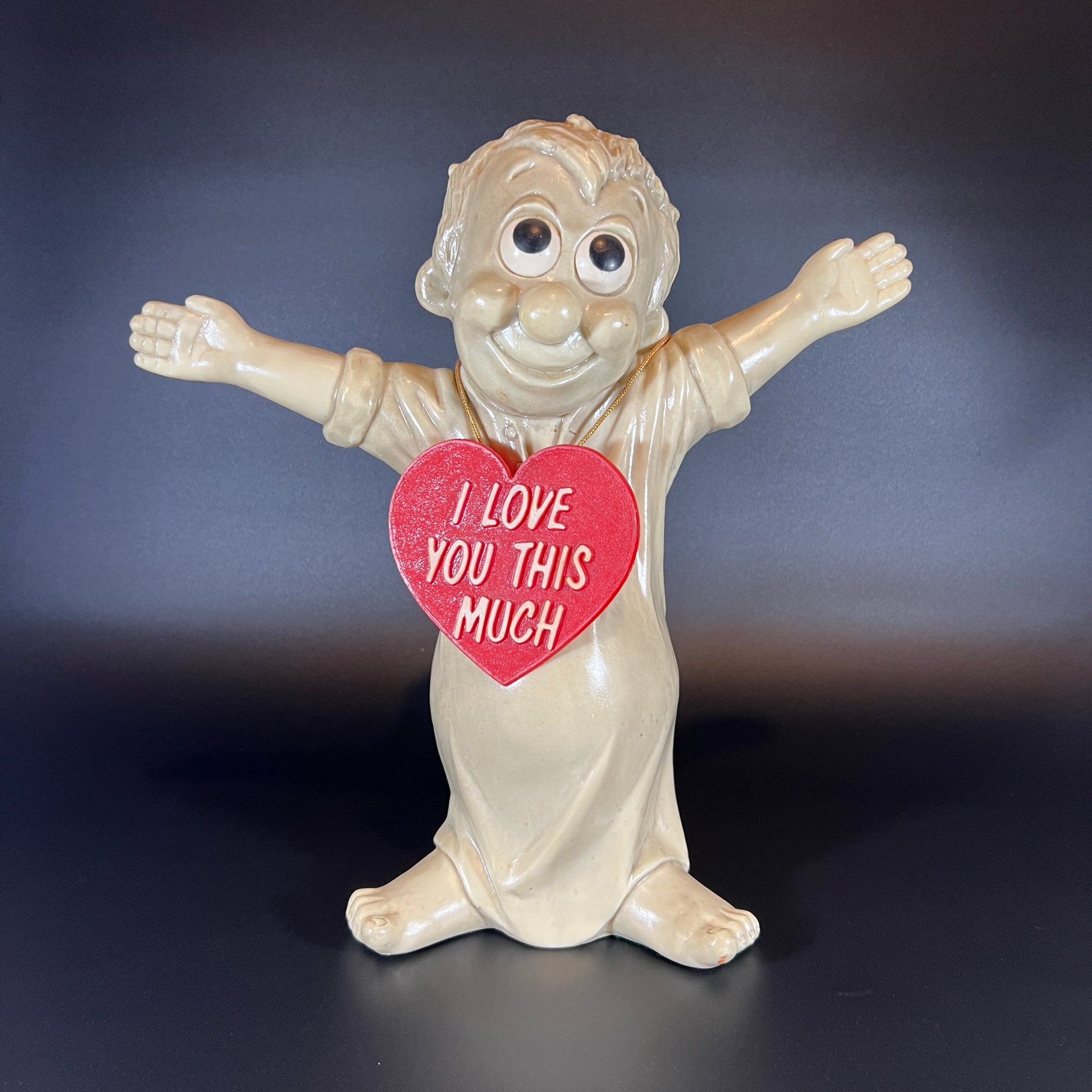 Russ Berrie & Co. First Edition "I Love You This Much" Figurine. This charming statue by Russ Berrie & Co. (Wallace Berrie & Co.) has the appearance of ceramic but is crafted from durable hard plastic/resin. Featuring a red heart with the sentiment "I Love You This Much," this figurine was first issued in 1968, making it a wonderful vintage collectible. It’s an ideal gift for someone special, perfect for expressing love and affection. Measuring approximately 11" W x 12" H x 4" D, it is made in the USA from hard-formed plastic and remains in good vintage condition. There appears to be a thin glue line/string leading from the eye from the manufacturing process. See last photo in the gallery.
