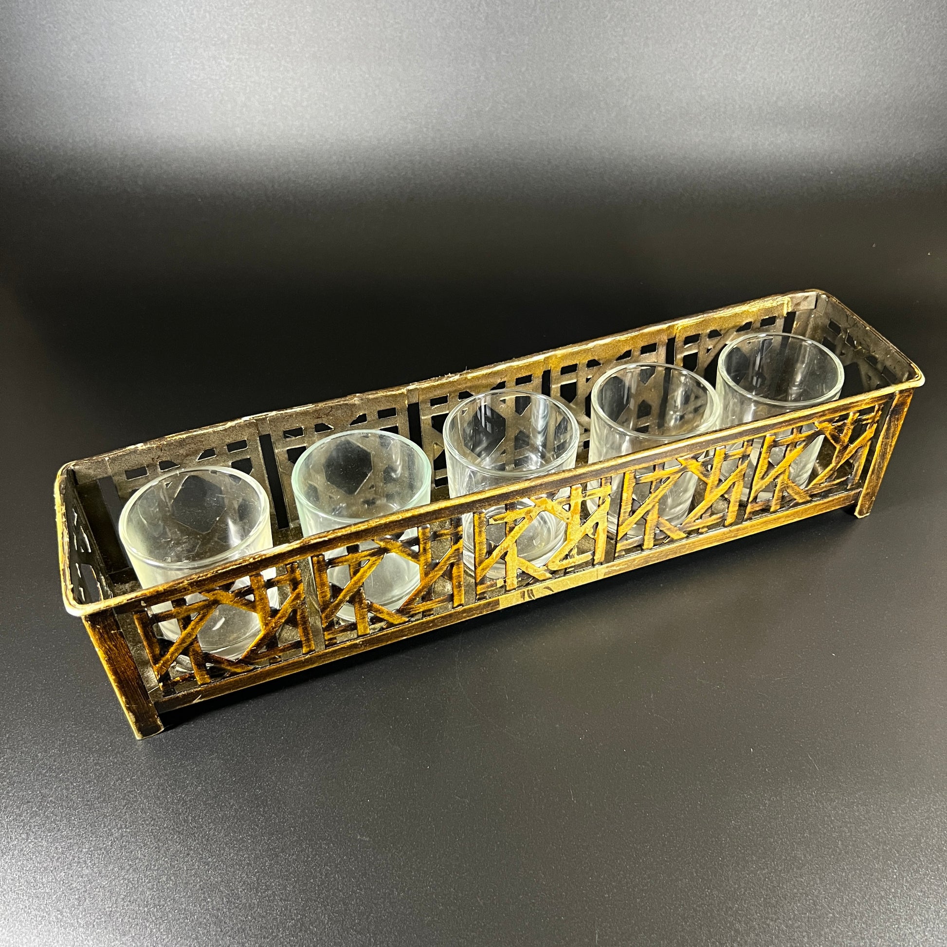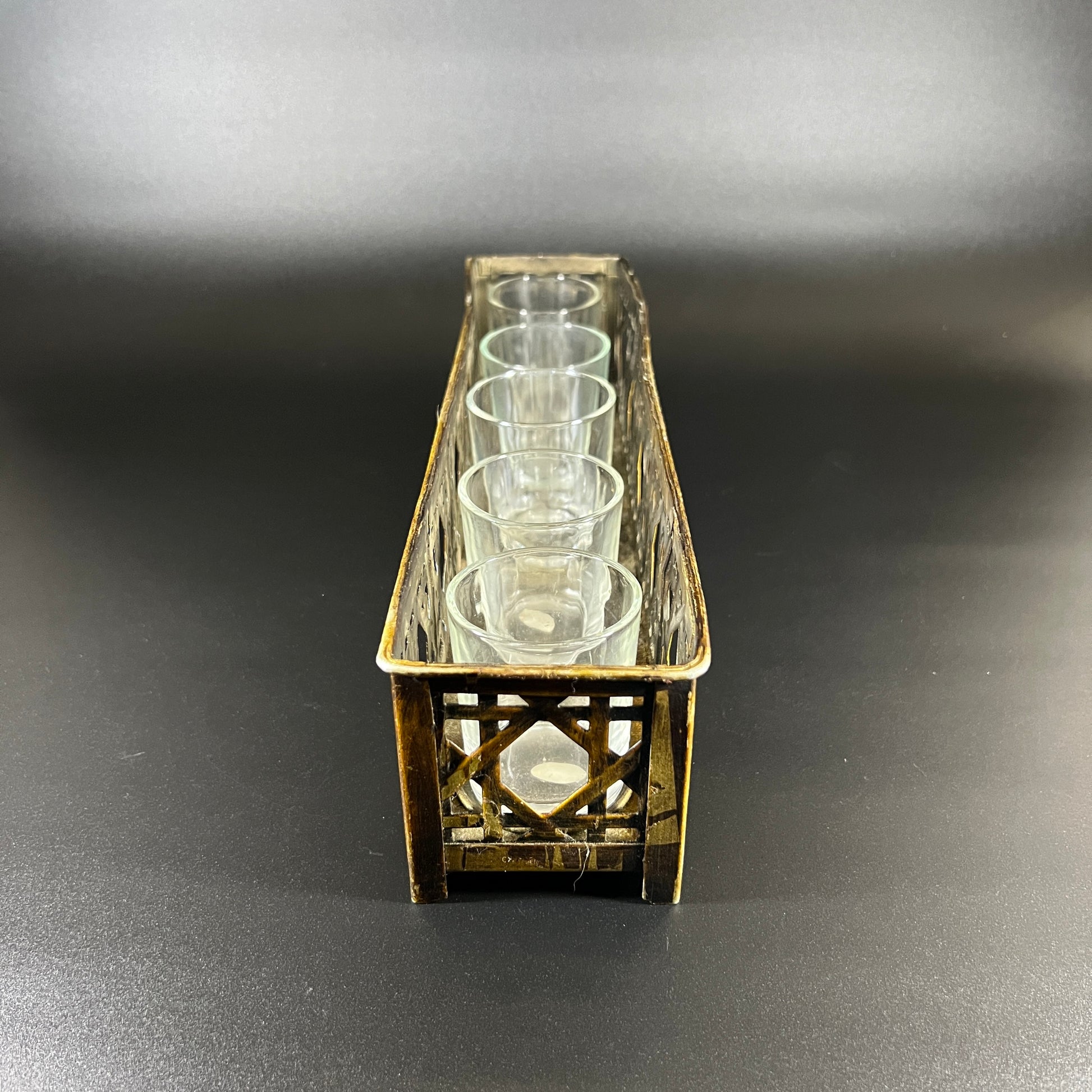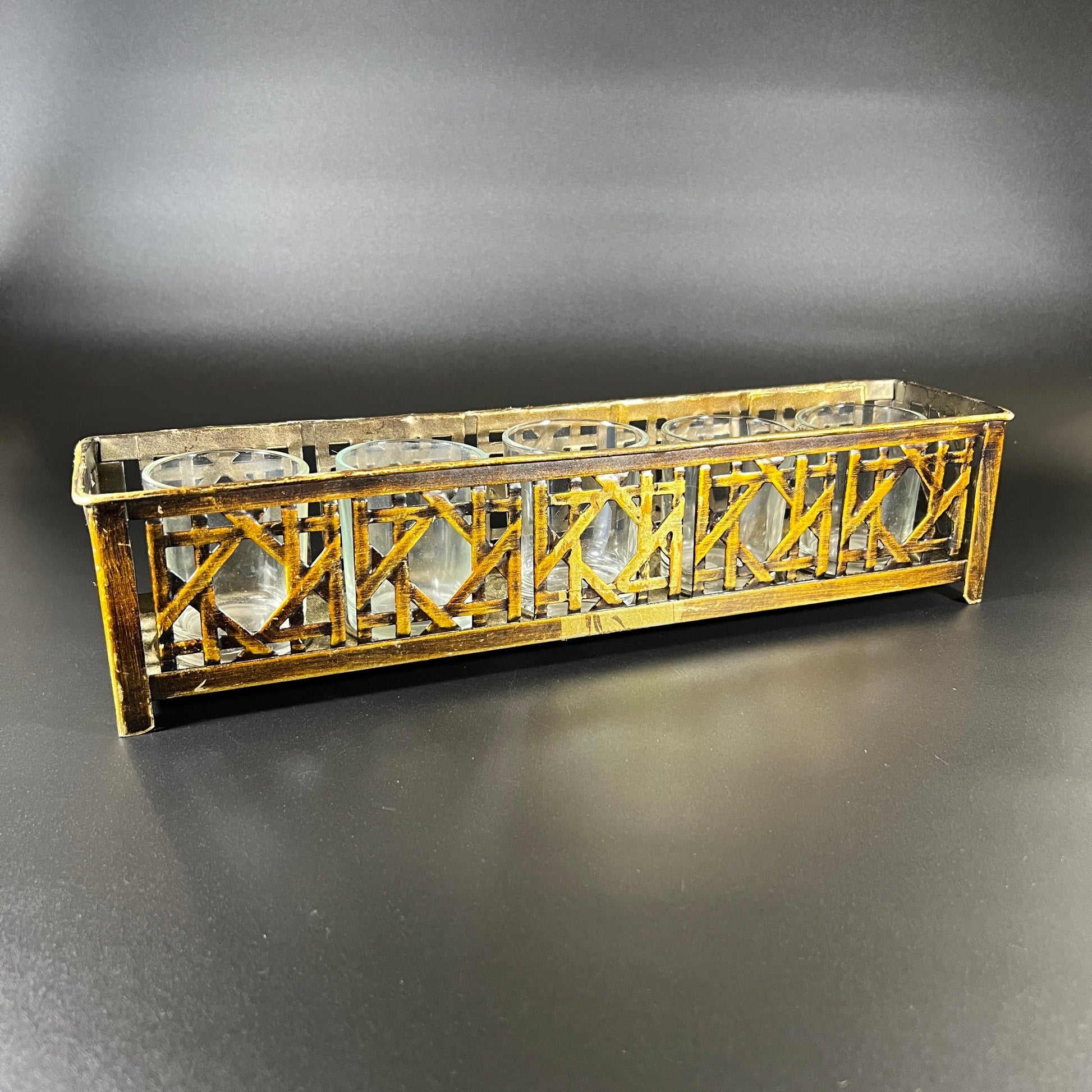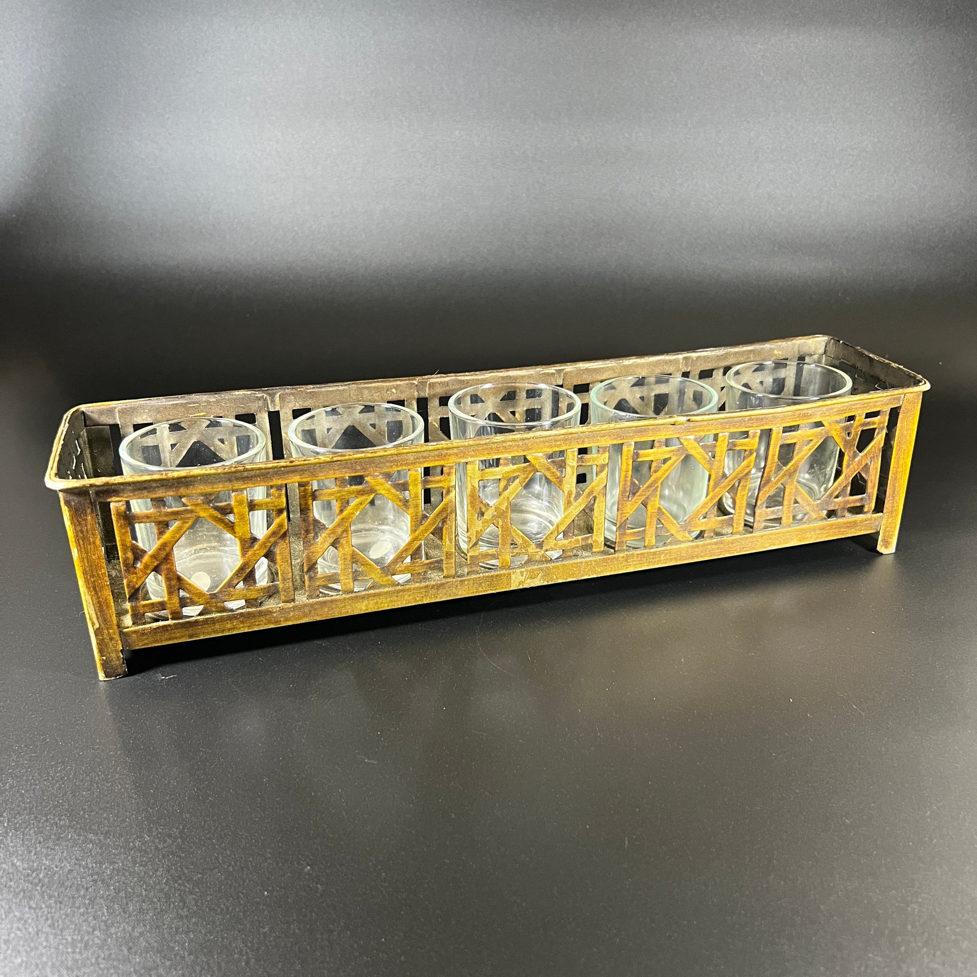 Rustic Gold Handle Holder with 5 Glass Tea Light Candle Holders. This vintage piece is in good condition, showing some signs of aging that add to its character. The holder measures approximately 14" W x 3.5" H x 3" D. Each tea light holder measures about 2" in diameter and stands 2.5" tall.