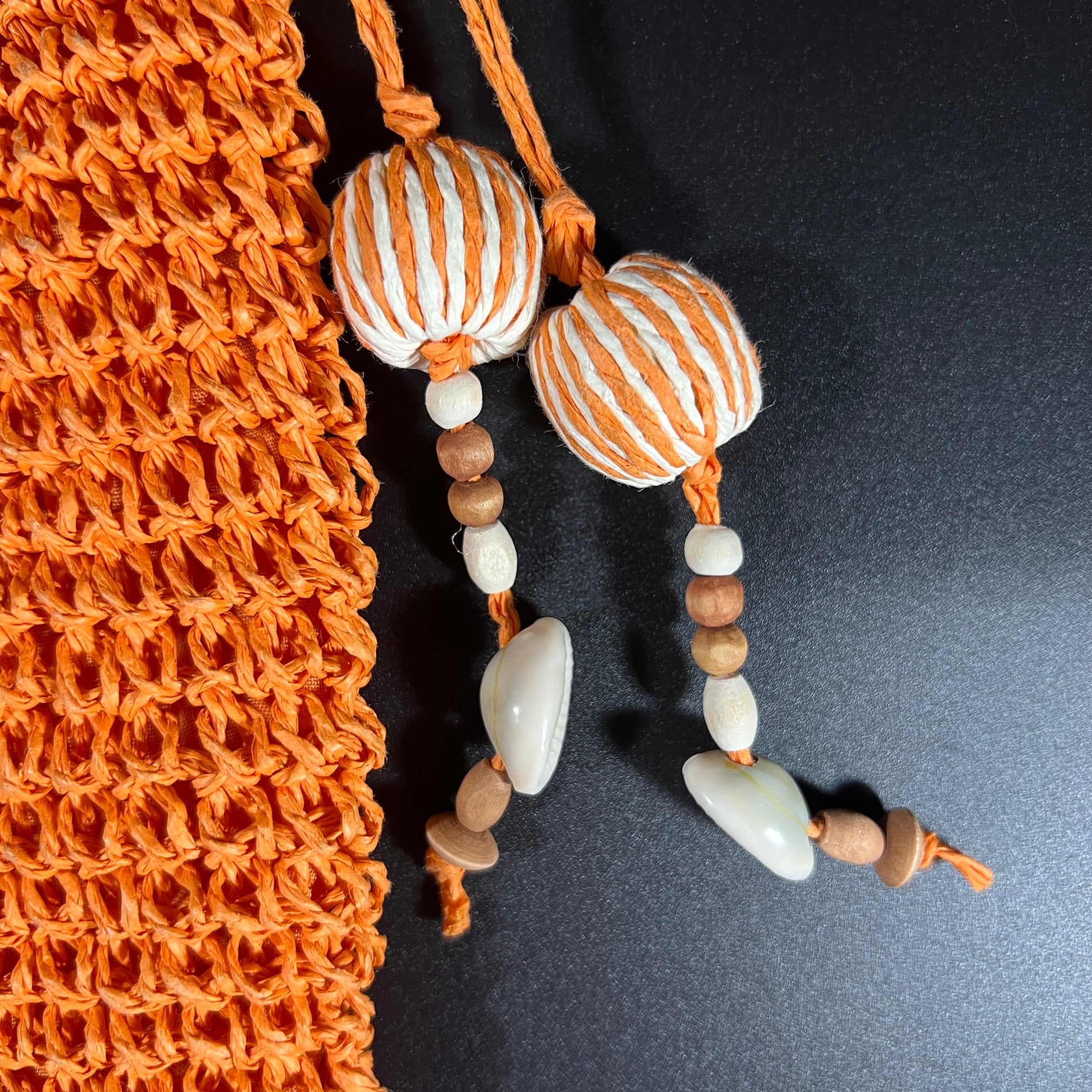 This vibrant orange crochet shoulder bag, beautifully accented with beads and seashells, is a standout vintage accessory that exudes tropical charm. In excellent condition, it shows no signs of wear, preserving its lively and unique appeal. Please refer to the photos for a closer look at its stunning details. The handbag measures approximately 9" H (without strap) x 8" W x 2" D, offering a perfect balance of style and practicality.