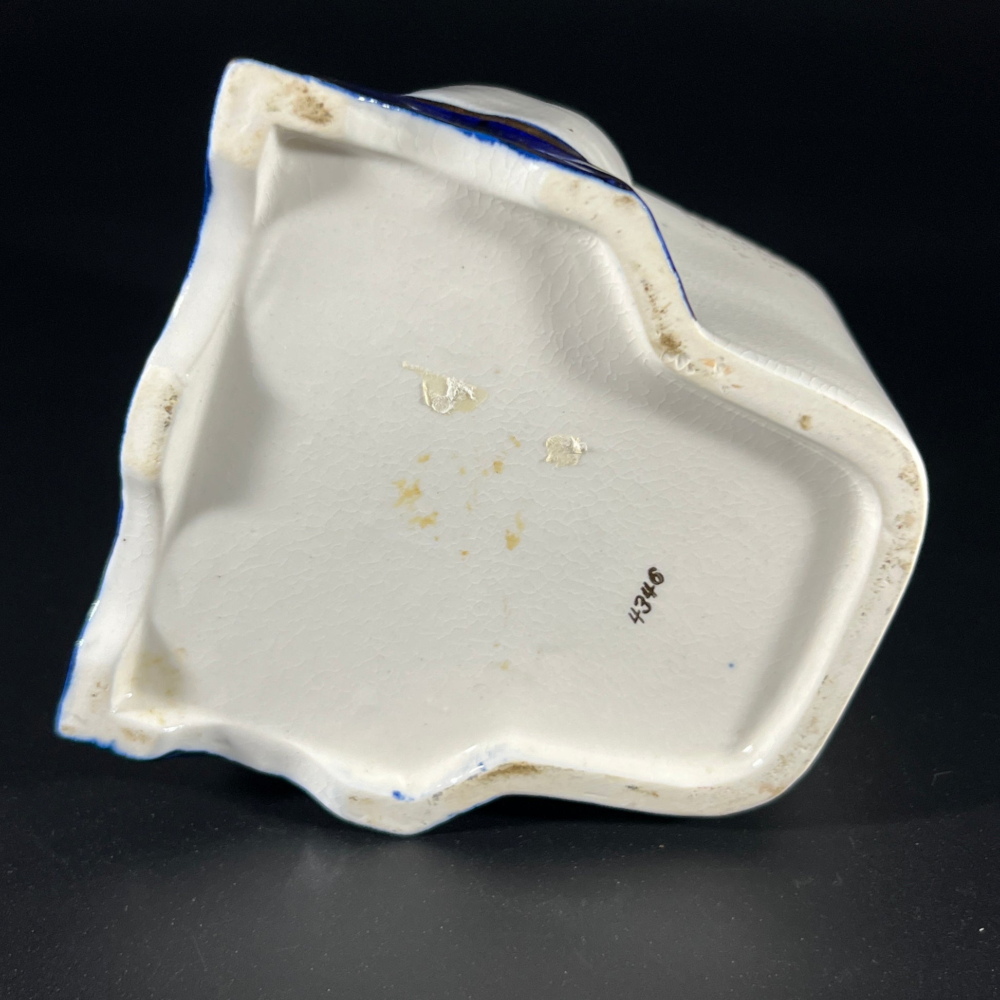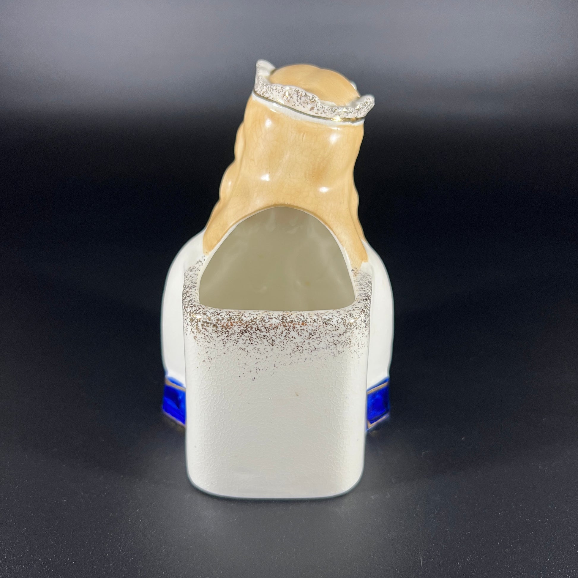 This vintage Shafford porcelain planter features a stunning depiction of the Blessed Madonna in prayer. With her head bowed and hands clasped in devotion, she is adorned in a white robe and crown, both highlighted with elegant gold accents. The base of the planter is a rich dark blue, accented with gold scroll designs. The planter itself is located at the back of the piece and has a square shape. It is in good vintage condition without chips or cracks, but does have some crazing which is consistent with age.