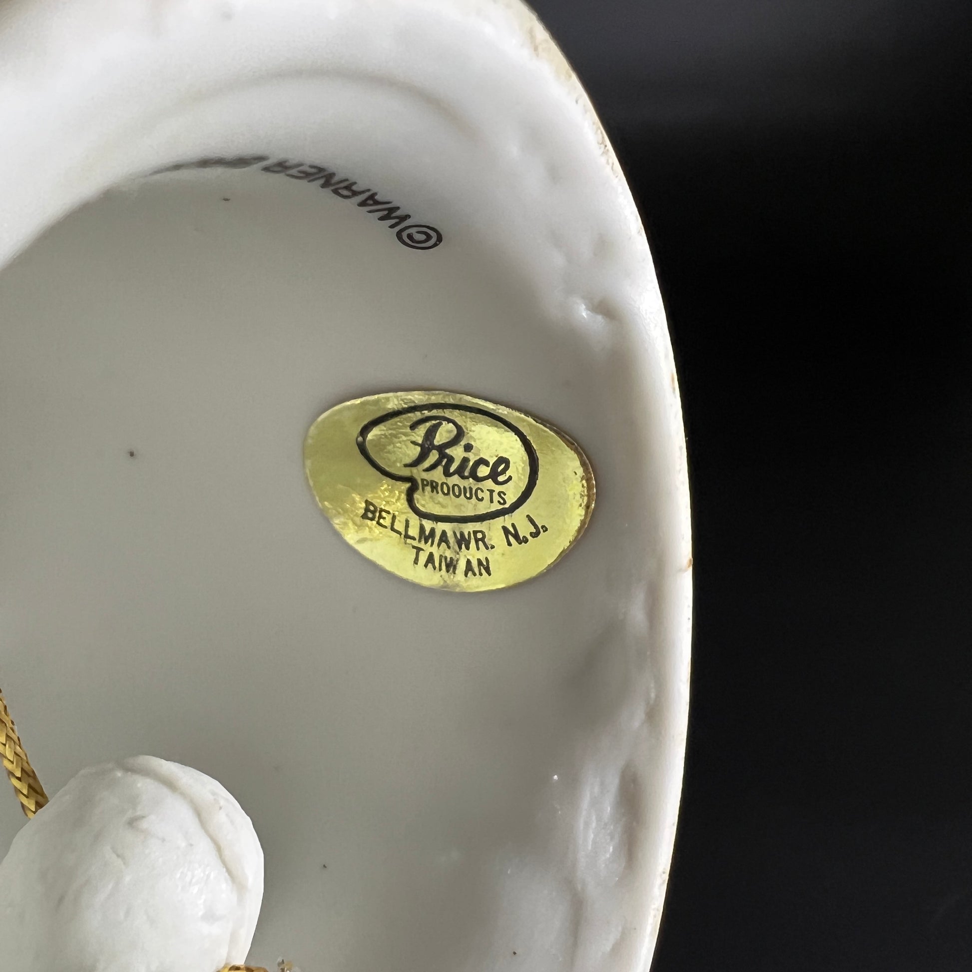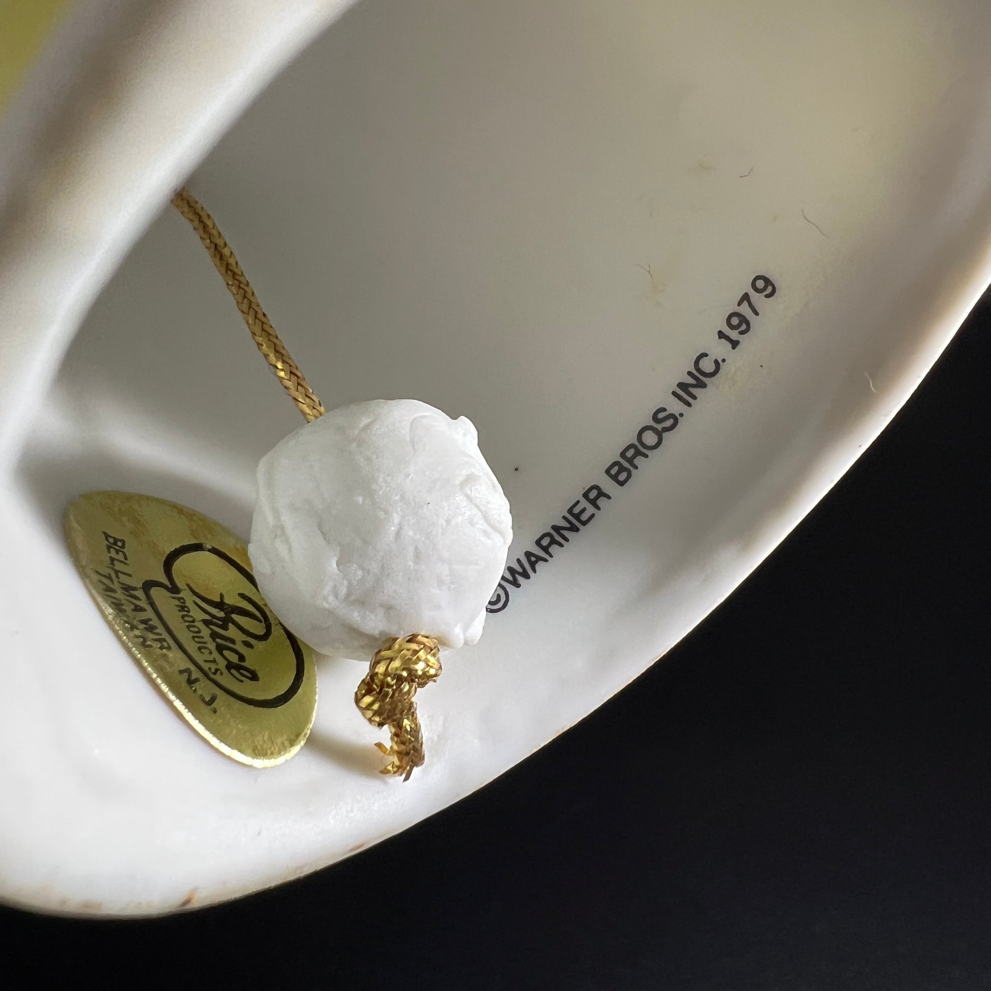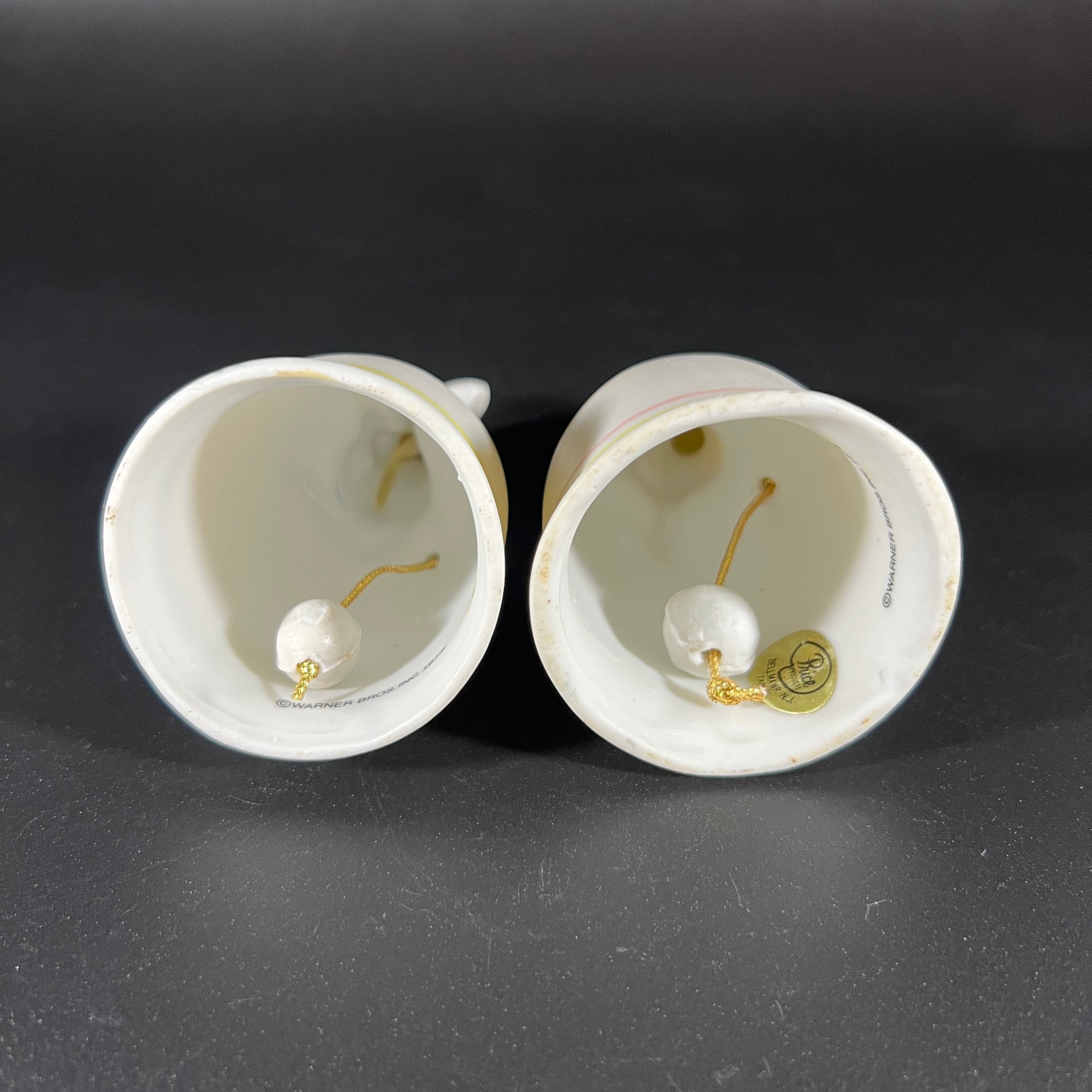 This 1979 vintage Tweety Bird and Sylvester ceramic bell set is a charming collectible for any Looney Tunes or Warner Brothers fan. Made by Price Products for Warner Brothers, each bell features detailed character designs and vibrant colors that capture the playful spirit of the classic cartoon duo. Both bells are in great vintage condition and measure approximately 4.25 inches high with a 2.25-inch diameter. A fun and nostalgic addition to any animation or vintage memorabilia collection.