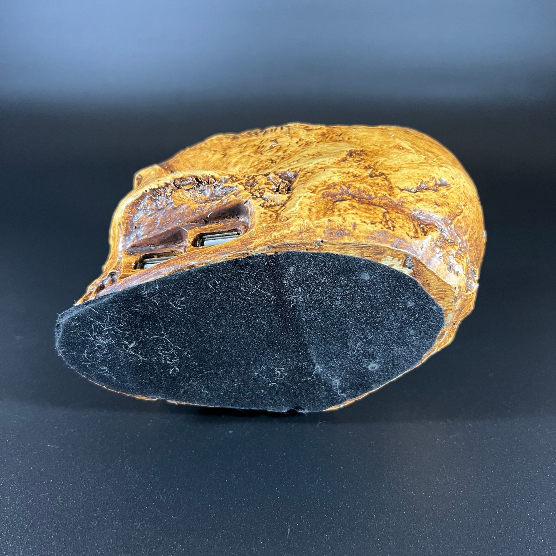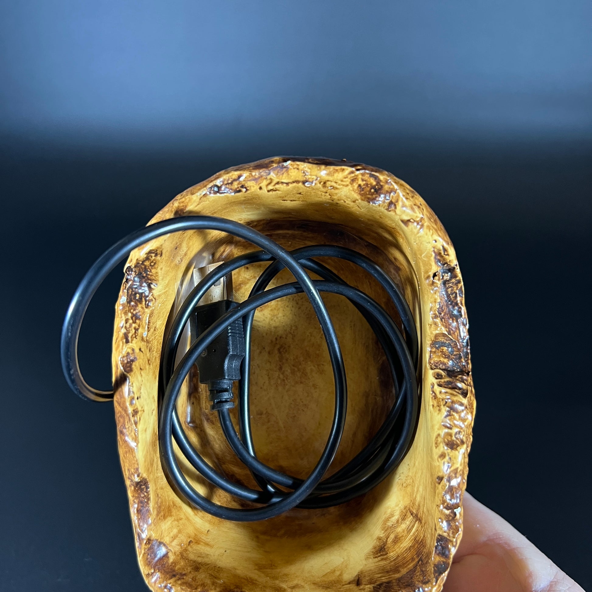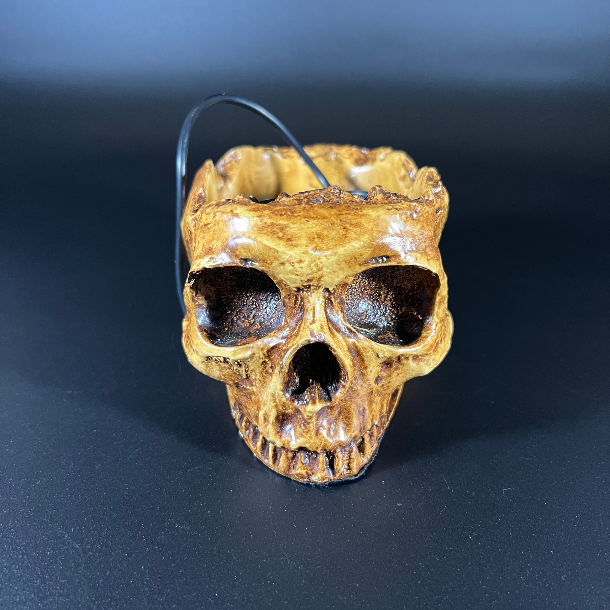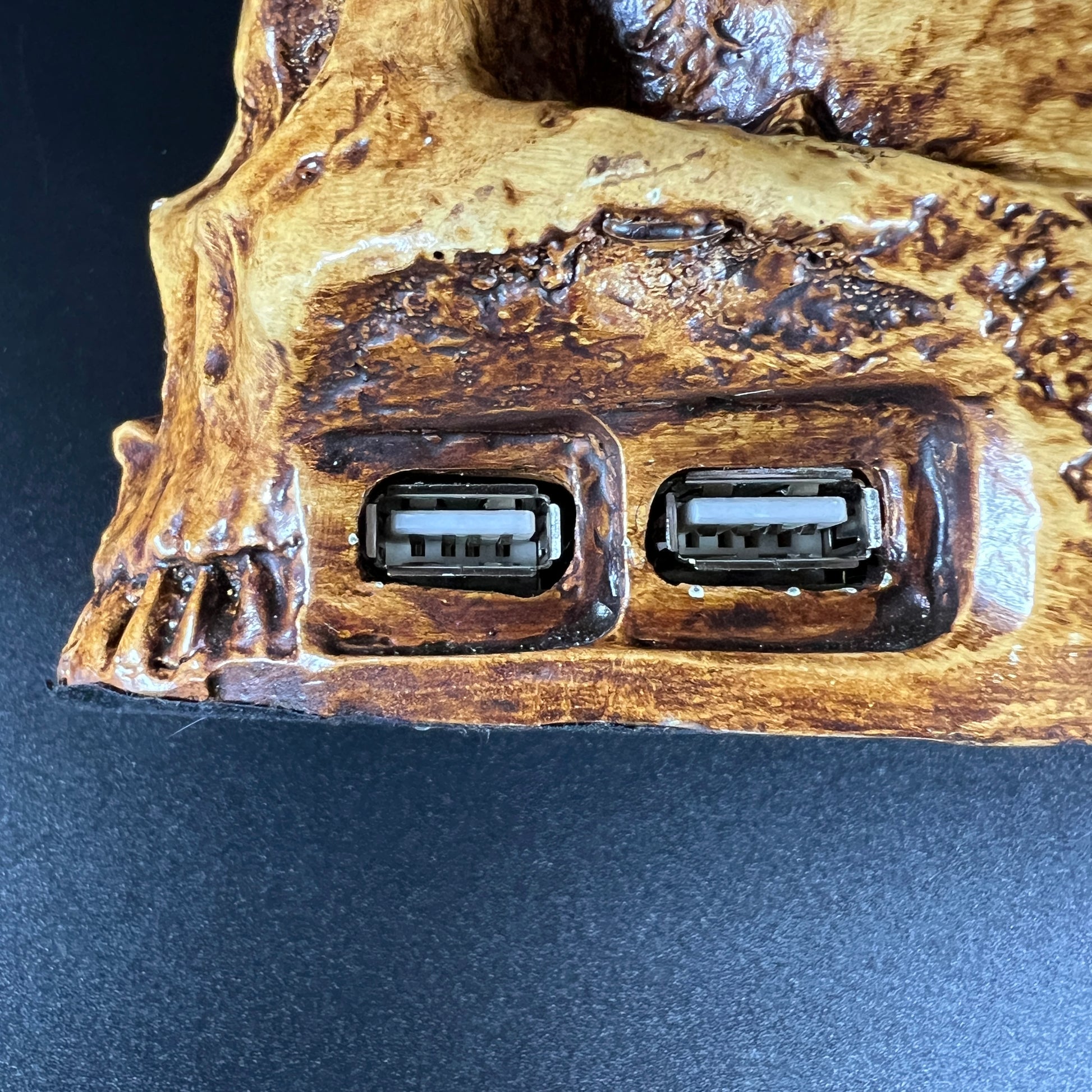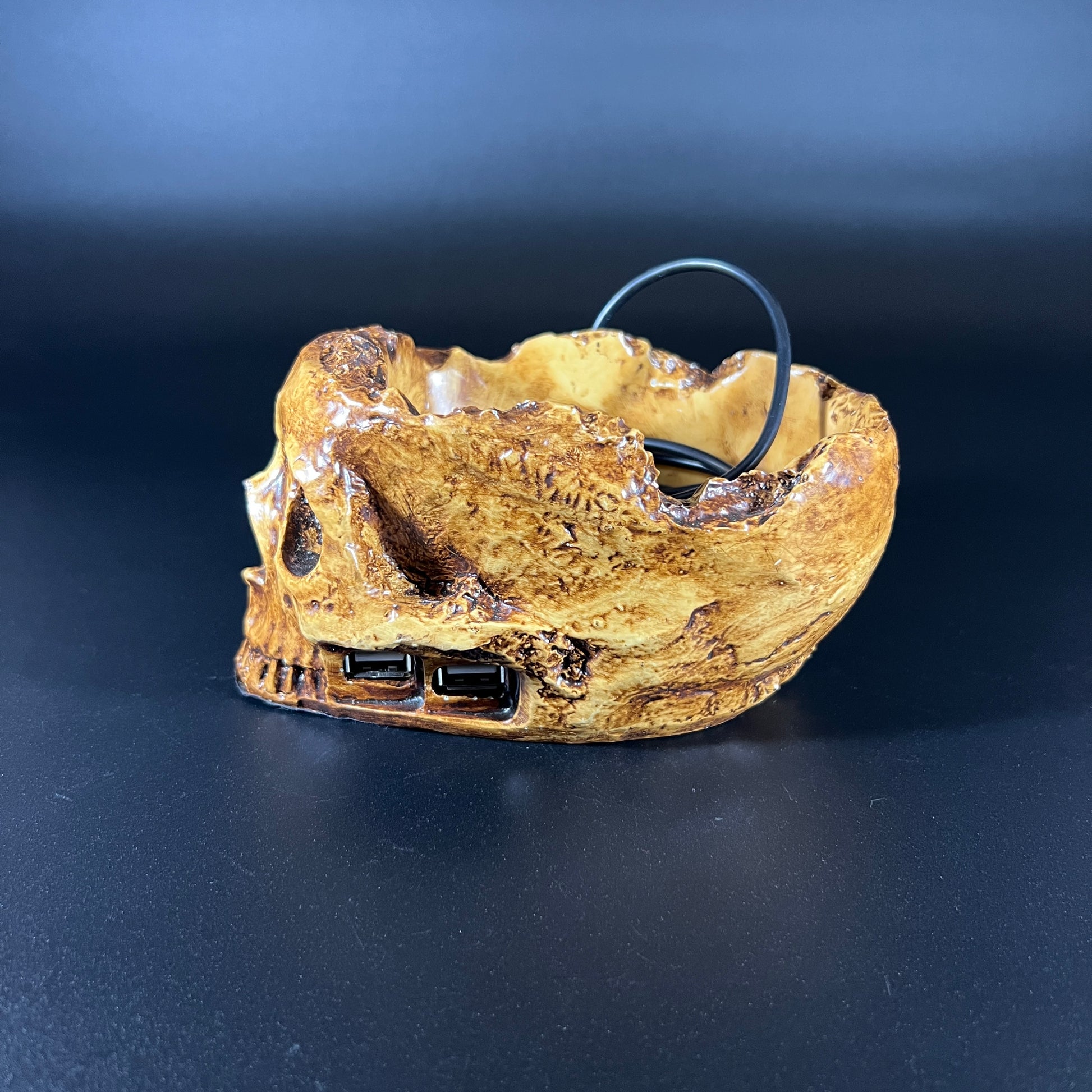 This Hi-Speed USB 2.0 Hub is designed in the shape of a realistic skull, adding a unique and edgy touch to your workspace. It features a convenient storage compartment at the top and four fast USB ports (unpowered)—two on each side. Made of durable plastic resin, it is in good pre-owned condition. The hub measures approximately 3.5" H x 4" W x 6" D, making it both functional and a fun conversation piece.