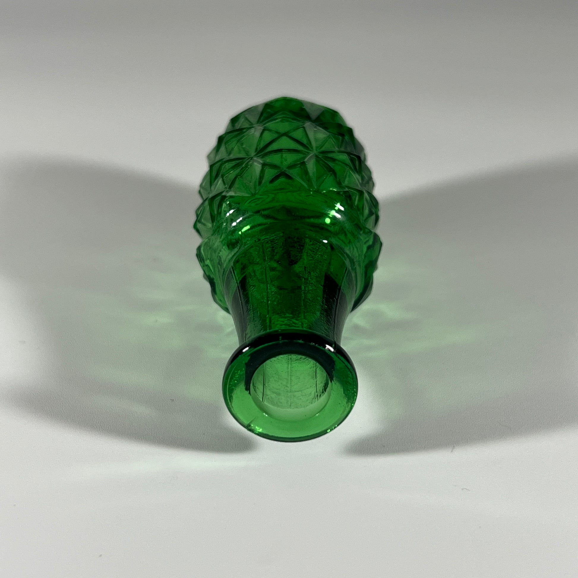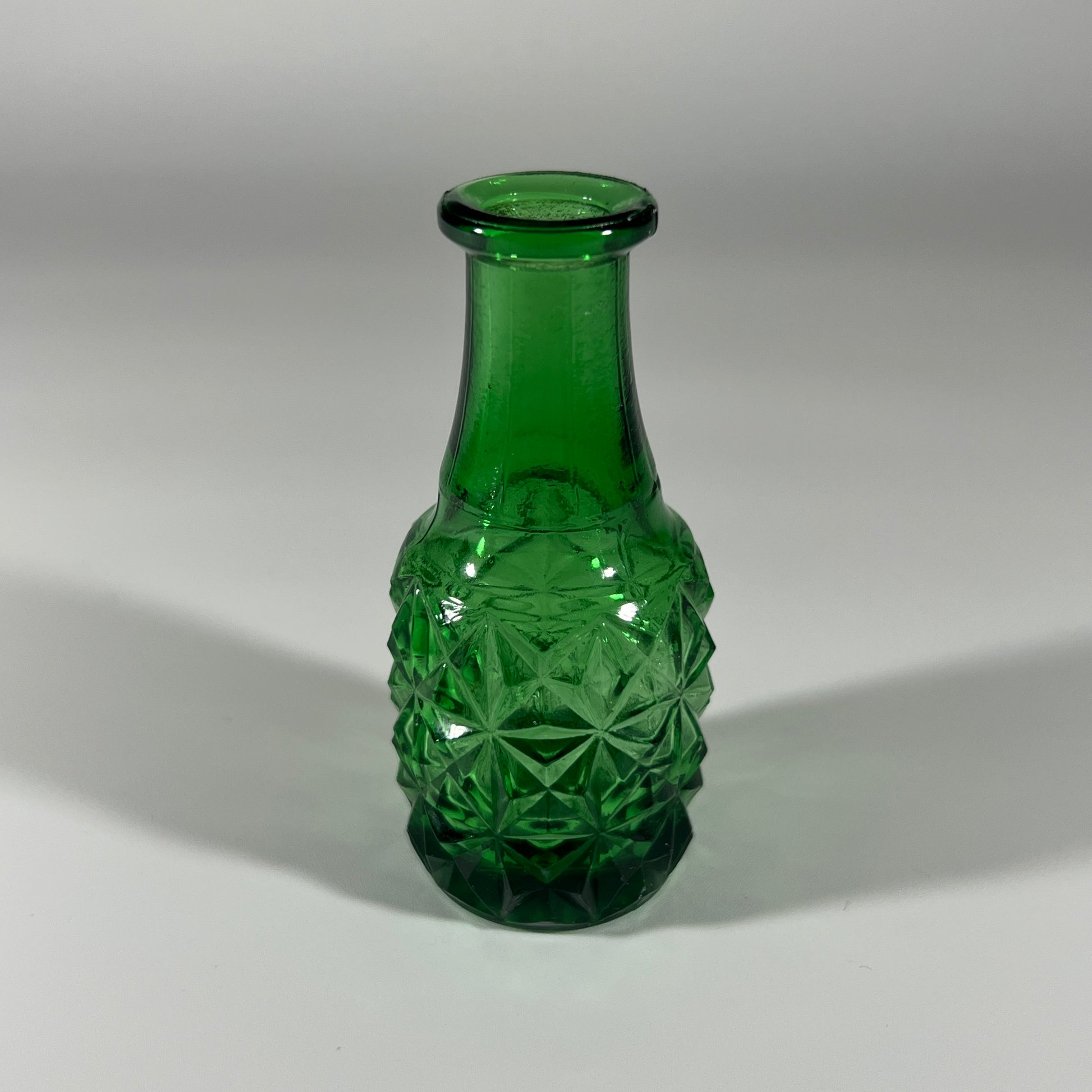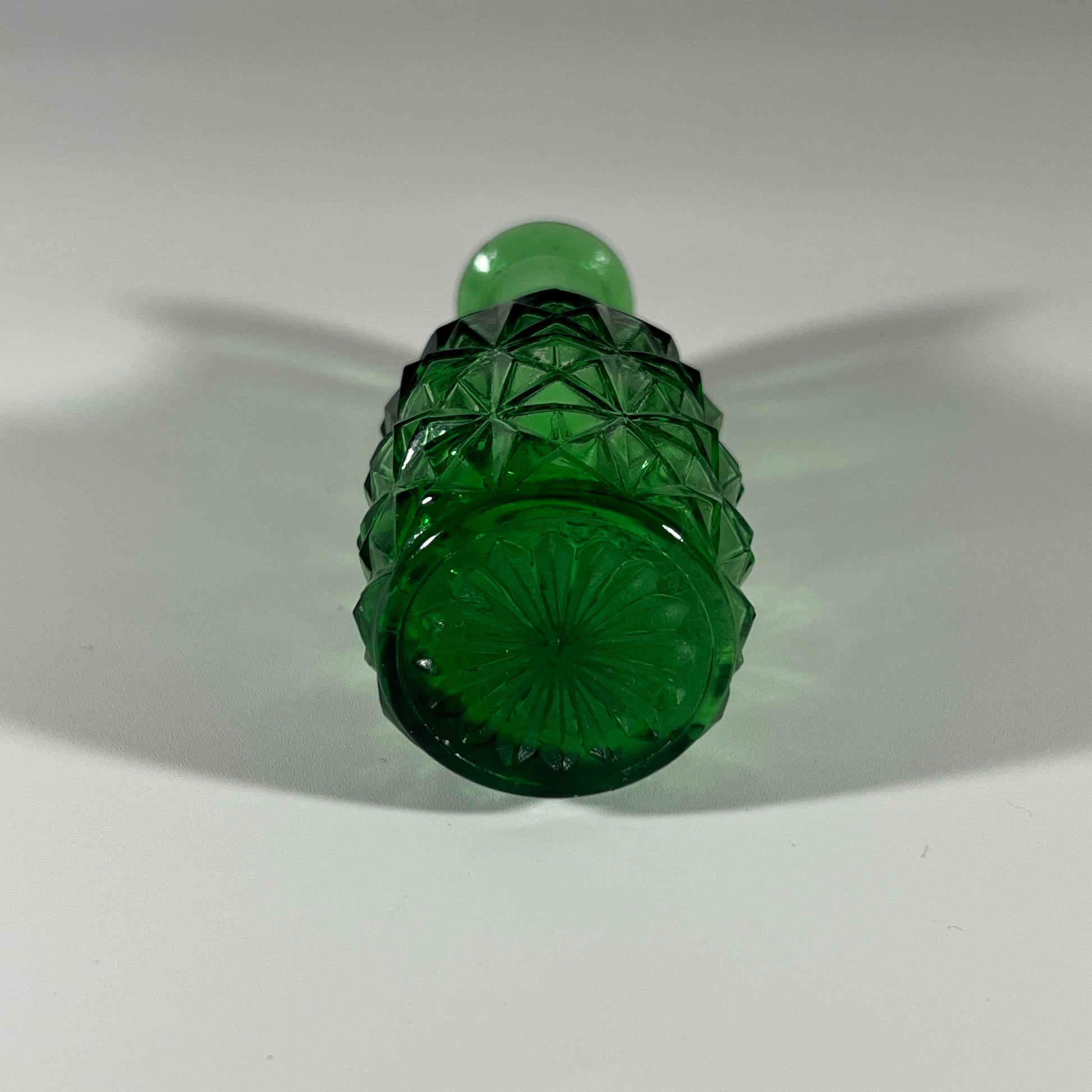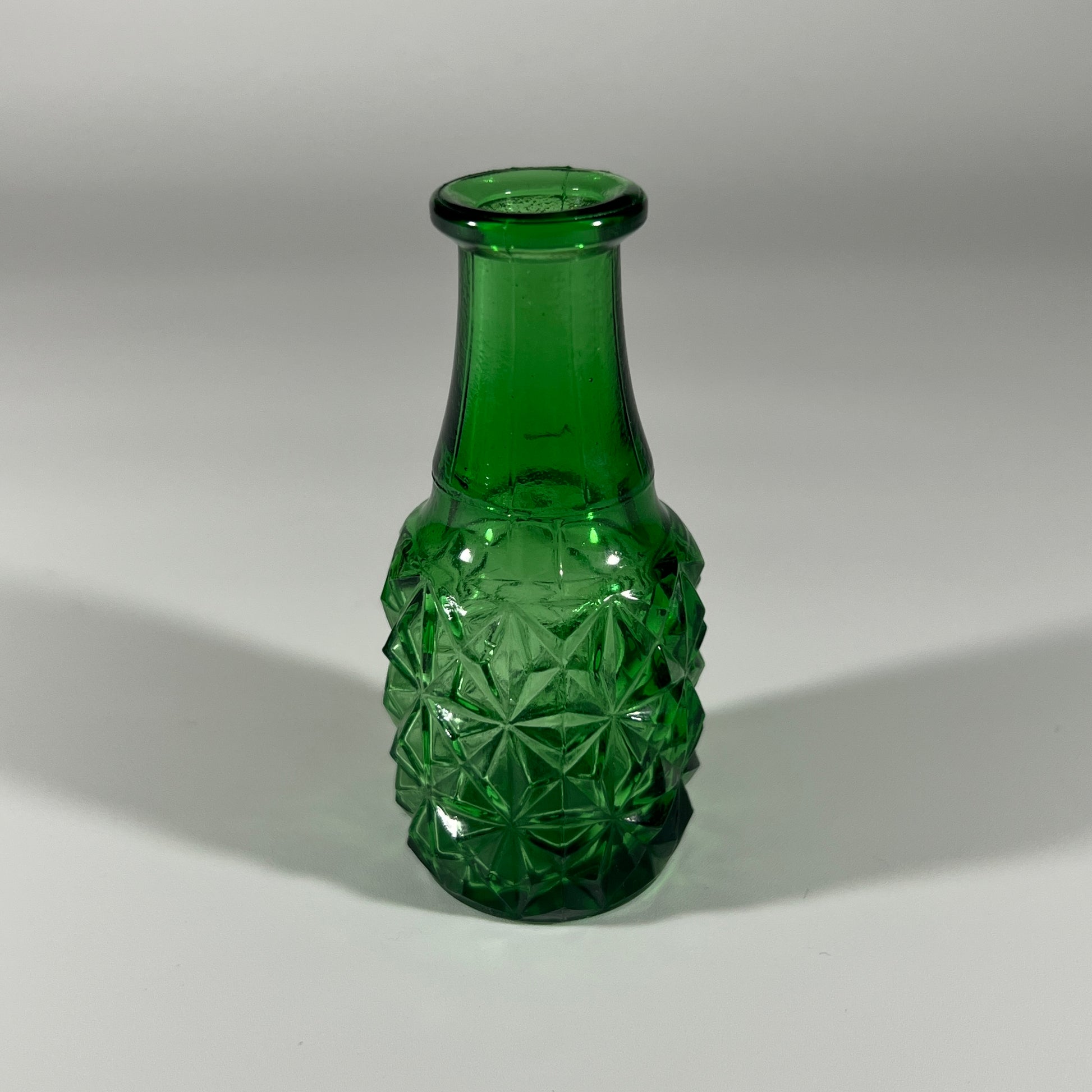 Beautiful emerald green glass bottle featuring a diamond cut pattern with a striking sunburst design on the bottom. Possibly used for perfume or scented oils, and also makes a charming small bud vase. In nice vintage condition with age-appropriate wear.