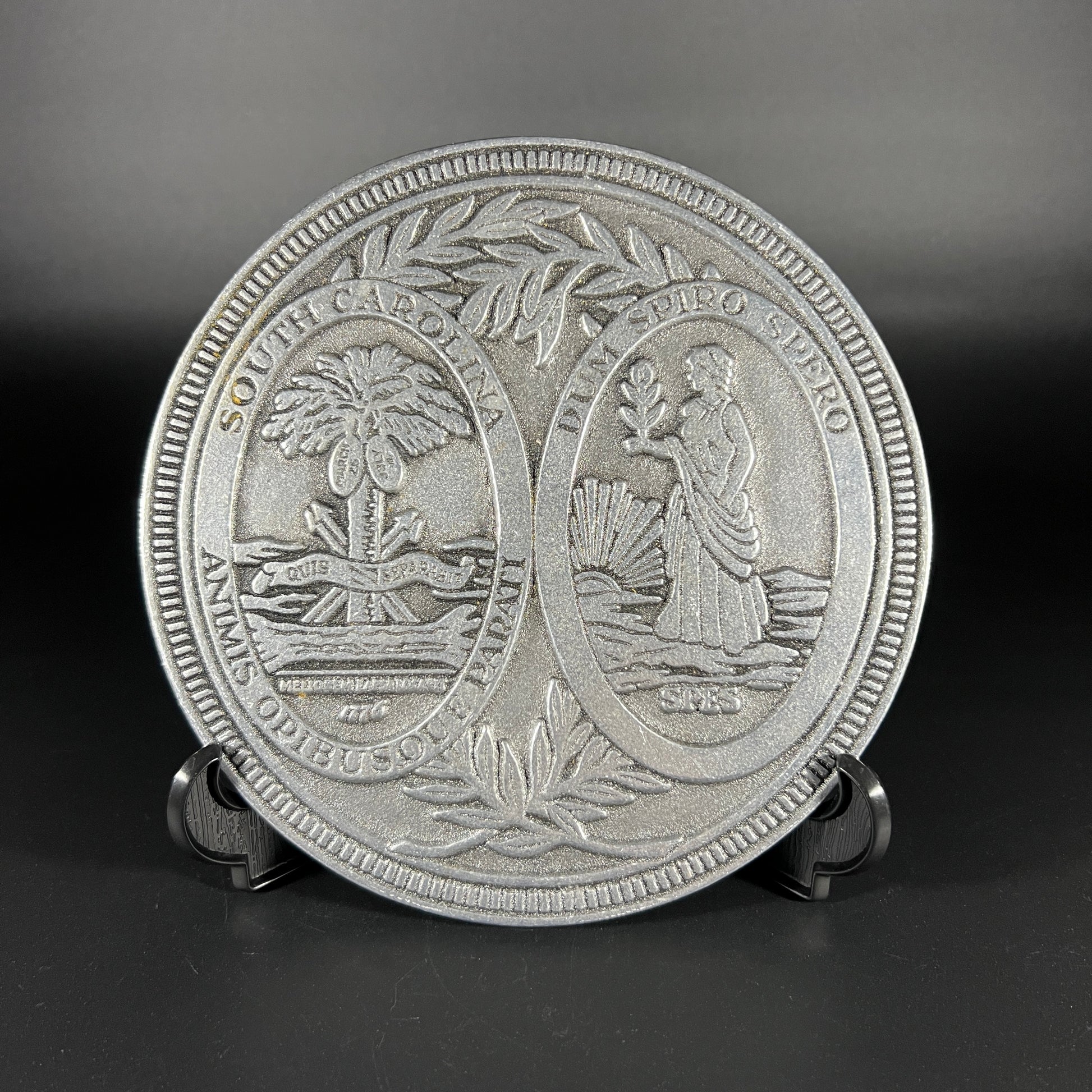 This charming kitchen trivet showcases the state seal of South Carolina, making it a unique and meaningful addition to your home decor. Crafted with attention to detail, it’s both a functional kitchen accessory and a lovely tribute to the Palmetto State. In excellent pre-owned condition, it’s perfect for protecting surfaces while adding a touch of state pride to your kitchen. The trivet measures approximately 1" H x 7" in diameter, offering a practical yet stylish way to display your love for South Carolina.