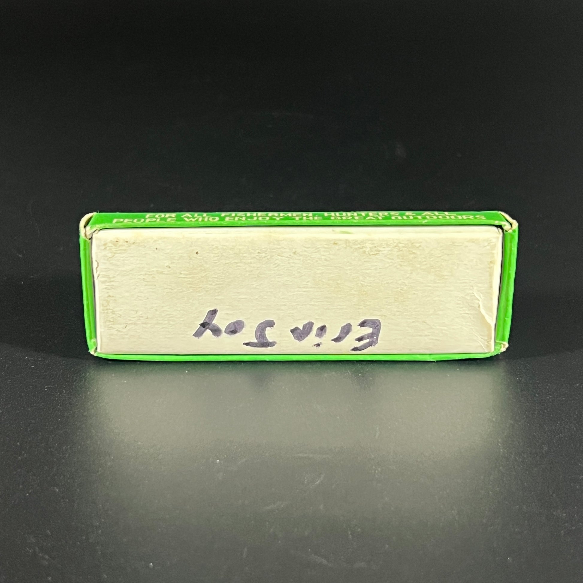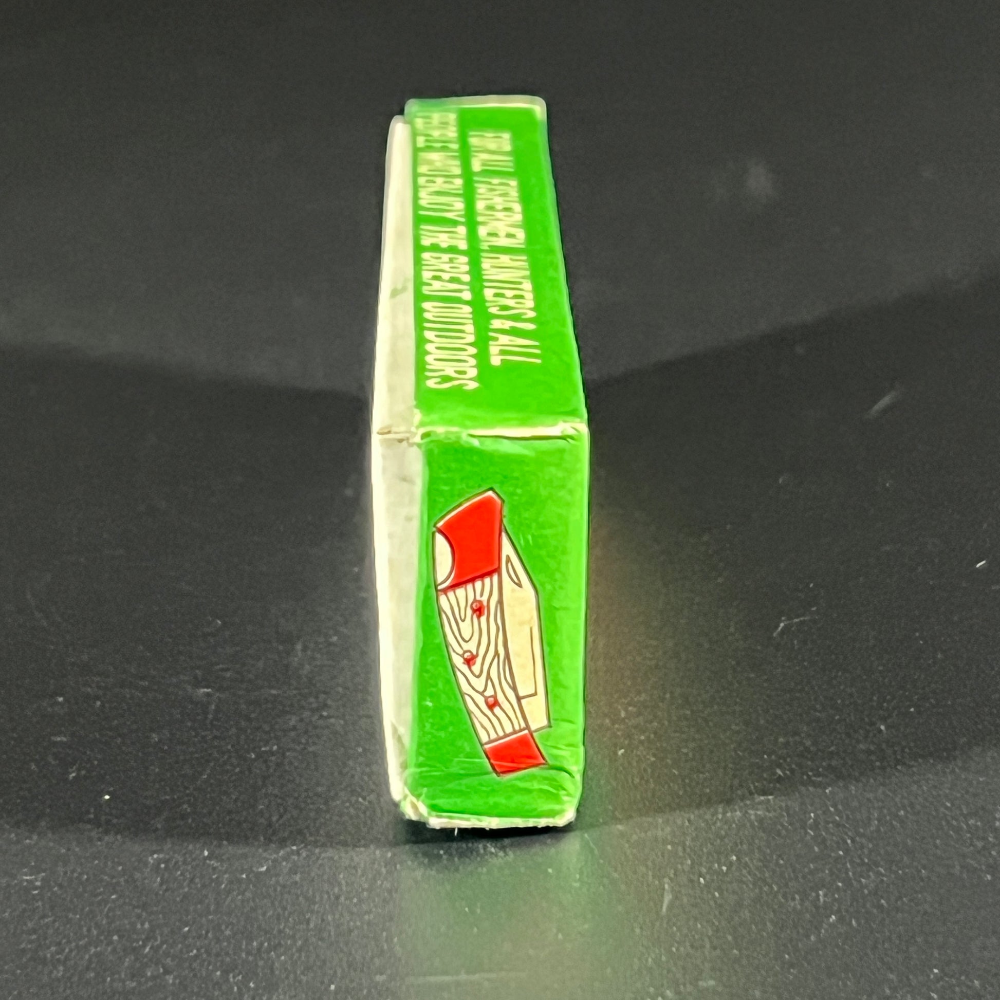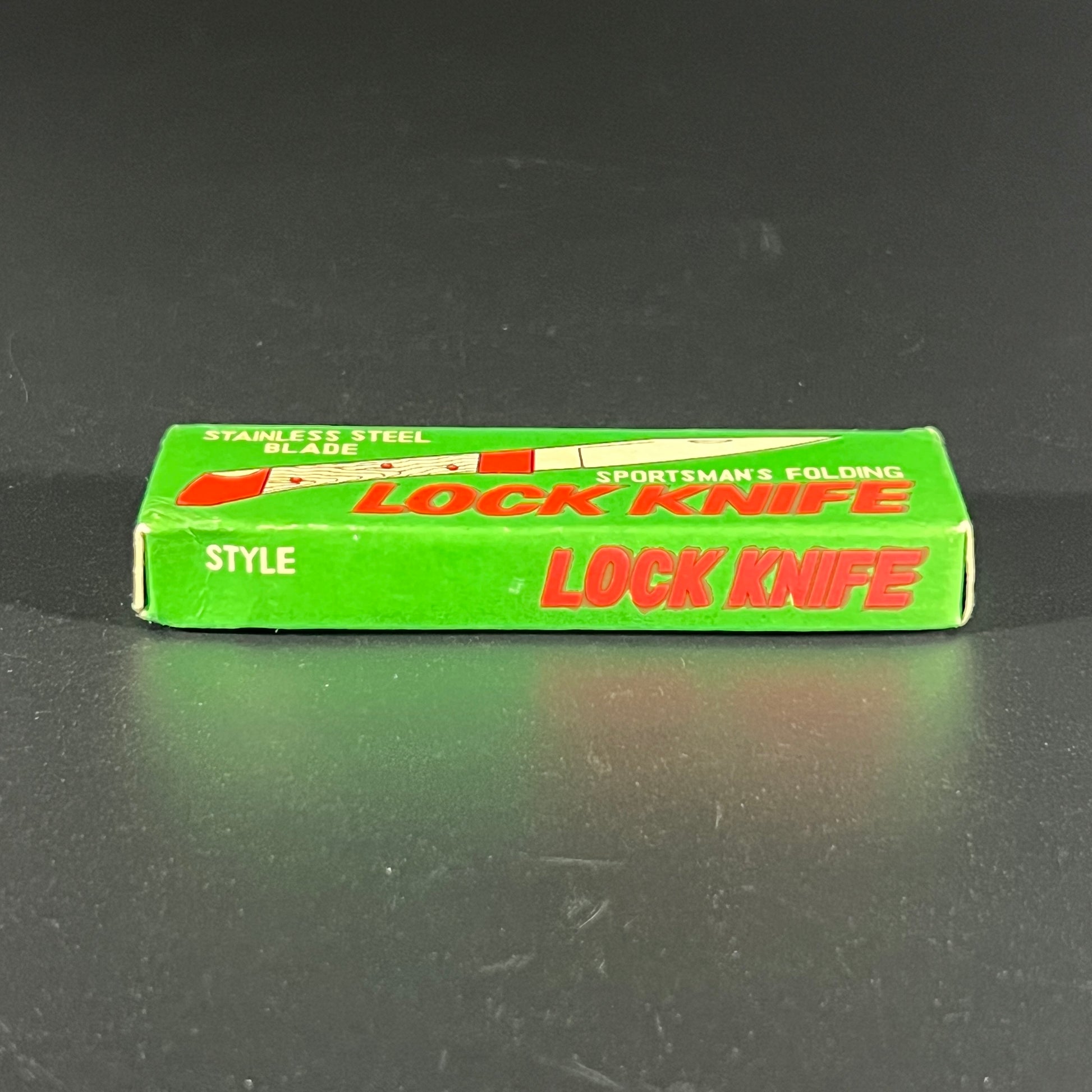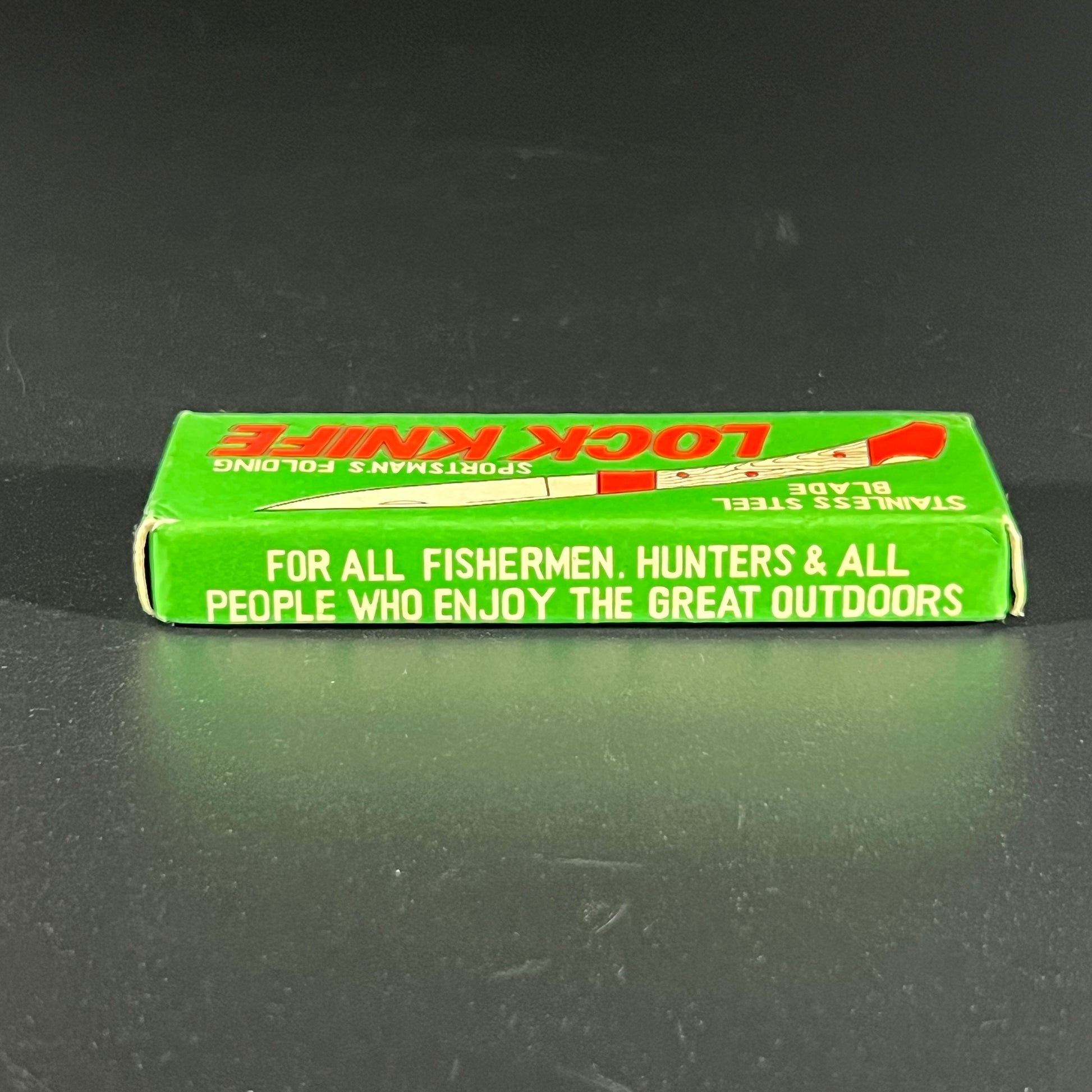 Vintage sportsman knife featuring a locking blade, complete with its original box. Both the knife and box are in good vintage condition, with the box retaining its vibrant colors and classic design.