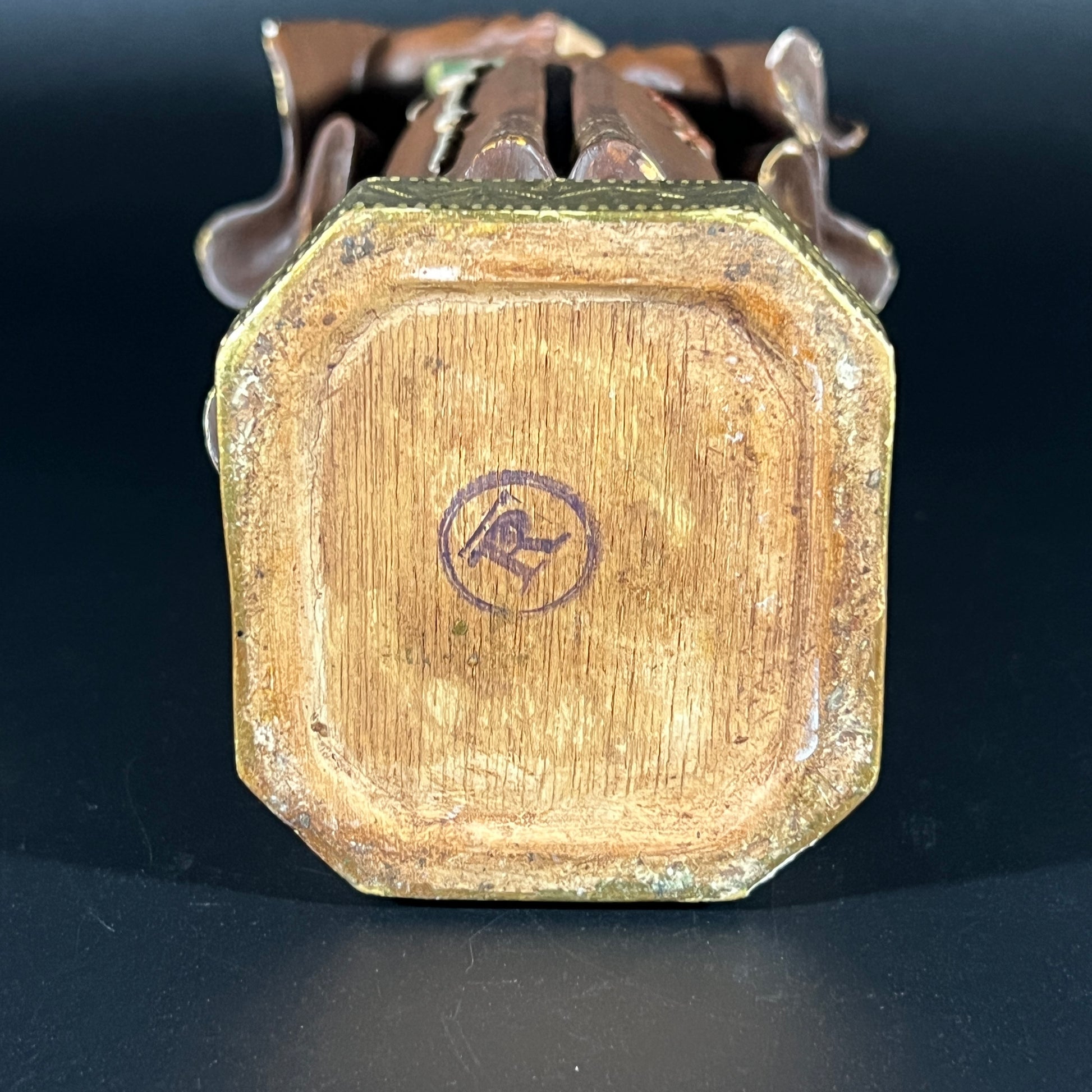 This vintage statue of St. Francis of Assisi, made in Spain, features a wooden base. St. Francis, the patron saint of animals, is also one of the few saints to have experienced the stigmata, which is depicted here with the holes in his hands. The statue is in good vintage condition, showing typical wear for its age, including small chips in the paint. Please refer to the photos for further details. The item measures approximately 13" H x 5.25" W x 4" D.