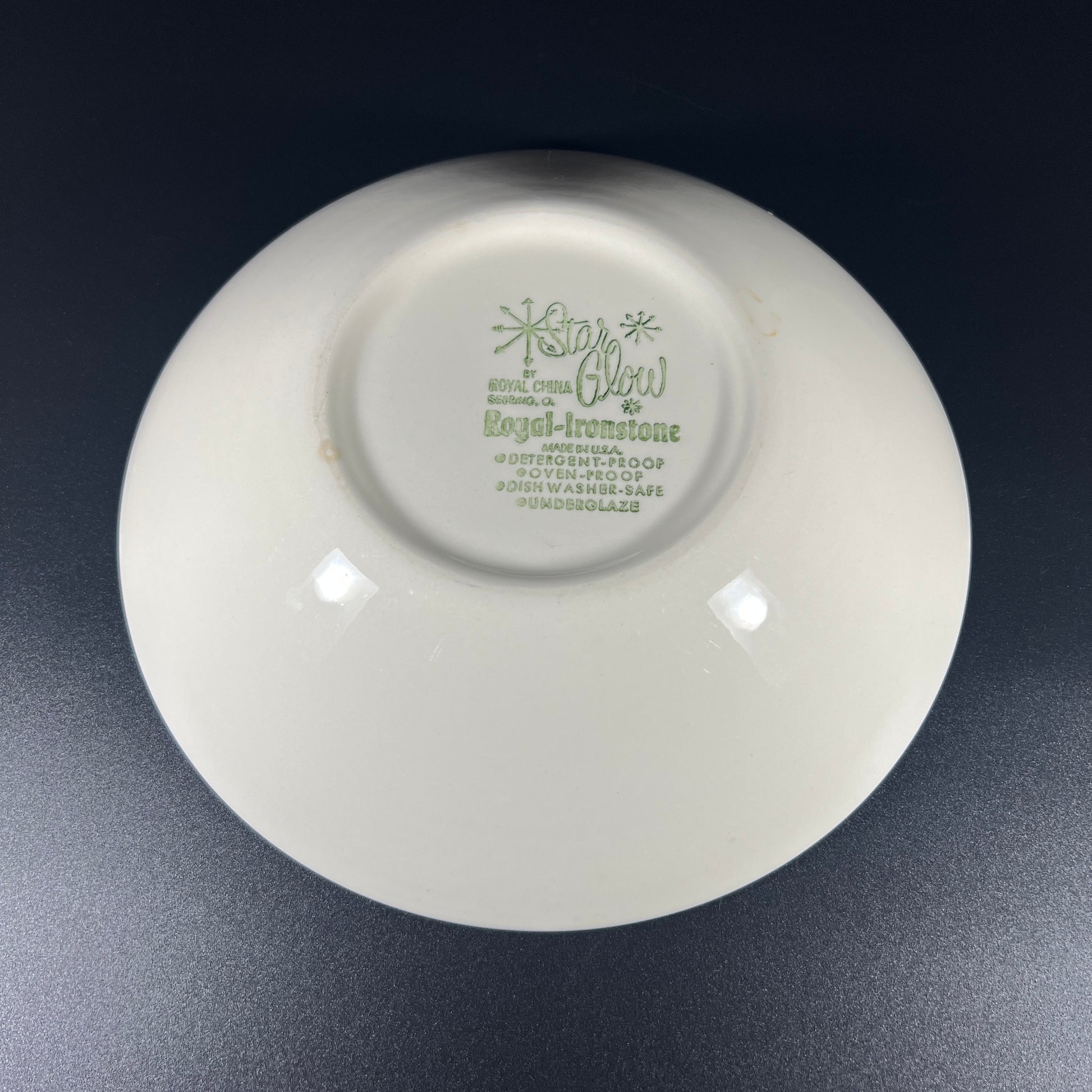This vintage Star Glow serving bowl by Royal China is a stunning piece from the mid-century modern era. Featuring a crisp white background adorned with gold starbursts, it embodies the playful, atomic age design aesthetic. The bowl also boasts a cool retro stamp on the bottom, adding to its nostalgic appeal. In excellent vintage condition, it is both functional and stylish. The bowl measures approximately 2" in height and 9" in diameter, making it a perfect addition to any retro or mid-century collection.