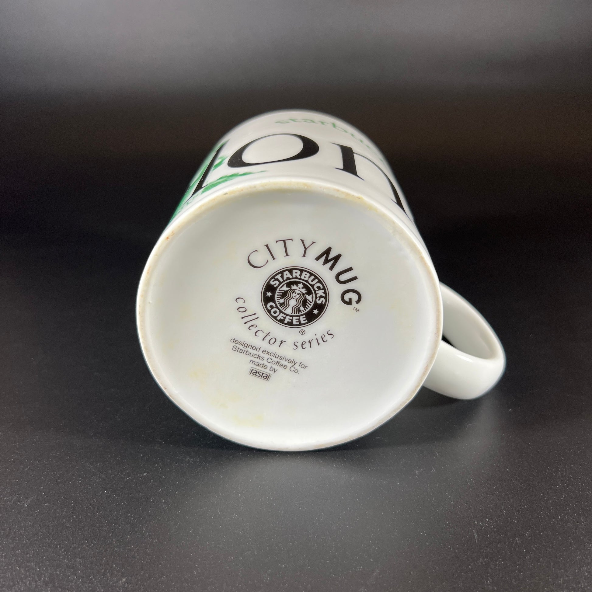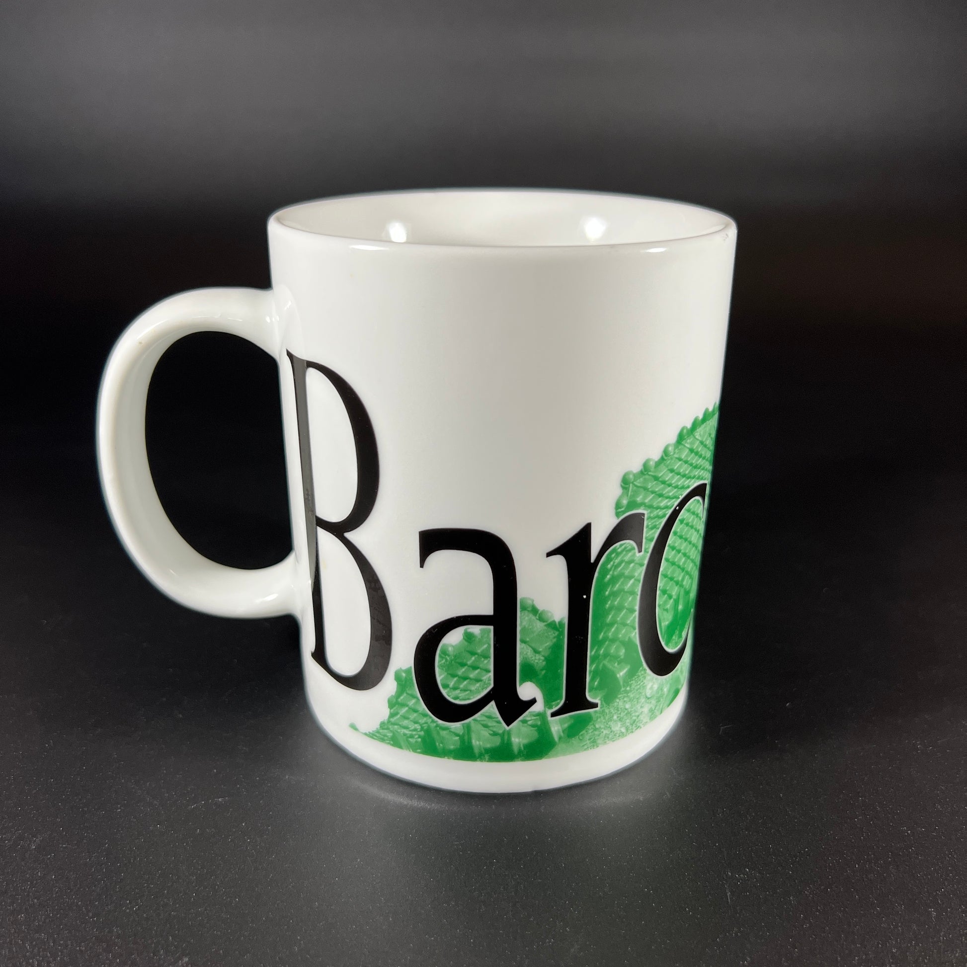 This Starbucks Barcelona Ceramic City Mug from the Collector Series (2002) is in good pre-owned condition. It measures approximately 4.5" in height, 5.25" in width (including the handle), and 3.5" at the opening.