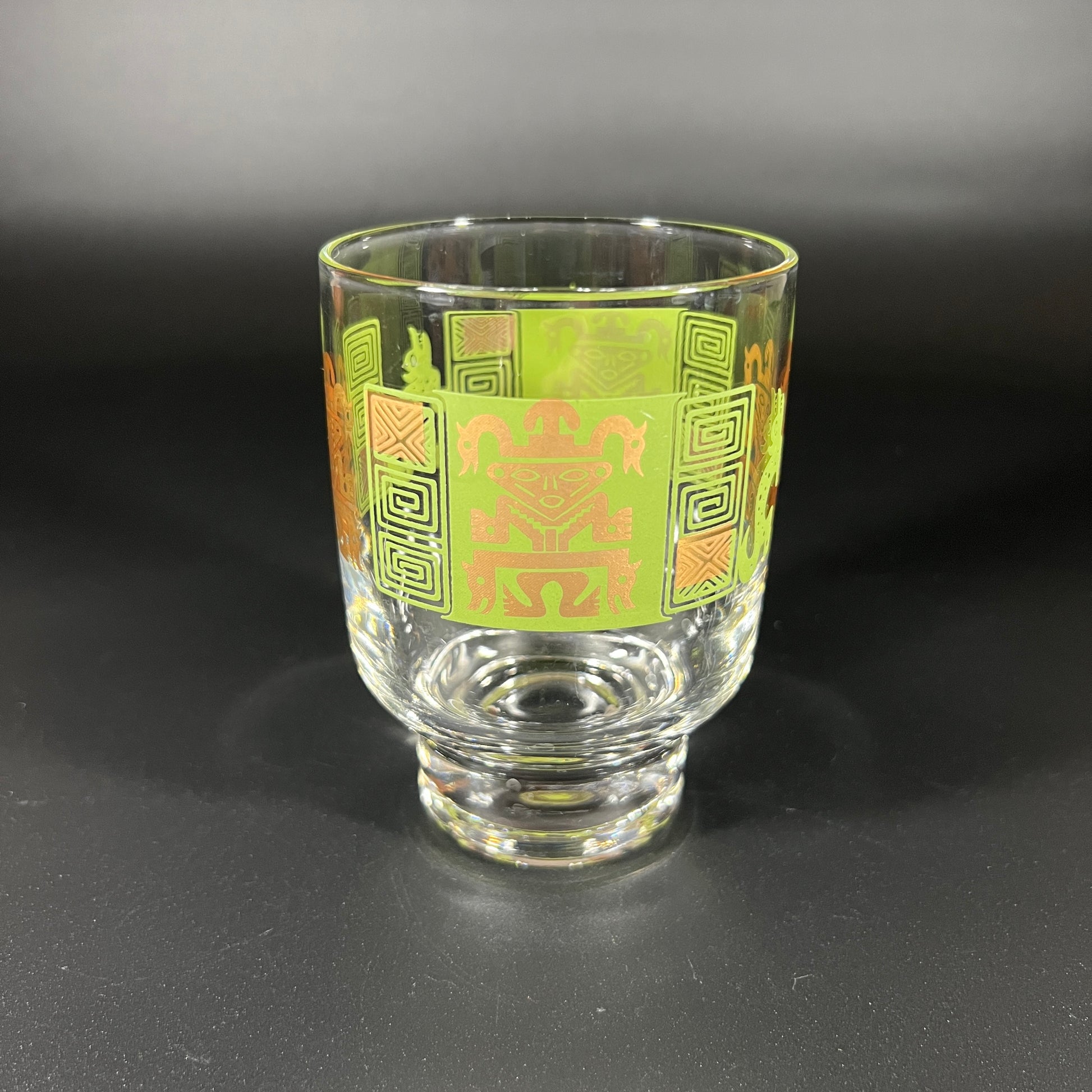 This mid-century modern vintage Stockholm Kari-All glassware set by Federal Glass features a chrome-handled cherry caddy and eight footed rocks glasses. The glasses showcase the iconic Andes pattern. The Stockholm set design is by Eva Zeisel. The set is in great vintage condition, with the glasses measuring approximately 4.5 inches in height and 3.25 inches in diameter. The accompanying tray measures 17.75 inches in width, 4.25 inches in height, and 7.25 inches in depth. A stylish and functional set that captures the iconic style of mid-century design!