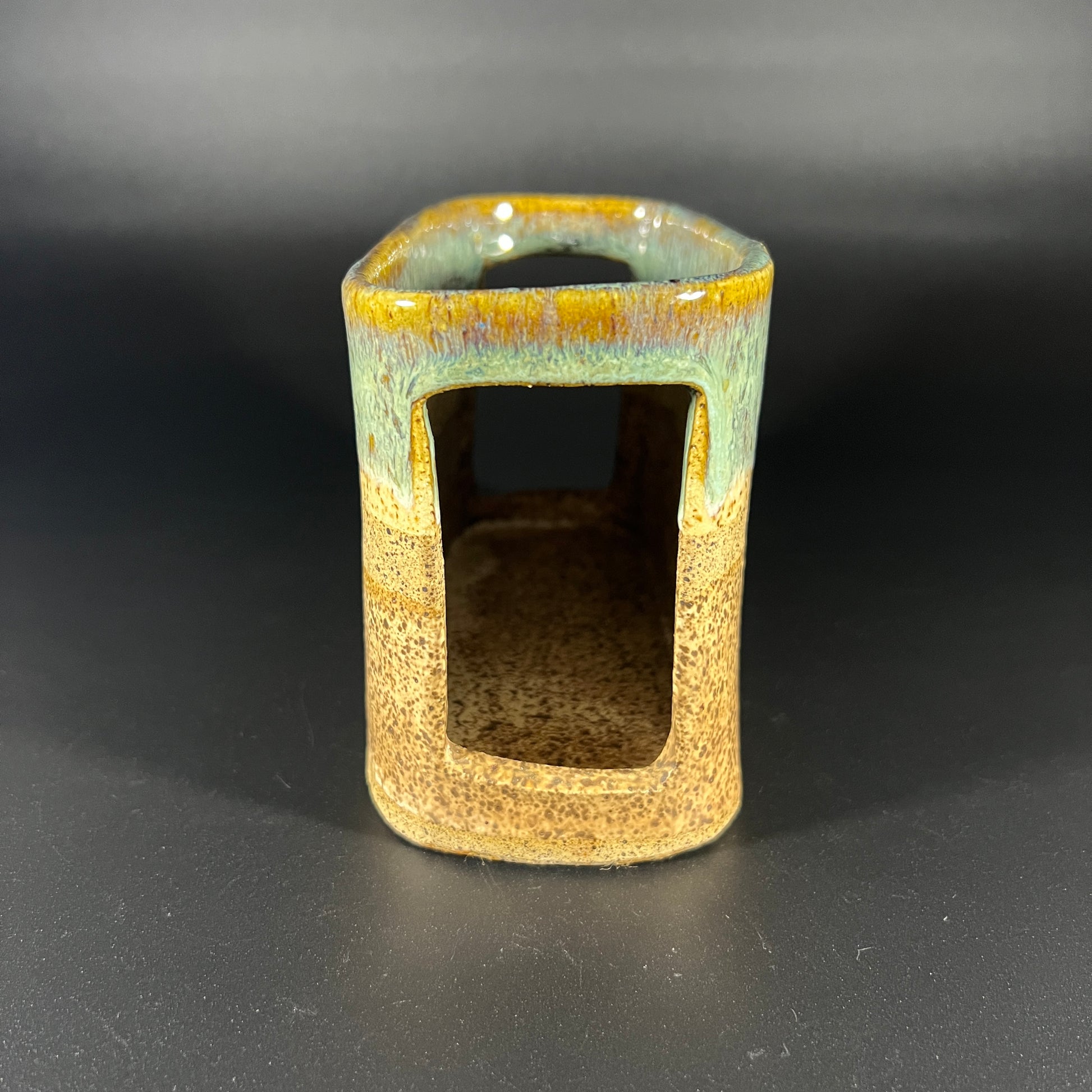 Vintage studio art piece, signed by the artist. This unique item could be interpreted as an abstract vase or perhaps a more functional piece, like a stylish napkin holder. Its modern, artistic design adds a distinctive touch to any space. In good vintage condition, with wear consistent with age. Please review the photos for a closer look at the details. It measures approximately 4.25" H x 7" W x 3.25" D.