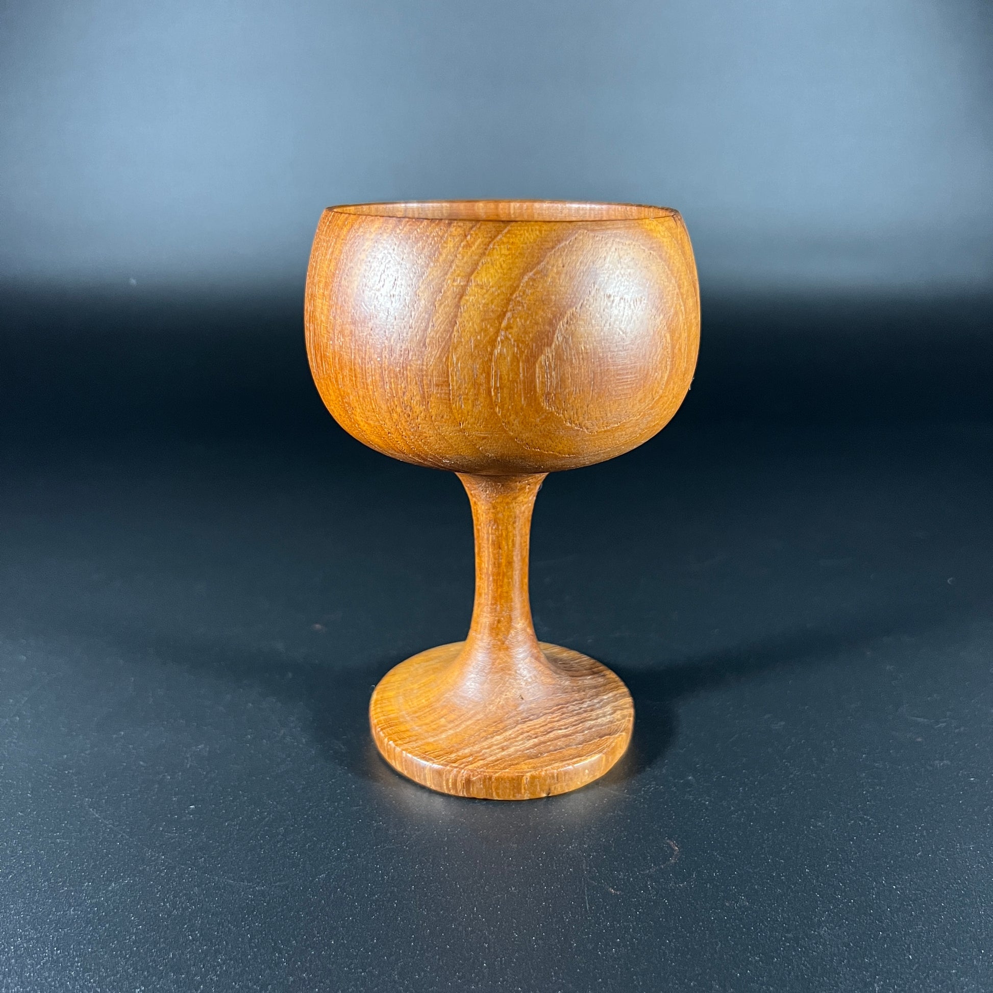 This set of four carved teak wood goblets from the 1960s is perfect for use as drinking vessels or candle holders, adding a retro touch to any space. Made in Thailand, these vintage pieces are in excellent condition with minimal wear or scratching.