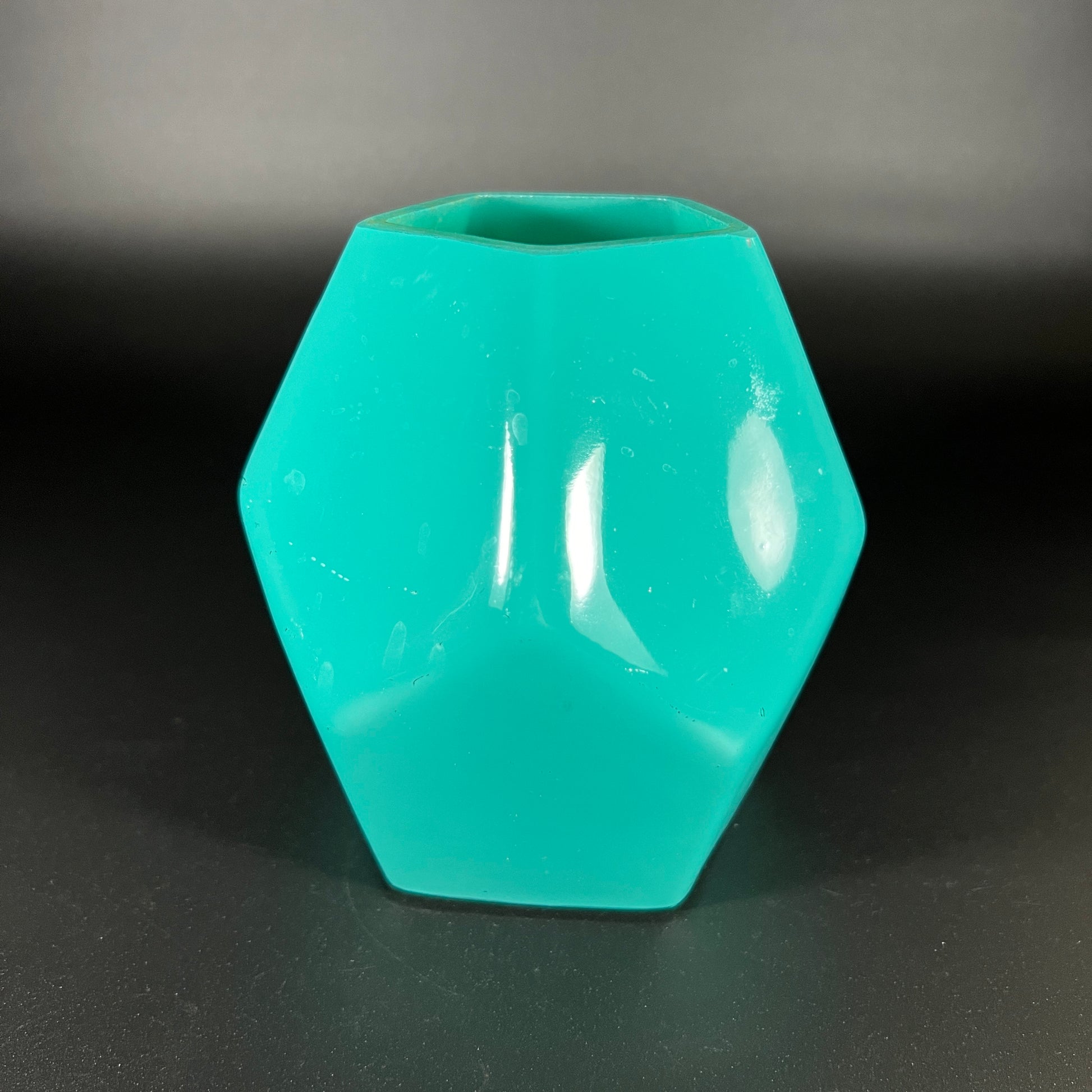 This teal geometric vase is in good vintage condition, with only minimal wear. Its bold design makes it a stylish addition to any space.