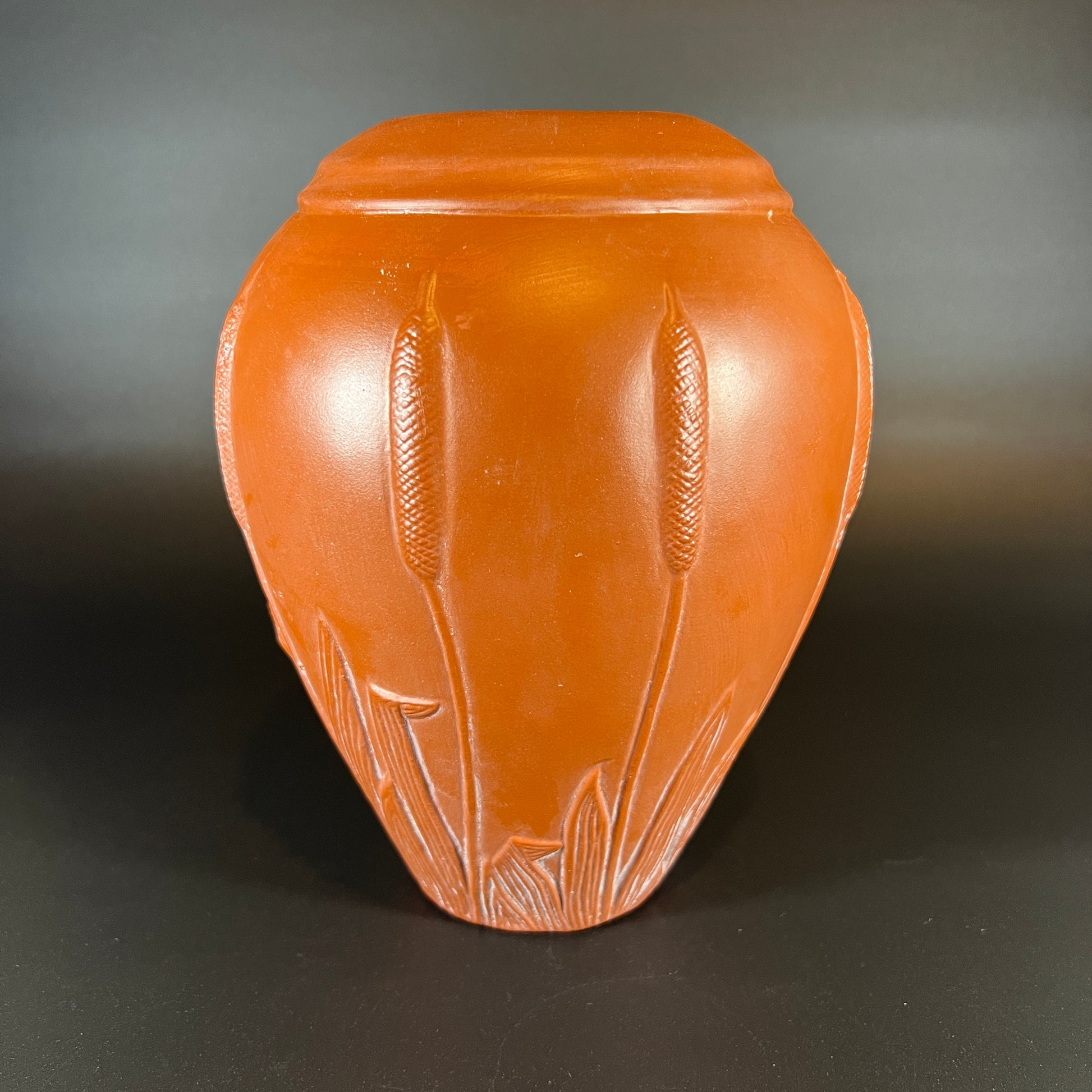 Presenting a vintage Art Pottery vase by Teleflora, this beautiful terracotta piece features a raised cattail and leaf motif that wraps around the vase, showcasing a timeless, nature-inspired design. The pictures best capture the intricate details of this charming piece. In good vintage condition, it has no chips or cracks, retaining its classic appeal. The bottom is stamped with the following markings: "A Teleflora Gift", "1985". Approximate Measurements: 8 inches tall, 6 inches wide, and a 2.75-inch opening.