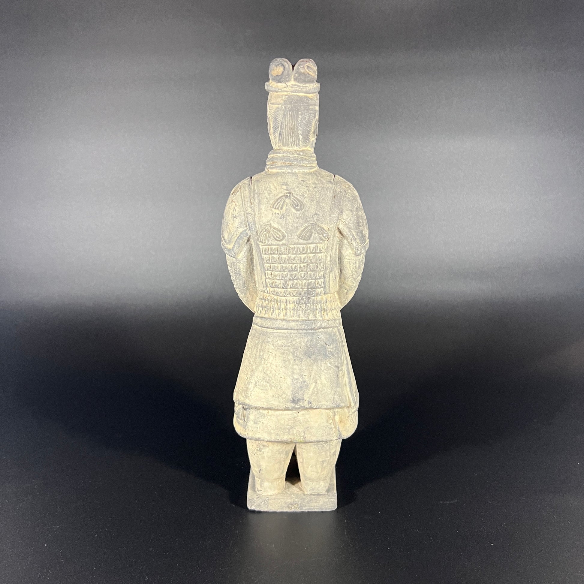 Vintage Chinese Reproduction Terra Cotta Warrior – Depicting a High-Ranking Officer. This finely crafted piece is in good vintage condition. It stands at 10.25" in height, 3.5" in width, and 3.5" in depth. A stunning addition for collectors of historical replicas.