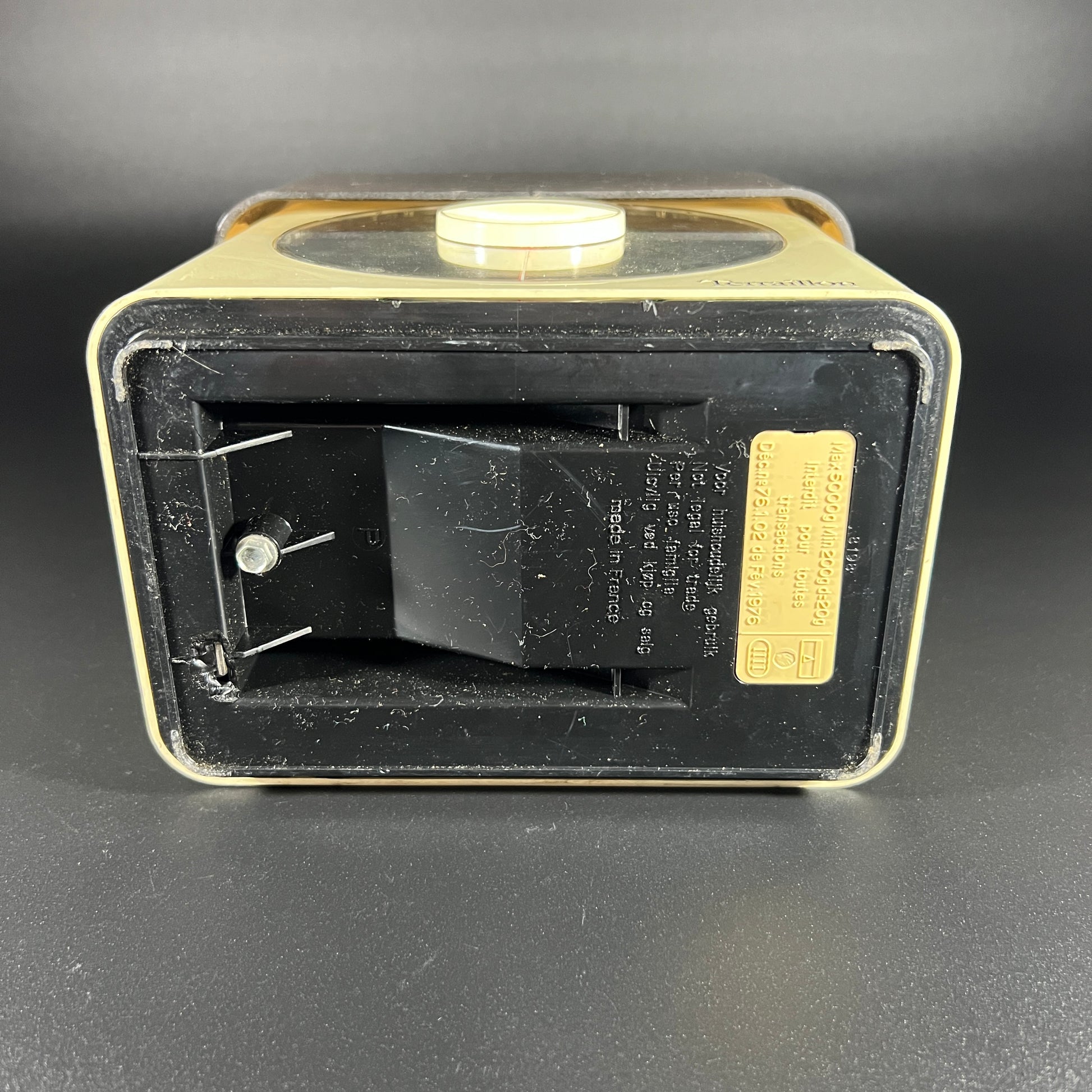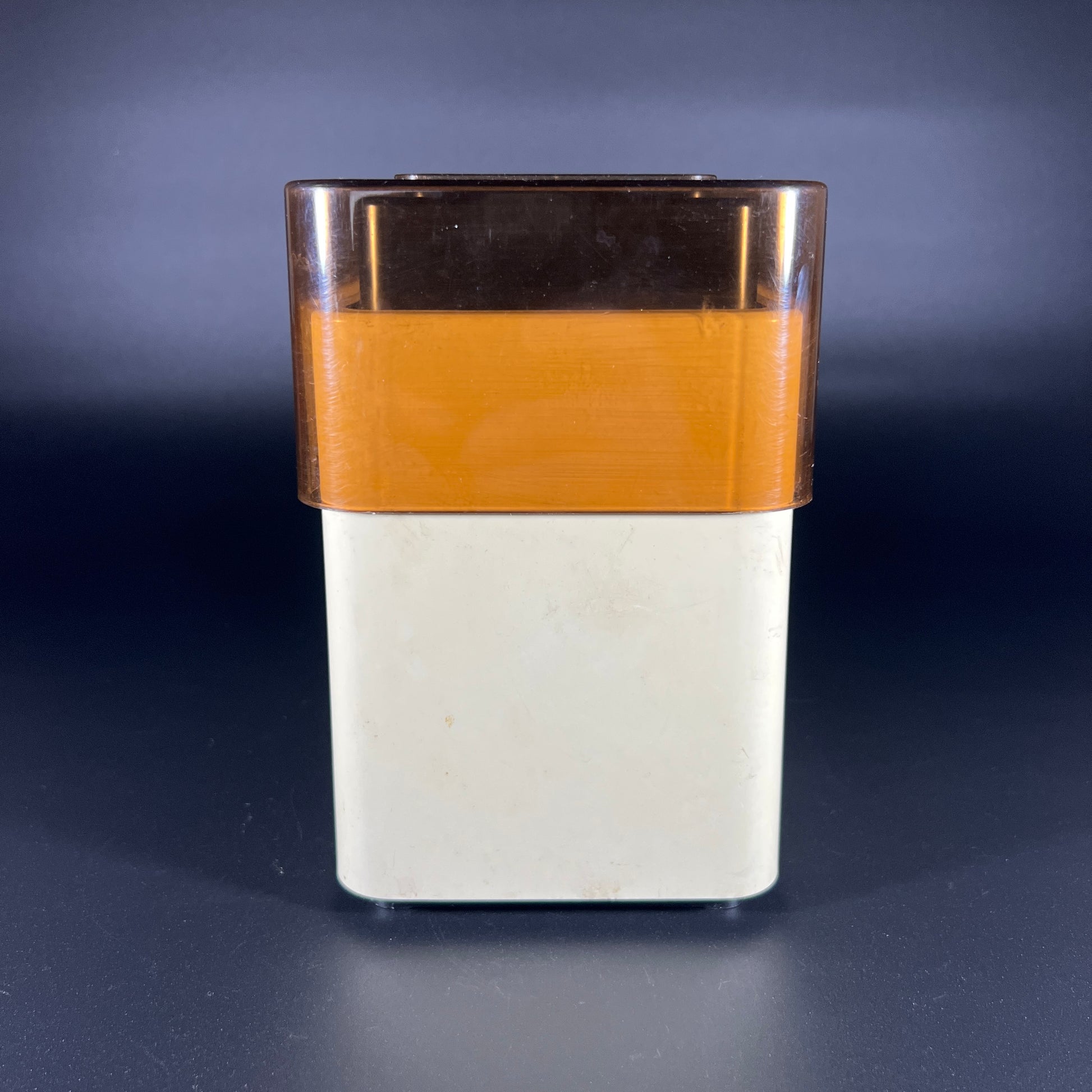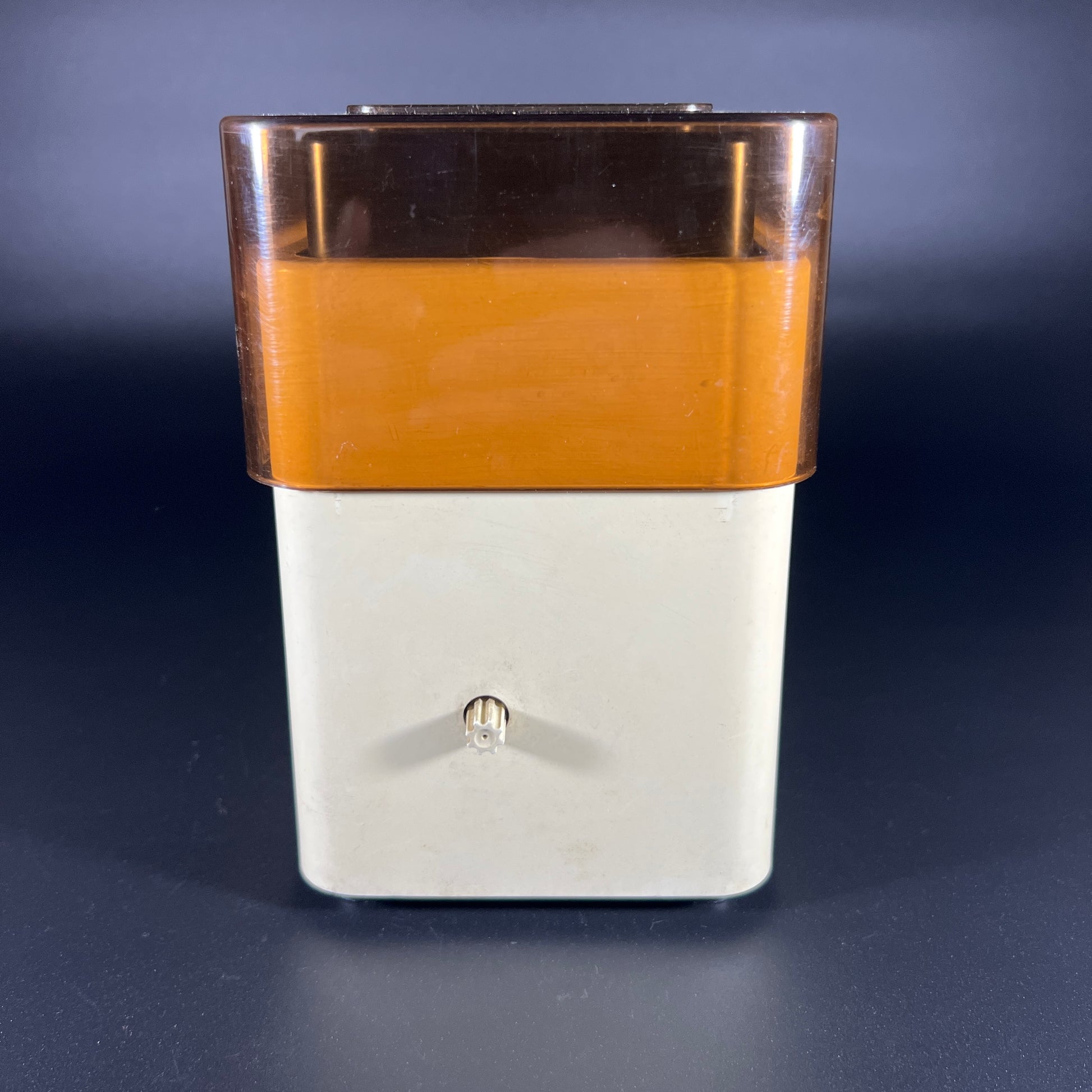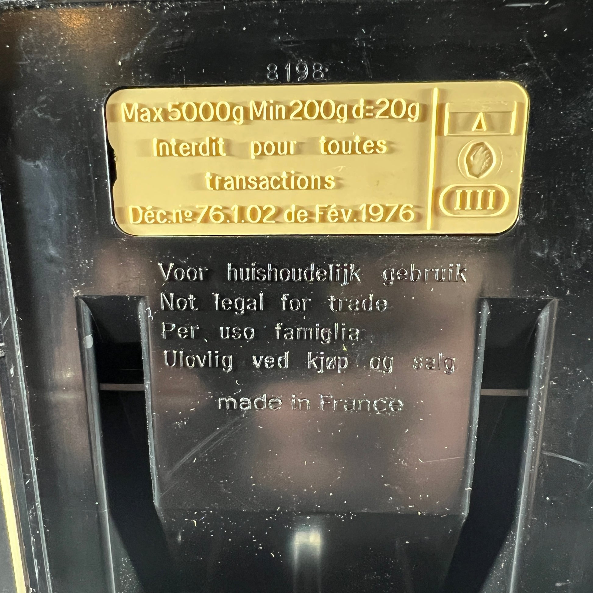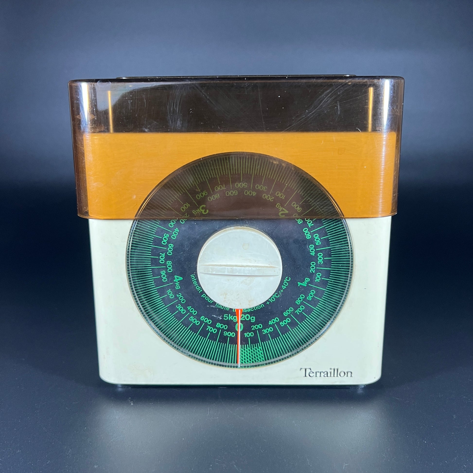 A vintage Terraillon kitchen scale from the 1970s, made in France and designed by Marco Zanuso. This model features detailed metric measurement options compared with other models, This scale has green numbers that complement the amber-colored tray. In excellent working condition, it’s a perfect fit for retro-inspired kitchens. The scale measures approximately 7 inches in height, 6.75 inches in width, and 4.5 inches in depth (with lid). A stylish and functional piece that adds a touch of vintage flair to any space.