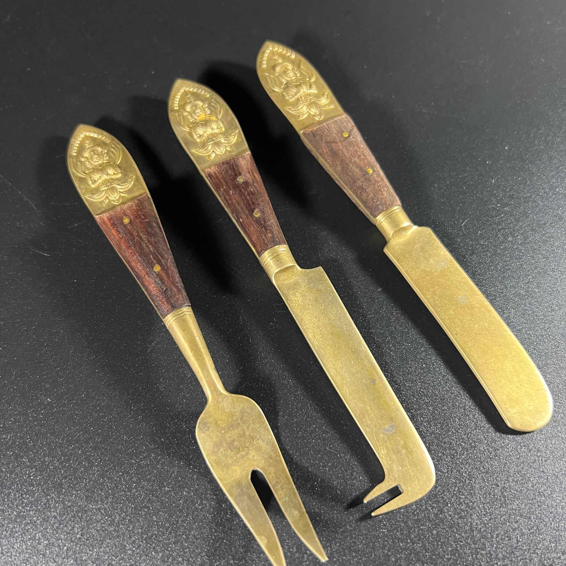 This set of three vintage Rosewood and Brass cheese utensils from Thailand showcases beautiful craftsmanship and elegant design. In good vintage condition, they show wear consistent with age, adding character to these functional pieces. Please review the photos for more details. Each utensil measures approximately 5.75" L x 0.75" W. A stylish and unique addition to any collection of vintage kitchenware or cheese accessories!