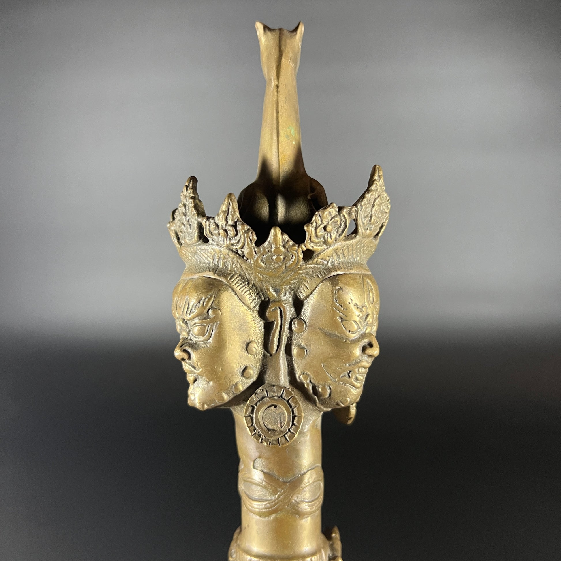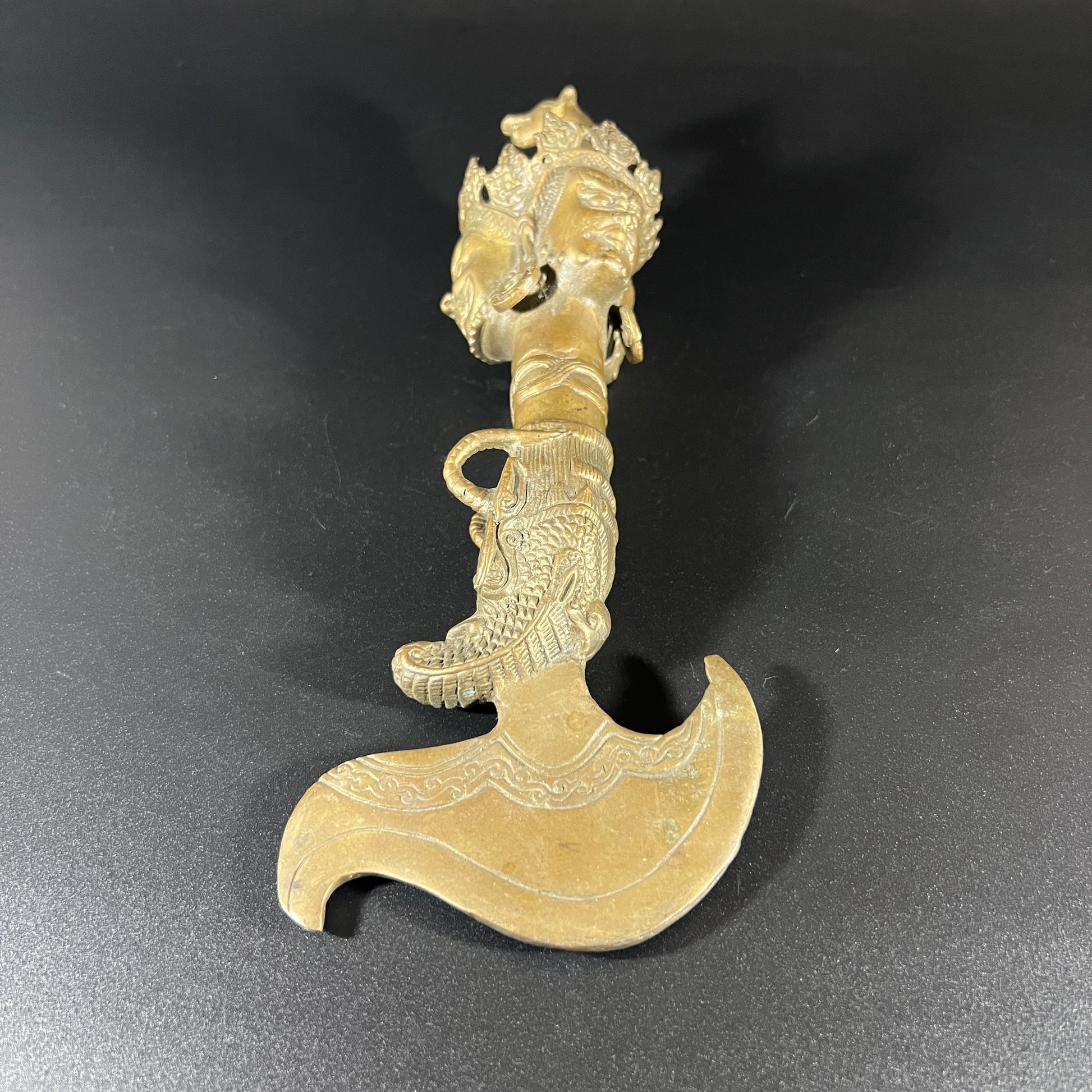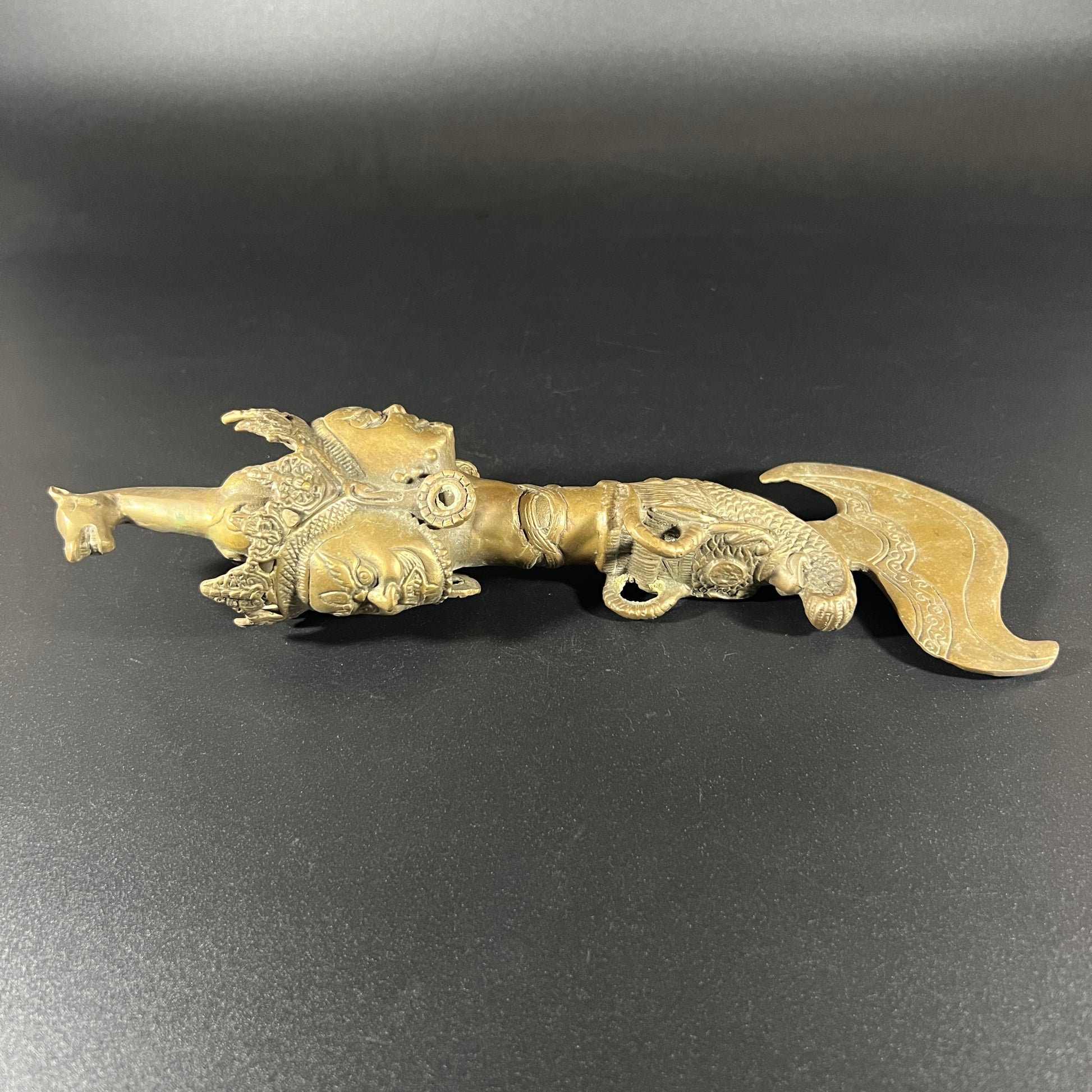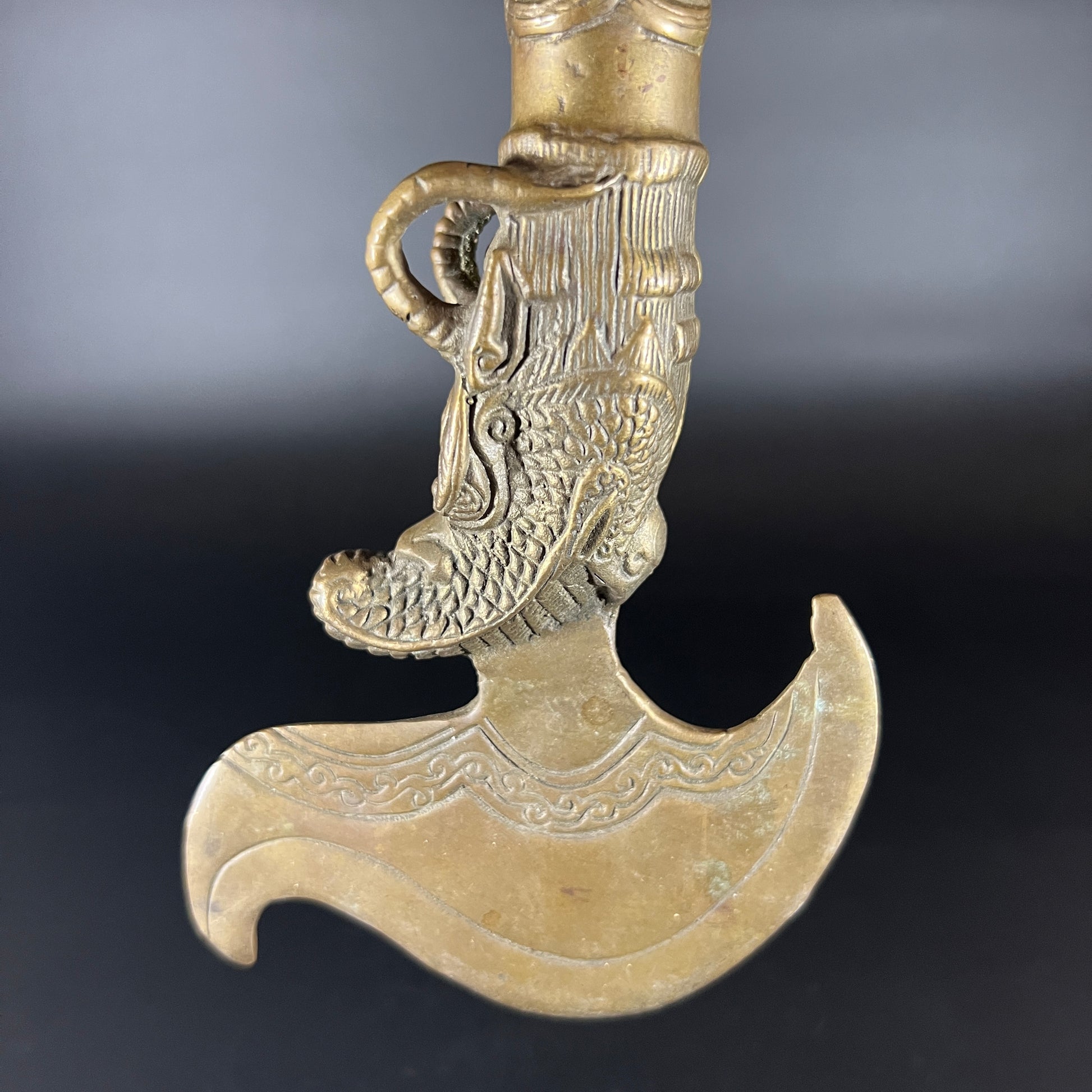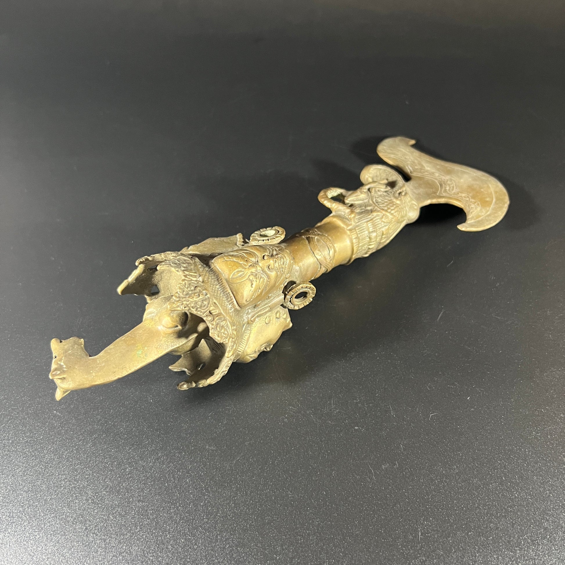 This antique bronze Tibetan Kartika Knife (flaying knife) is rich in symbolism, featuring intricate representations of a dragon, horse, and a three-headed deity. Traditionally used in tantric rituals, this ceremonial knife is believed to aid in the cutting of negative emotions and is often held by deities like Vajrayogini and Mahakala. In good vintage condition, it shows minor patina, adding to its character. The knife measures approximately 11" L x 2.5" D x 4" D, making it a striking and meaningful piece.