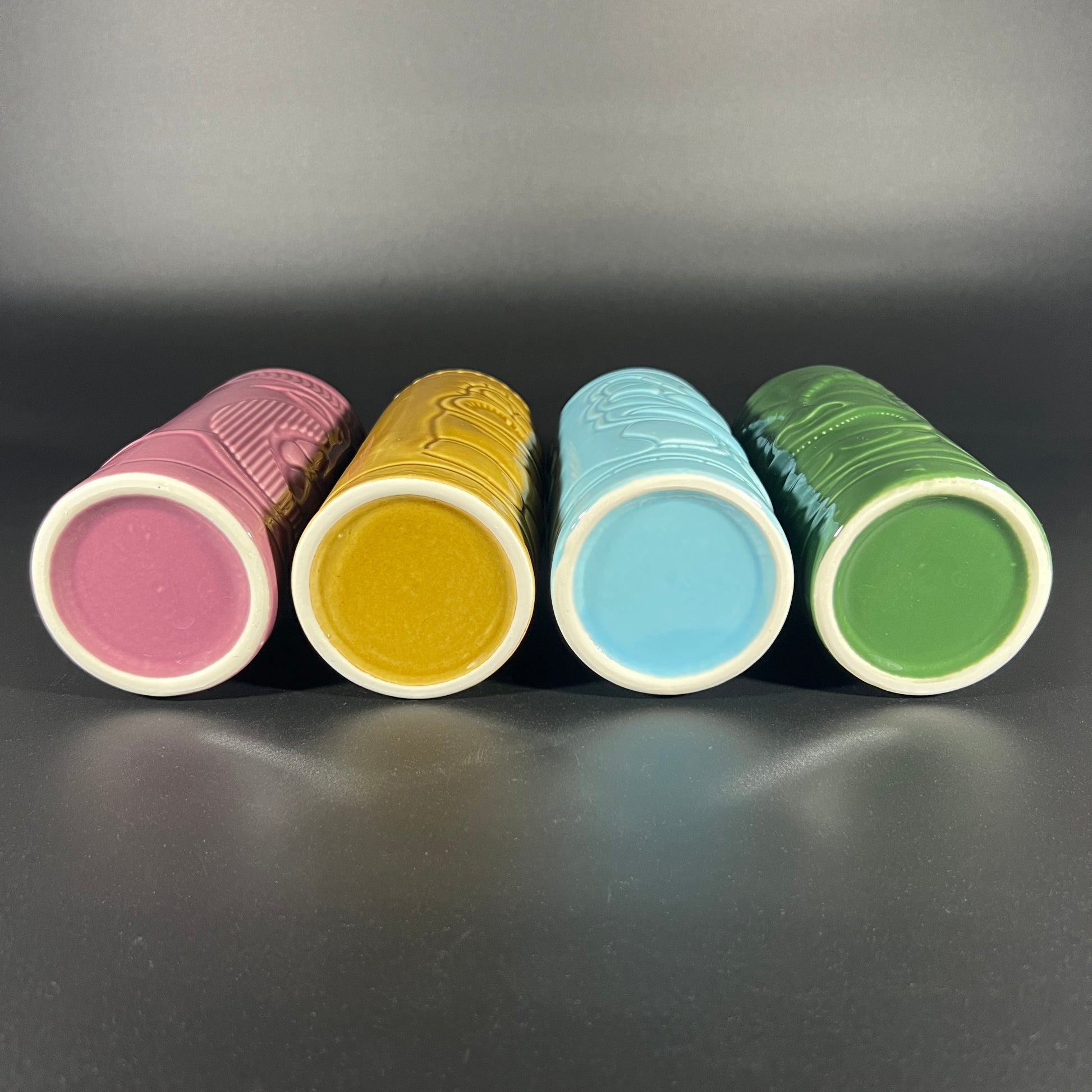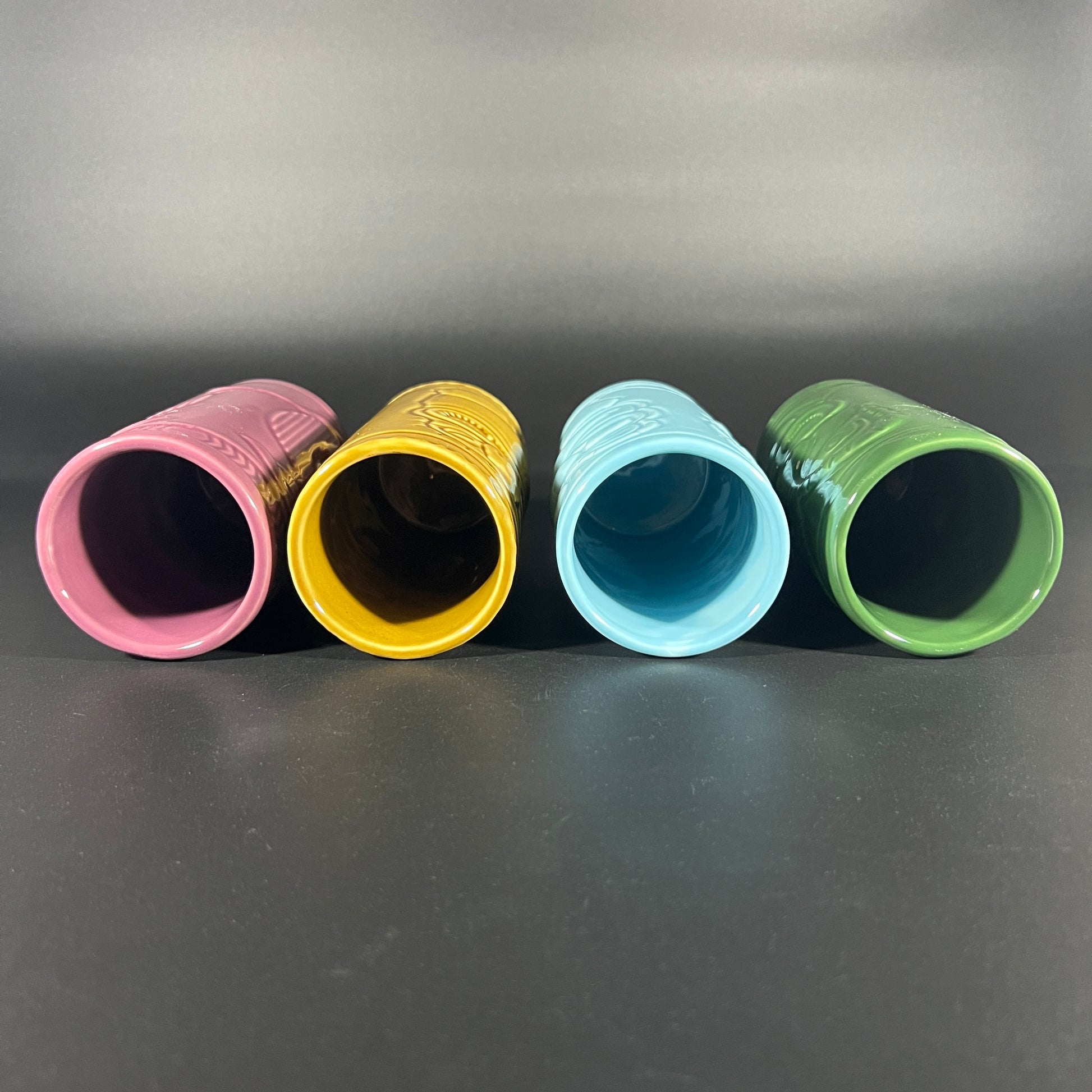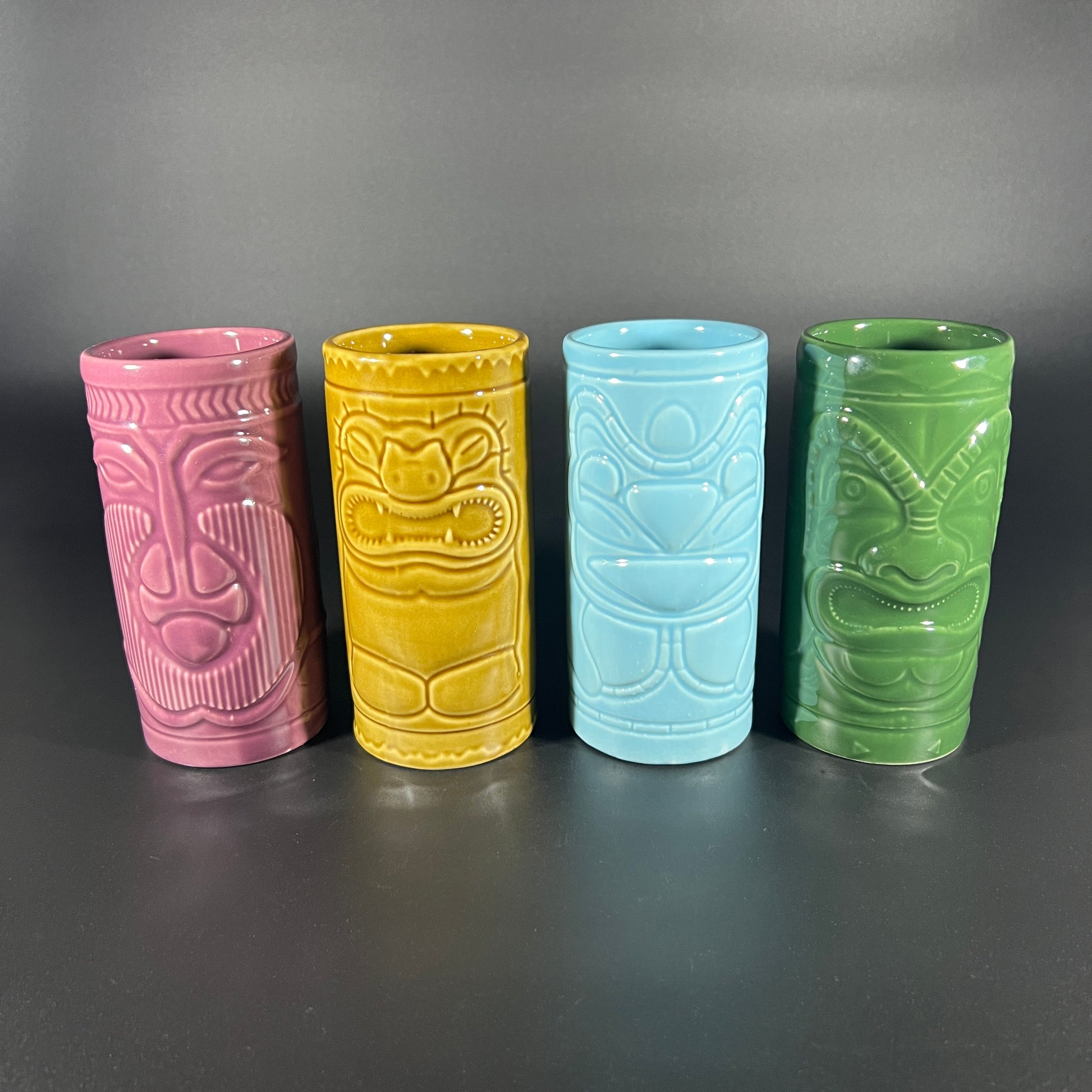 This vibrant set of 4 tiki mugs is in excellent condition and offers a fun, affordable option for serving your guests' favorite cocktails. Perfect for parties, these mugs allow you to enjoy tiki drinks without the worry of damaging high-end or vintage pieces. Each mug measures approximately 5.5" H x 2.75" in diameter, making them the ideal size for serving.