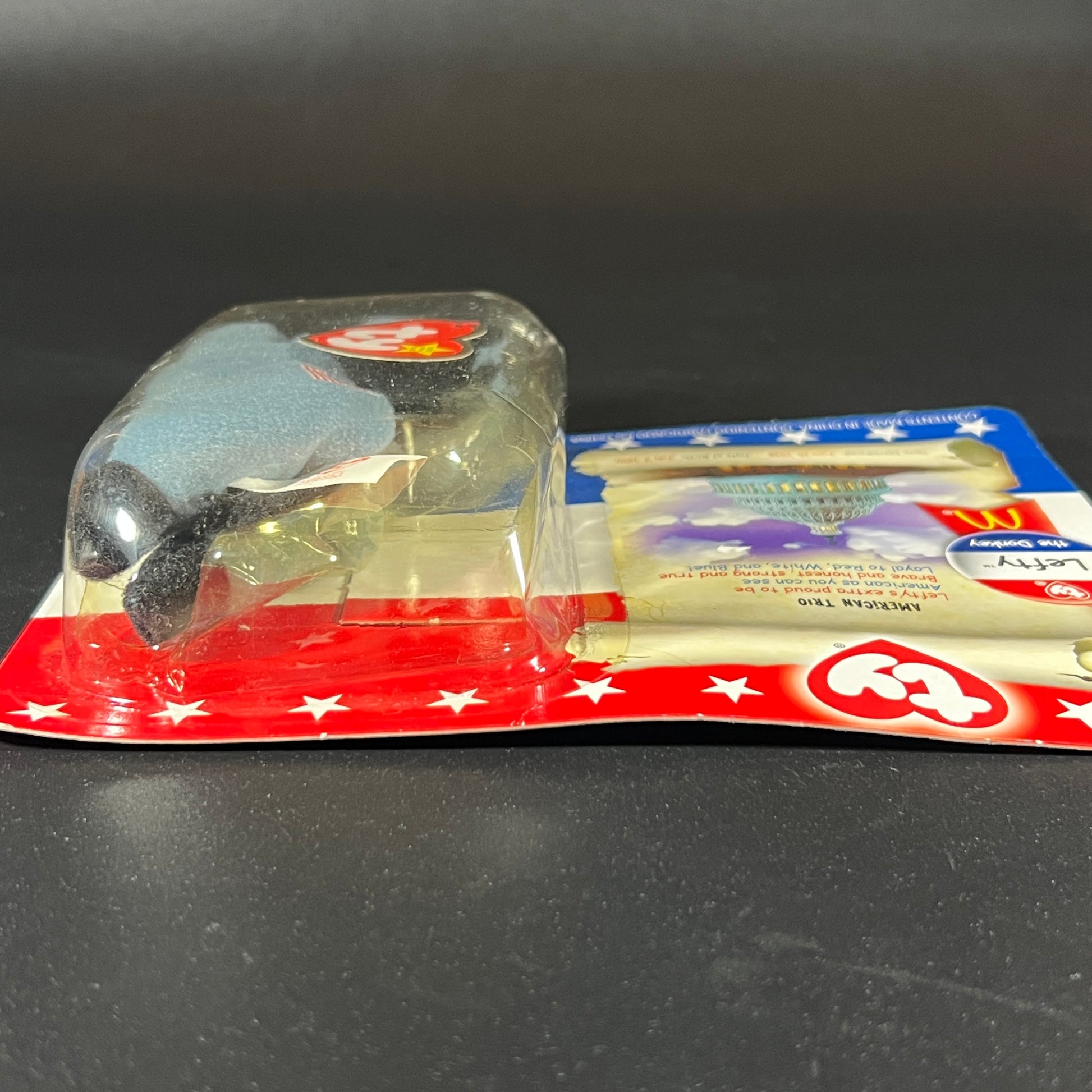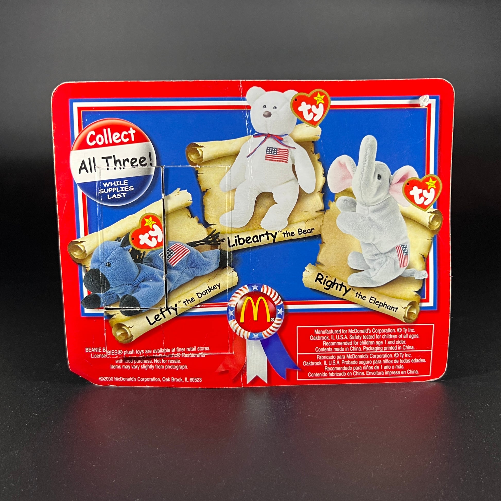 This vintage collectible set includes Ty Teenie Beanie Babies Righty the Elephant and Lefty the Donkey, released by McDonald's in 1996. With a shared birthdate of July 4, 1996, these patriotic plush toys are a unique find—perfect for Beanie Baby enthusiasts and political memorabilia collectors alike. The set remains unopened, and both figures are still sealed in their original packaging, which is dated 2000. While the packaging shows some wear consistent with age, it is in fair vintage condition overall. Each package measures approximately 6 inches high, 7.75 inches wide, and 2 inches deep. Please review the photos for further details. This set makes a charming and rare addition to any vintage toy or political-themed collection.