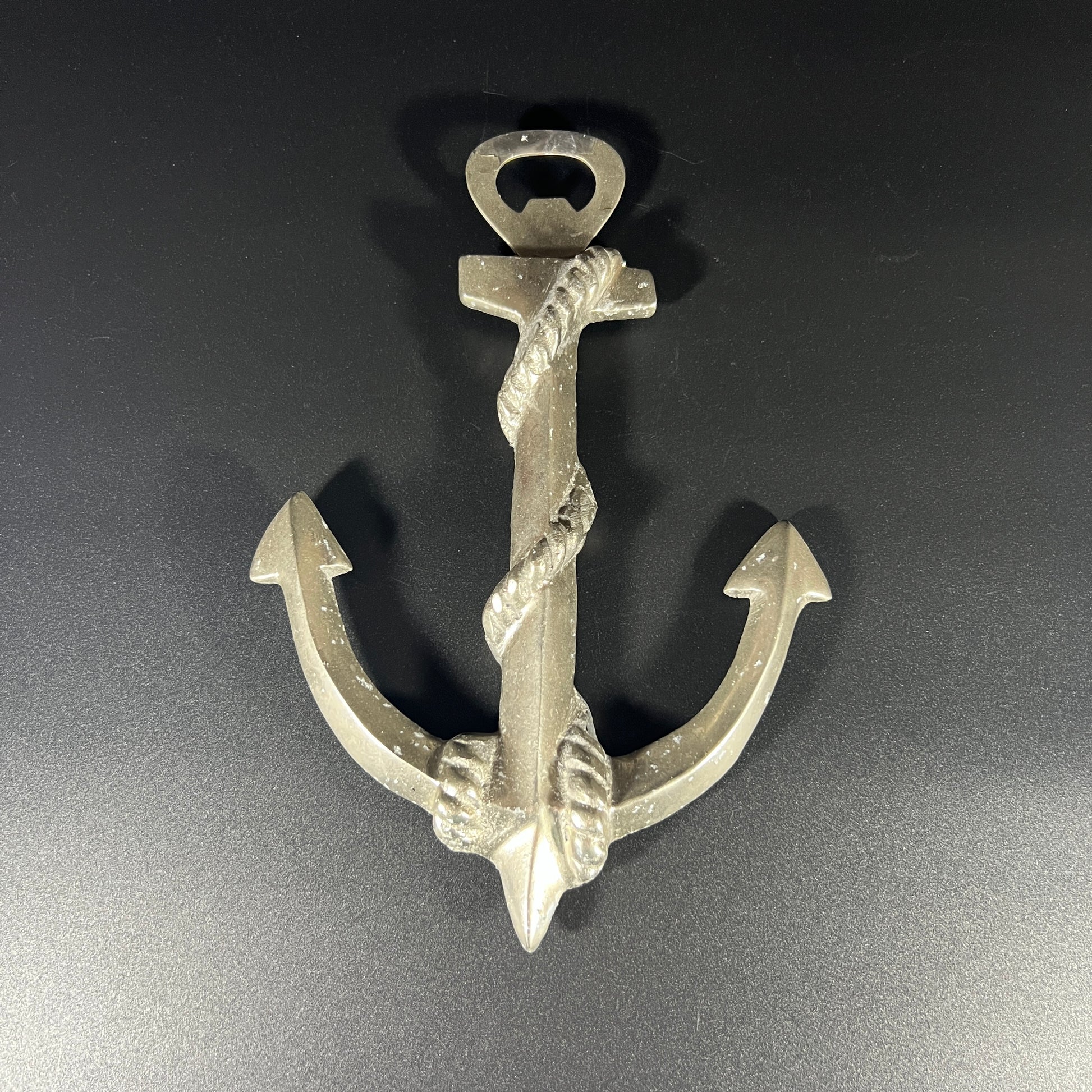 This charming vintage bottle opener is beautifully designed in the shape of a nautical anchor, offering a touch of maritime flair. Crafted from cast aluminum, it exudes a timeless, sturdy quality. In excellent vintage condition, it showcases a well-preserved patina that adds to its character. Perfect for collectors or as a functional decorative piece, it measures approximately 9" H x 6.25" W x 0.75" D, making it an eye-catching addition to any bar or coastal-inspired setting.