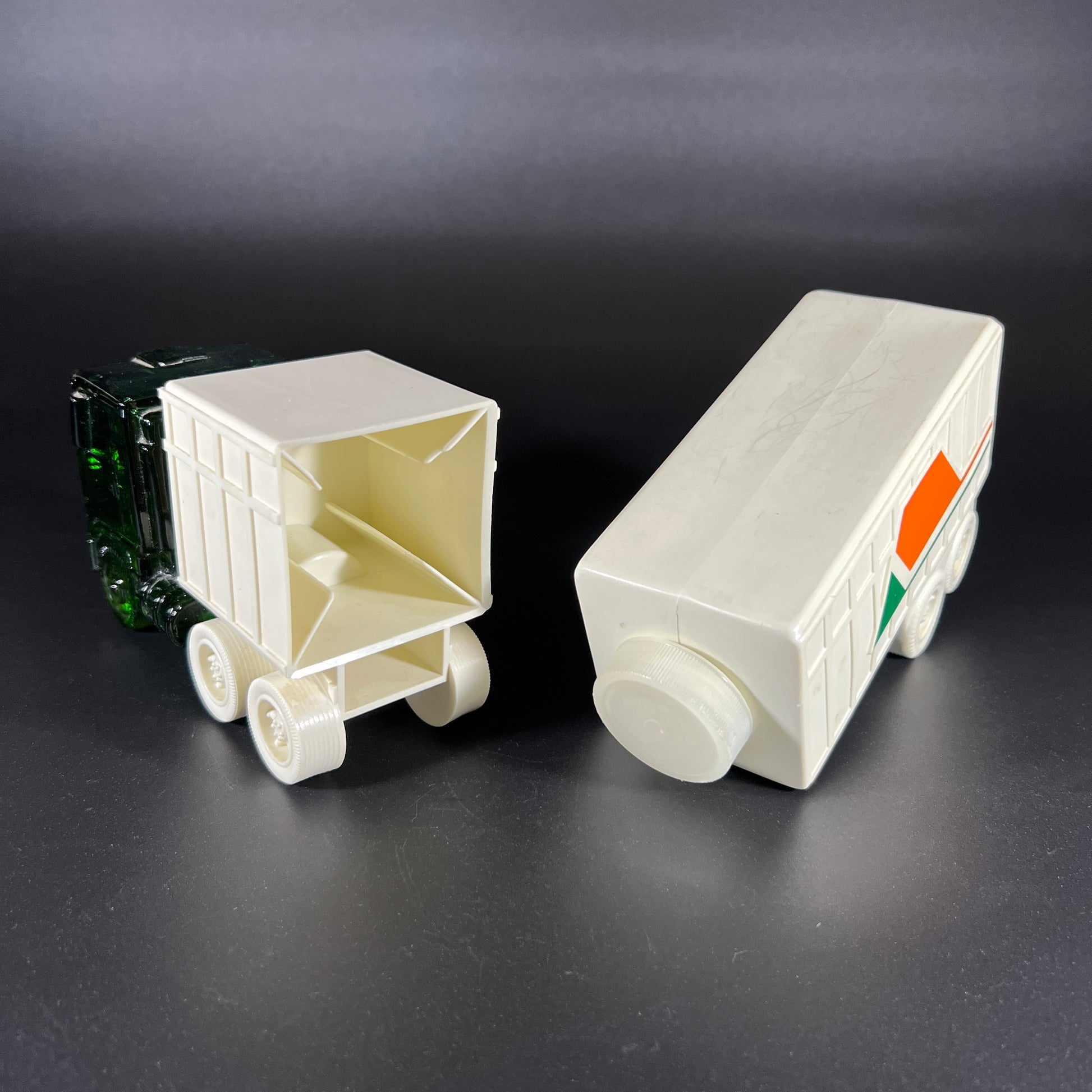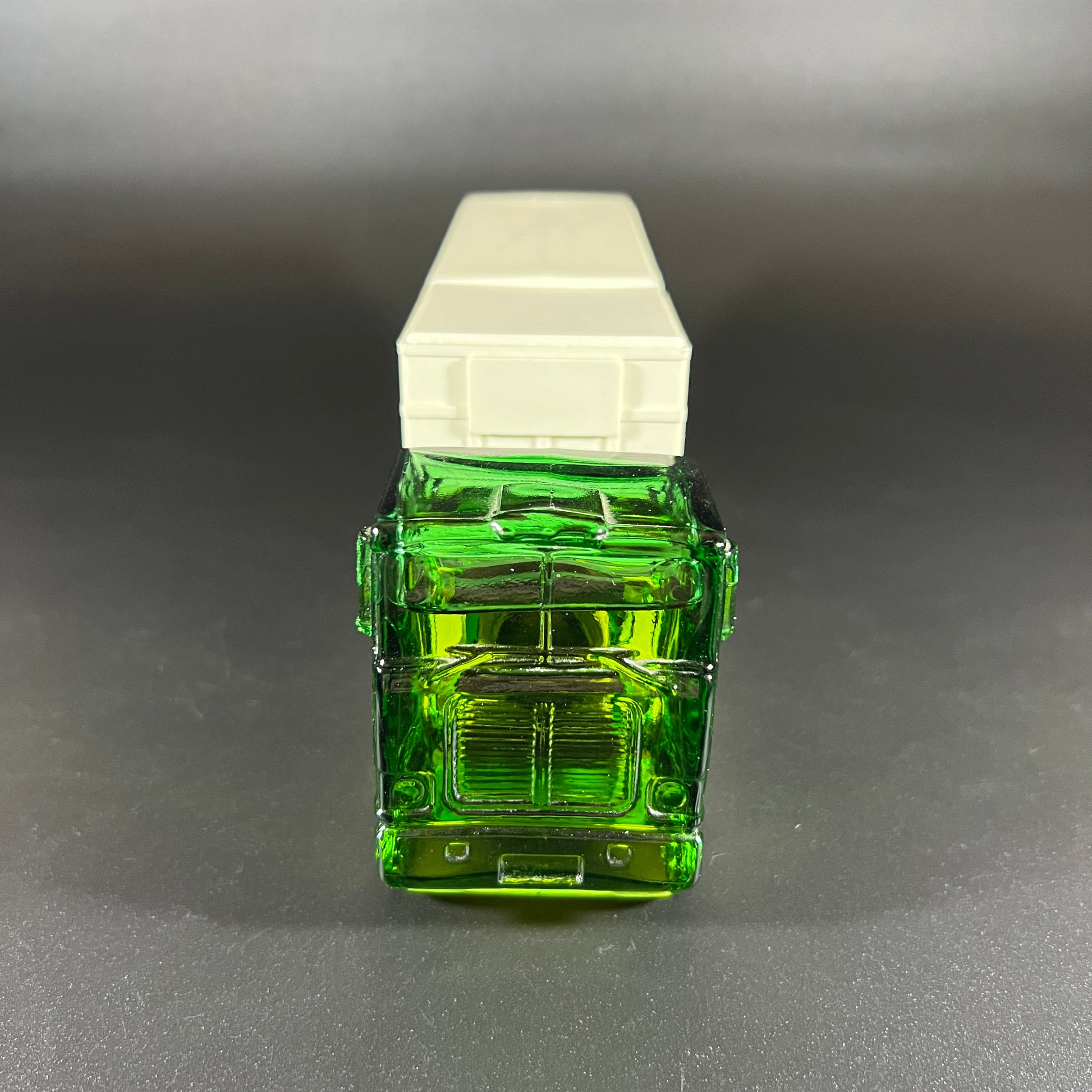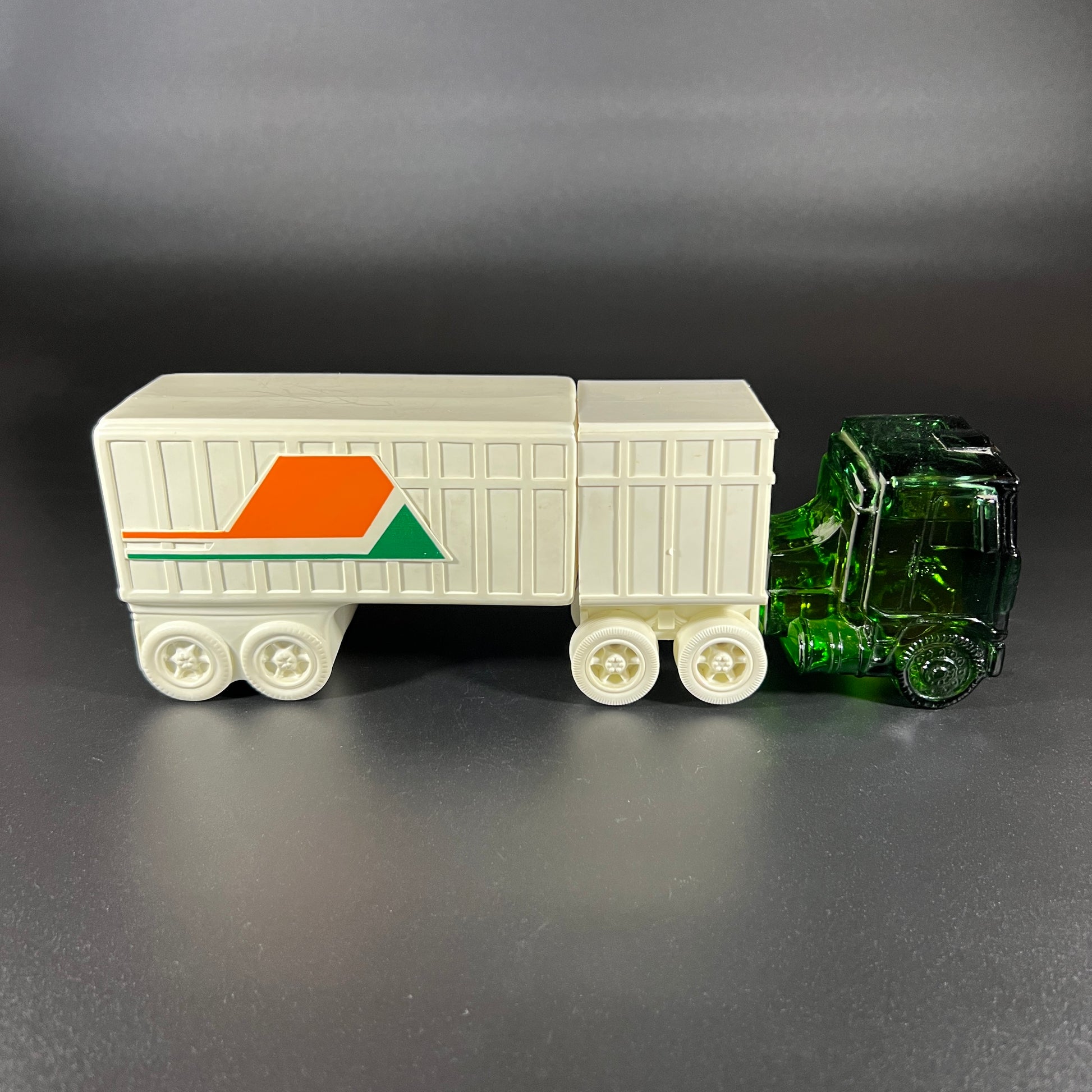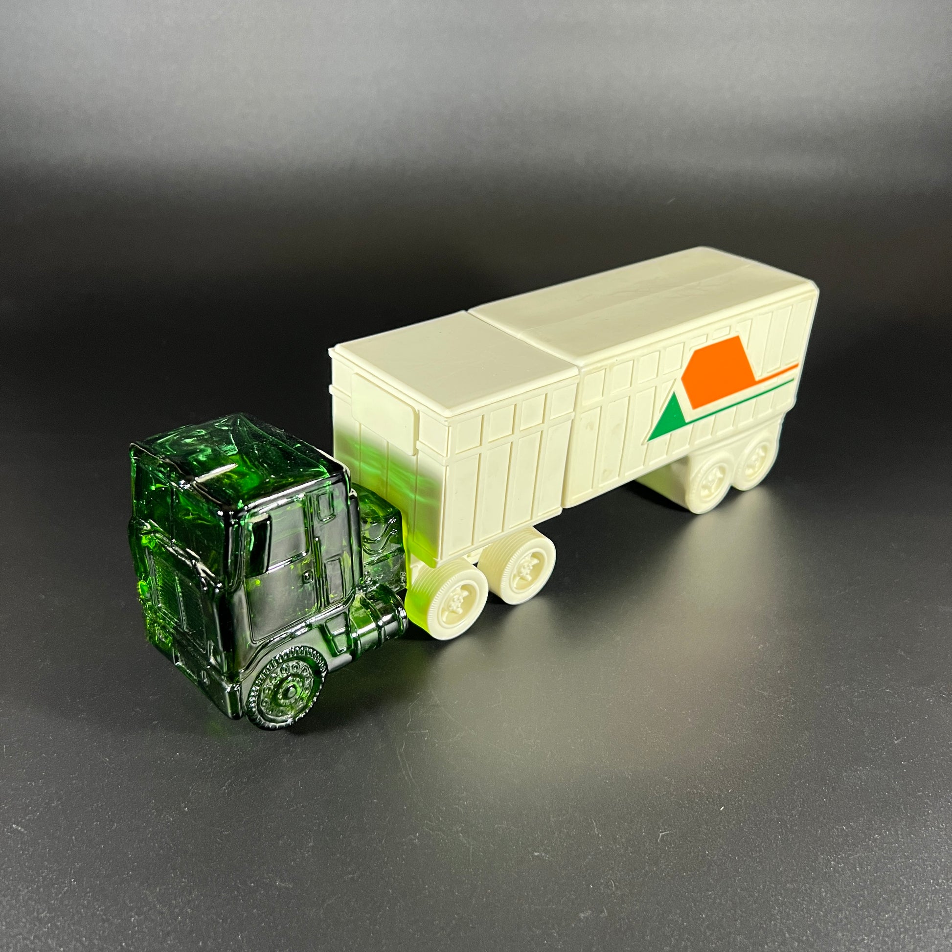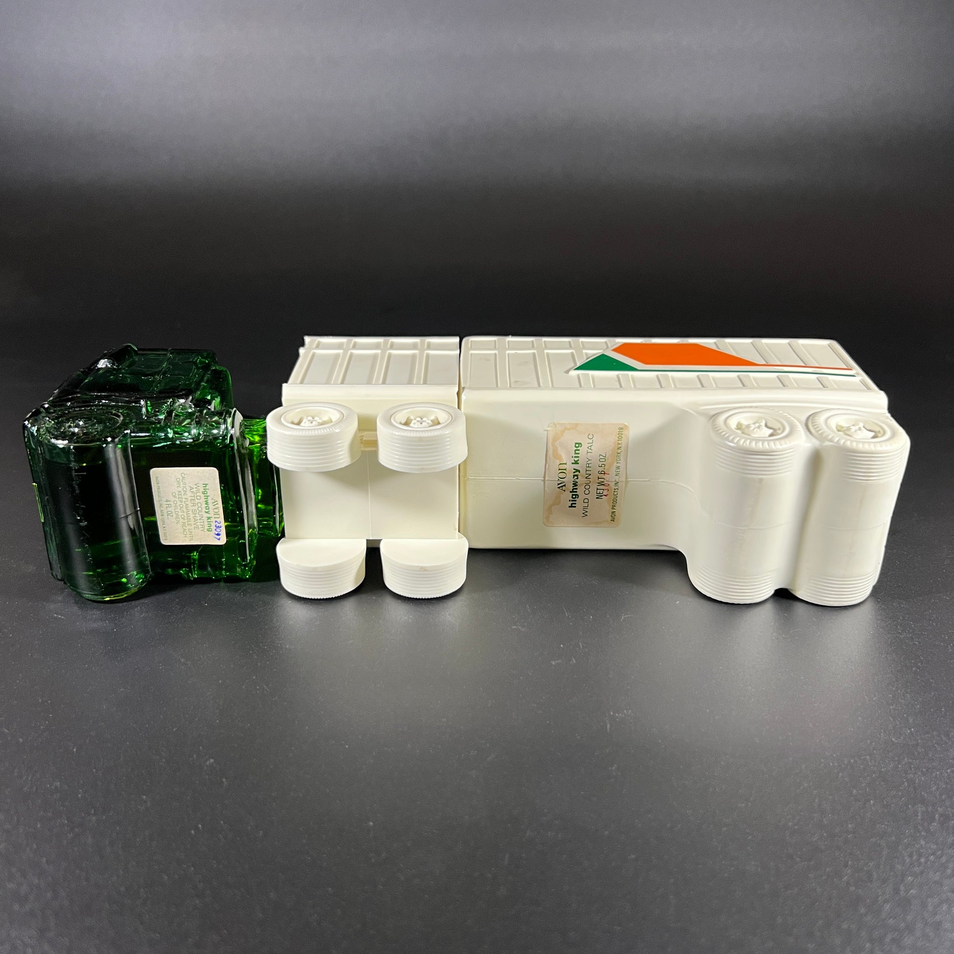 Add a touch of vintage charm to your collection with this Avon "Highway King" Everest after shave decanter, made between 1977-78. The unique green glass truck cab holds approximately 4 fl oz of Everest After Shave, while a white plastic connector links it to a 6.5 oz plastic container of Everest Talc. The after shave has a wonderful scent, and the talc remains unopened.