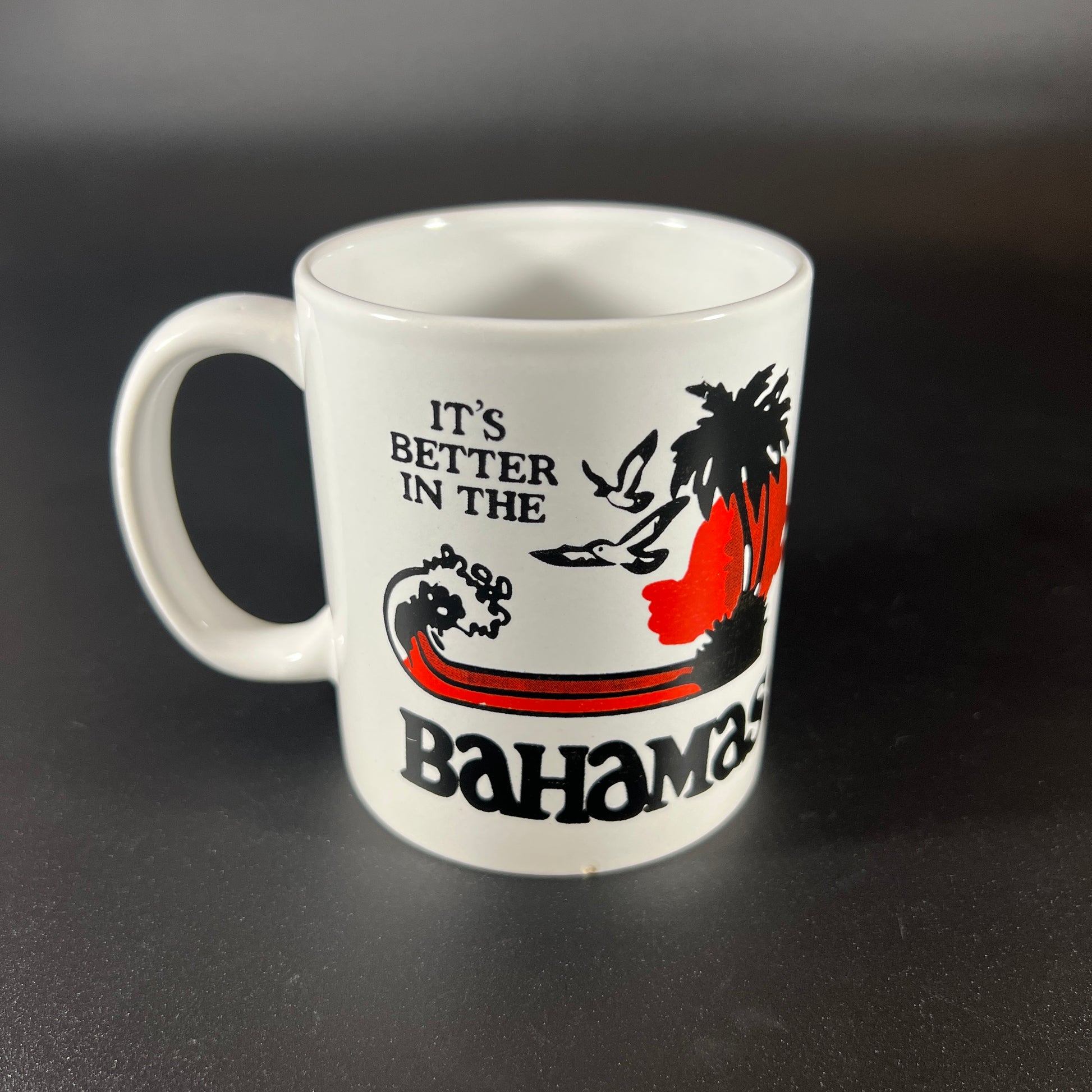 This vintage “It’s Better in the BAHAMAS” coffee mug brings a bold, retro island vibe to your collection. Featuring a vibrant design in orange, maroon, and black on both sides, it captures the sunny spirit of the Bahamas in true vintage style. The mug is in good vintage condition, with just a single small flea bite on the base that doesn’t affect its overall look or function. It measures approximately 3.75 inches high, 4.75 inches wide including the handle, and has a 3-inch opening. A fun and colorful addition for collectors of travel souvenirs or retro kitchenware.