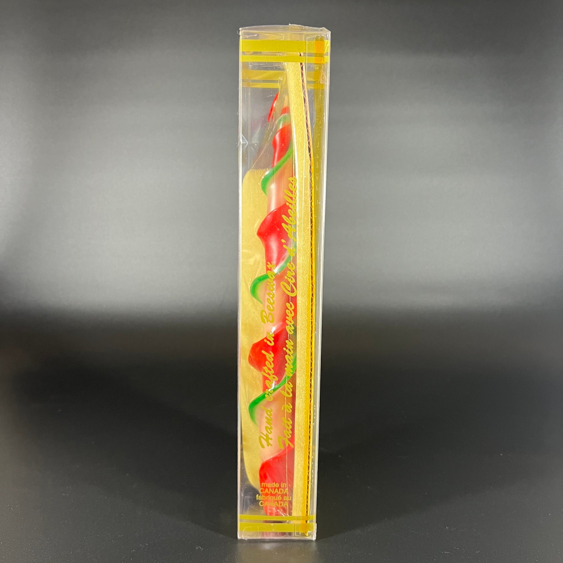 Vintage Beeswax Christmas Taper Candles by Honeywood Candles – New in Box. These beautiful 10-inch tapers feature a festive swirl design in red, white, and green. Made from high-quality beeswax, they are dripless and smokeless, making them perfect for holiday ambiance. The set is in good vintage condition, still sealed in its original packaging. The box measures approximately 11.75 inches in height, 3.75 inches in width, and 2 inches in depth.