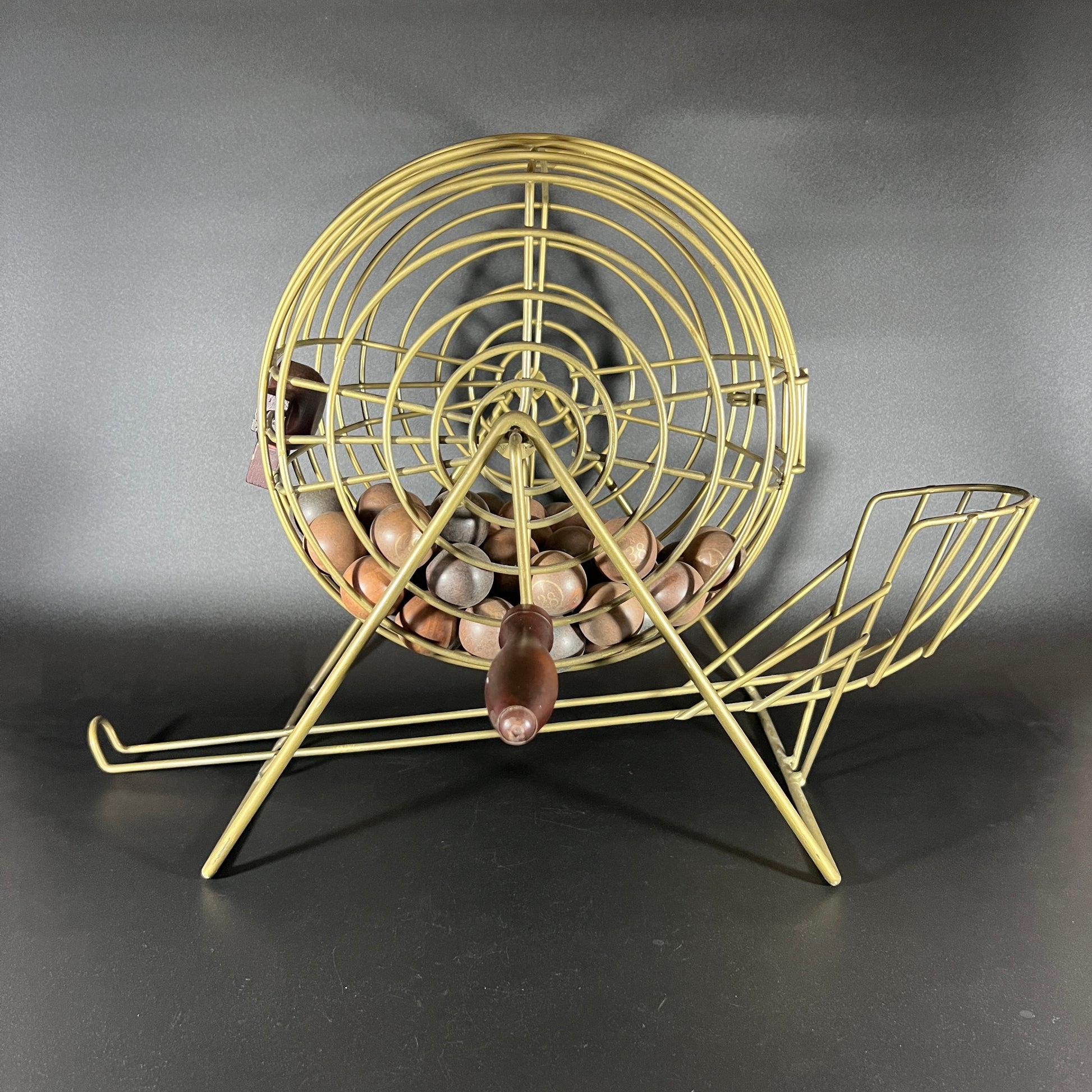 This classic bingo game set features a charming vintage design crafted from metal and wood. It's in excellent vintage condition and includes the original ball dispenser, markers, and a wooden ball holder. Please note, the original bingo cards are no longer included, but replacements are easy to find. A perfect addition for collectors or anyone who loves nostalgic game nights!