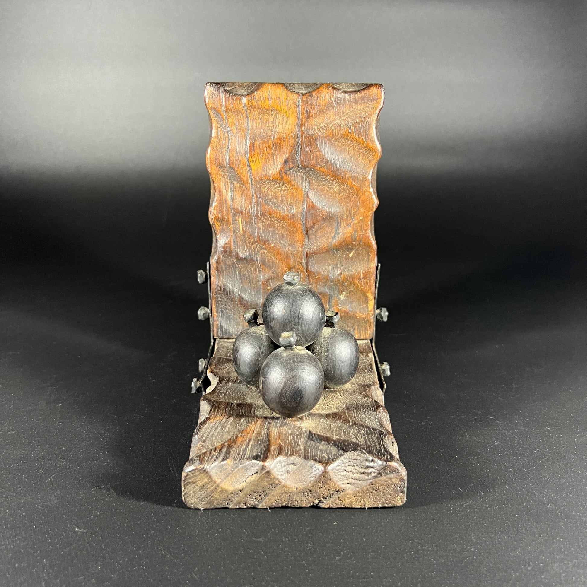 This vintage bookend, dating back to the 1960s, was originally part of a set—one featuring a cannon and the other with a stack of cannonballs. In fair vintage condition, it is missing two nails from its hardware, though this does not affect its functionality. Priced accordingly, it measures approximately 6.25" in height, 3.5" in width, and 5" in depth. A nostalgic piece with a bit of character!