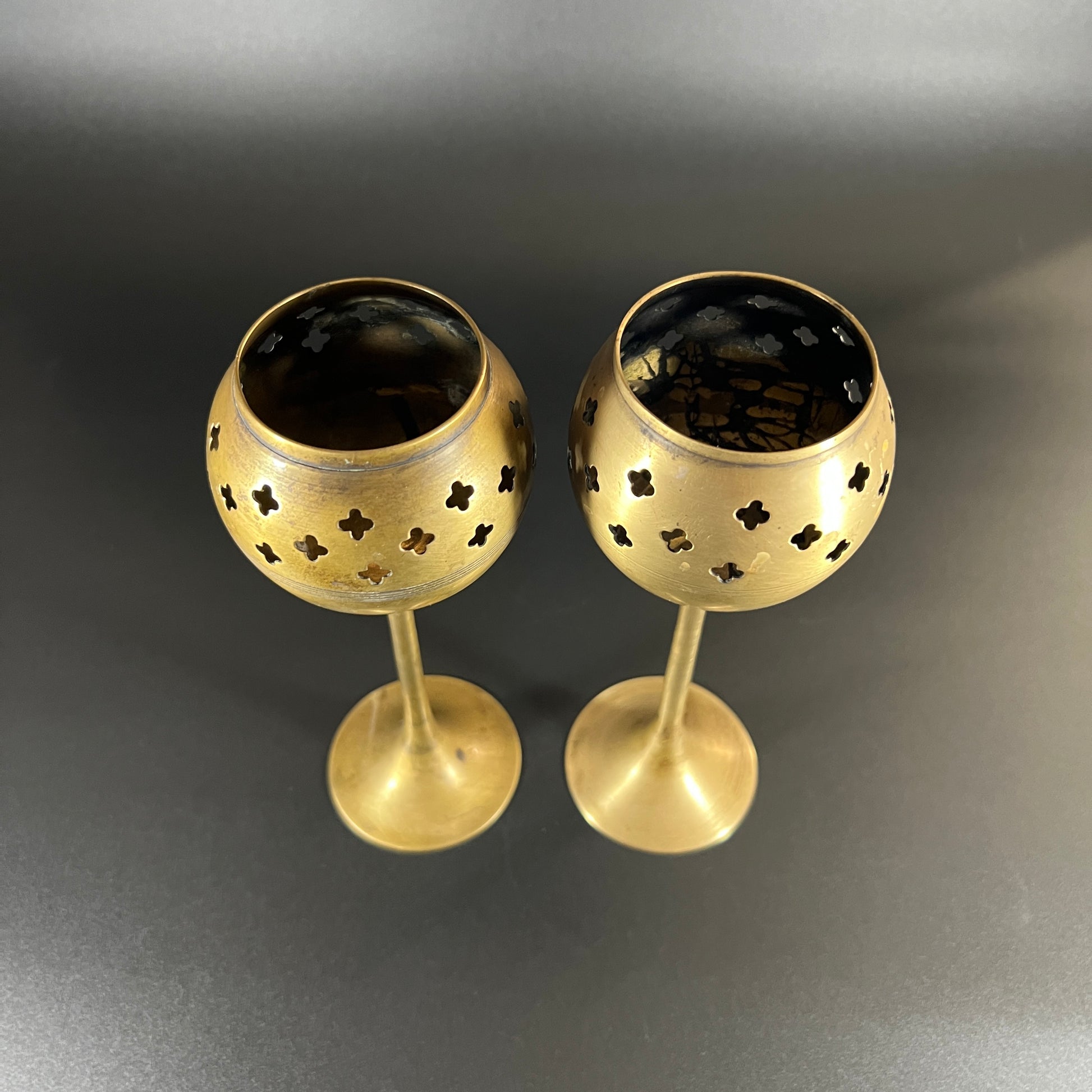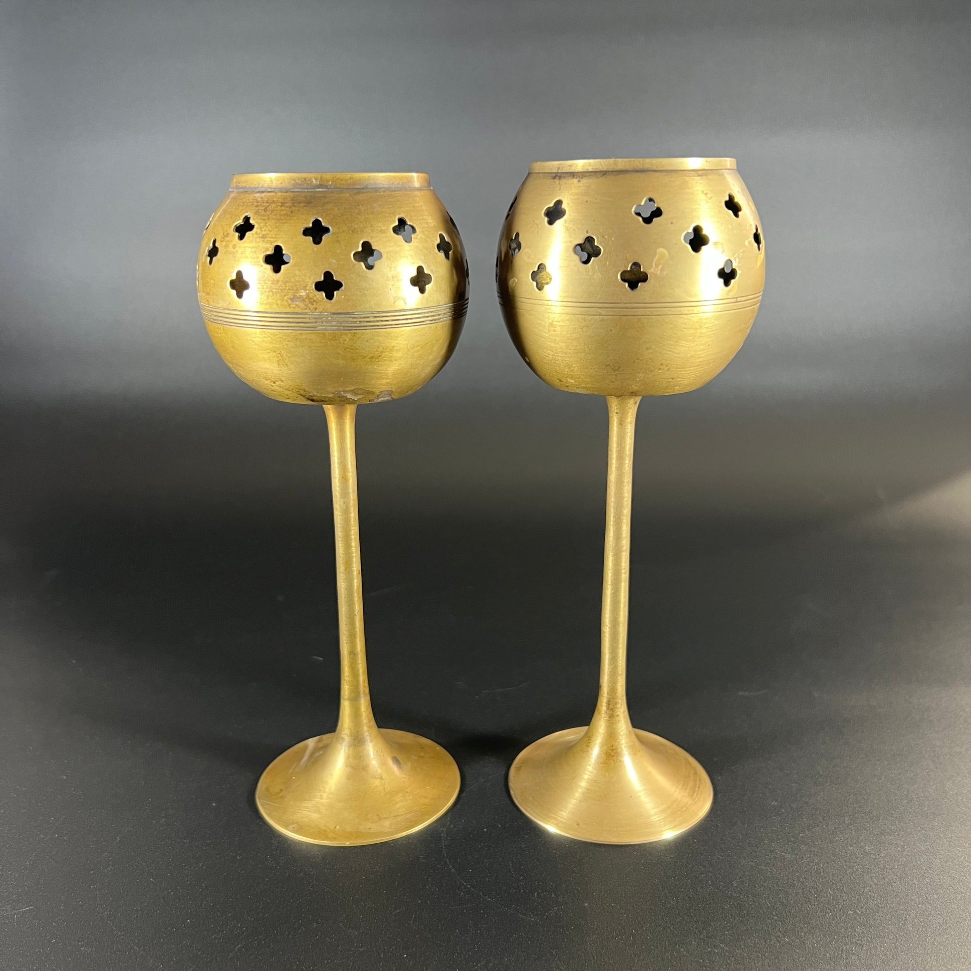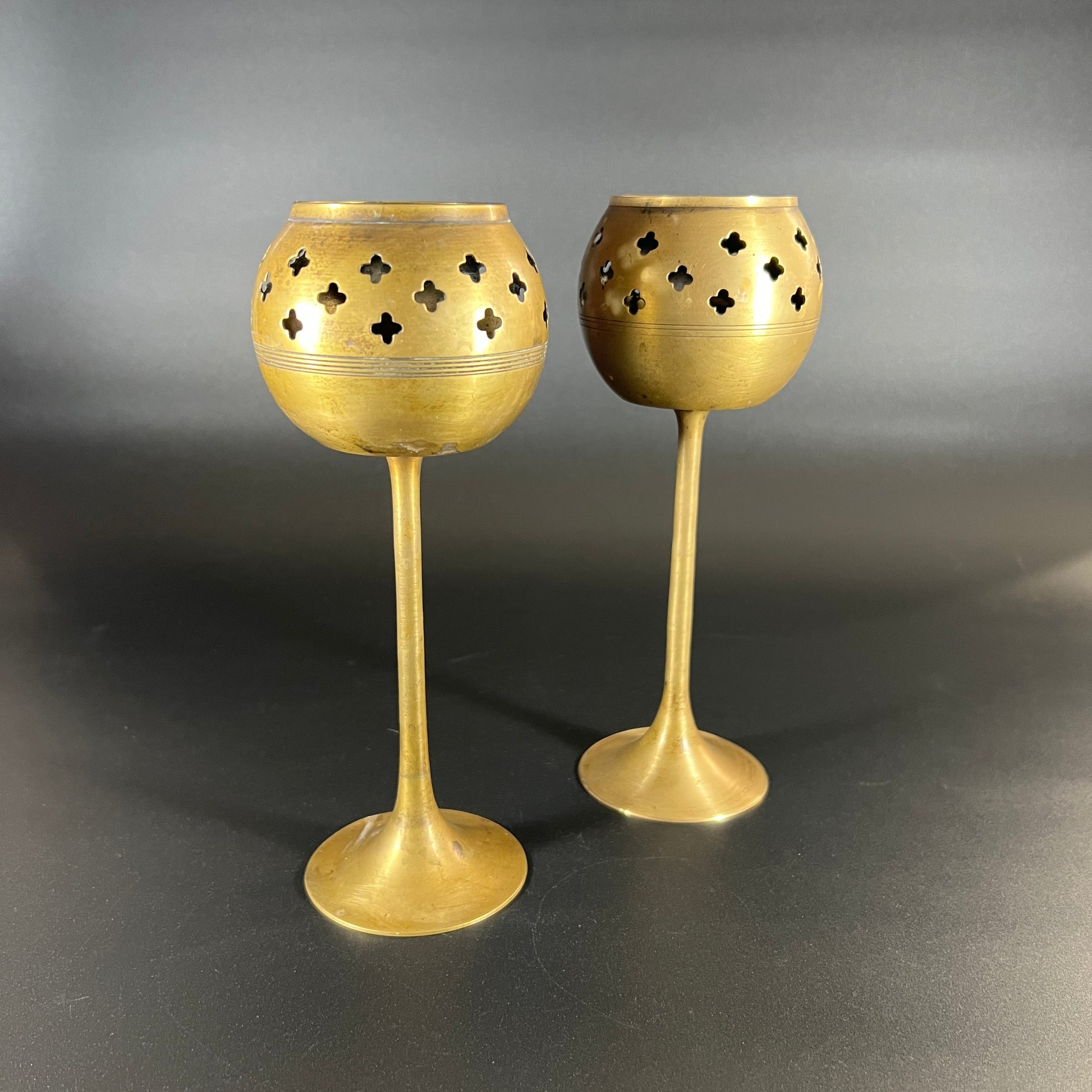 These charming candle holders are crafted from solid brass and feature a stunning pierced design that allows the light from the candle to shine through. They are in good vintage condition, with wear consistent with age. Each holder measures 8" high and has a diameter of 3". A beautiful addition to any home, adding both warmth and elegance to your decor.