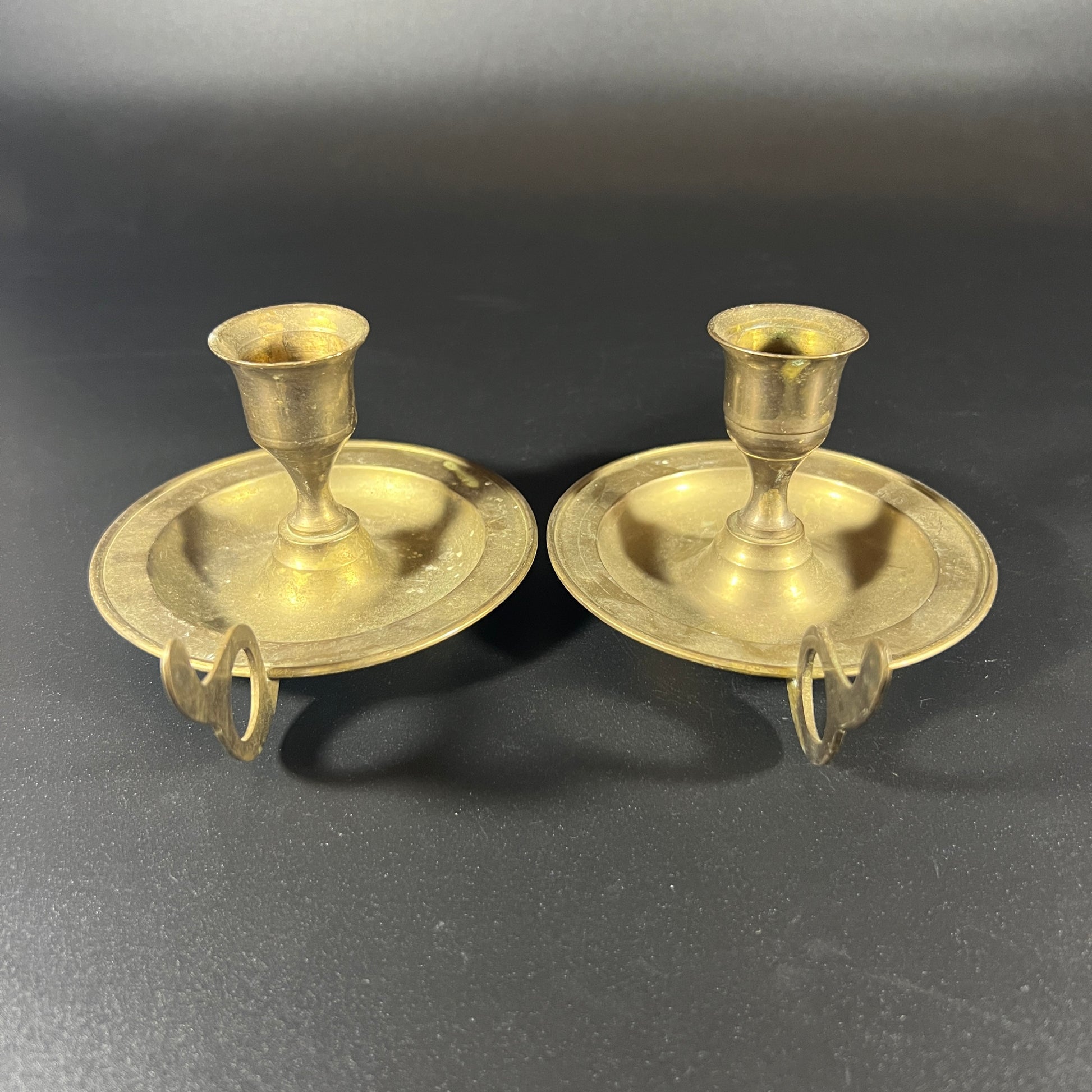 This vintage pair of brass bedside candle holders offers timeless charm and classic elegance. Featuring a traditional design with curved handles, they are perfect for adding a warm, vintage touch to any space. The holders are in good antique condition, with minor marks and wear consistent with age. Please refer to the photos for more details. Each measures approximately 3 inches high, 6.5 inches long (including the handle), and 4.5 inches wide—a beautiful addition to any antique or brass candle holder collection.