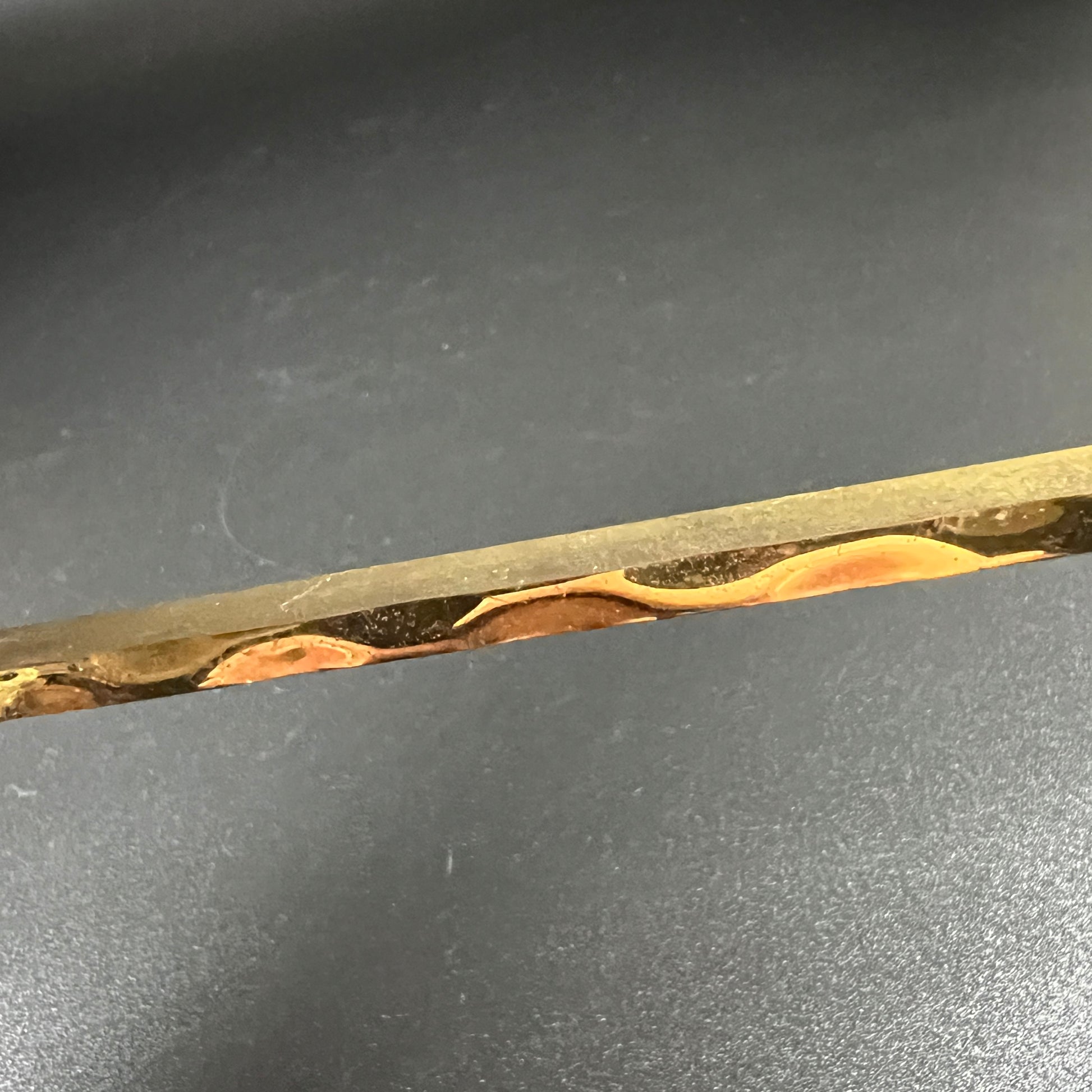 This vintage brass crucifix features a cross with a beautifully polished, textured front edge that catches the light, adding depth and elegance to its design.