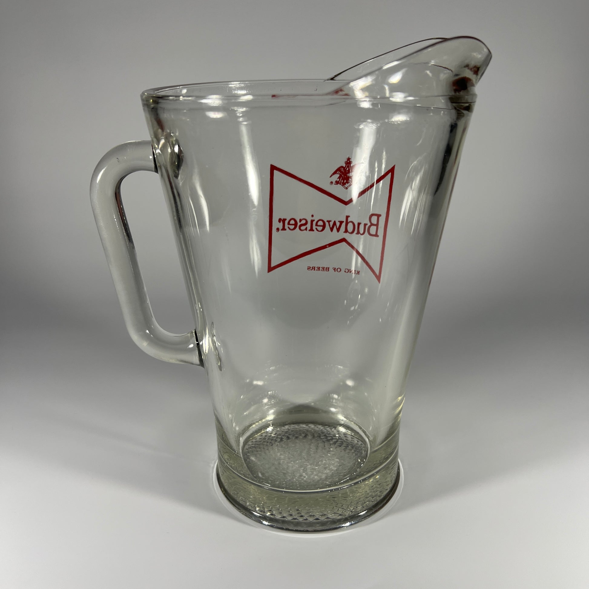 This vintage 1950s Budweiser "King of Beers" glass pitcher features a classic design with a distinctive pebbled base. In good vintage condition, it shows wear consistent with its age, adding character to this iconic piece. Please review the photos for more details. The pitcher measures approximately 9" H x 5.75" W (with handle) x 7.5" D. A must-have for beer collectors or those who appreciate retro barware!