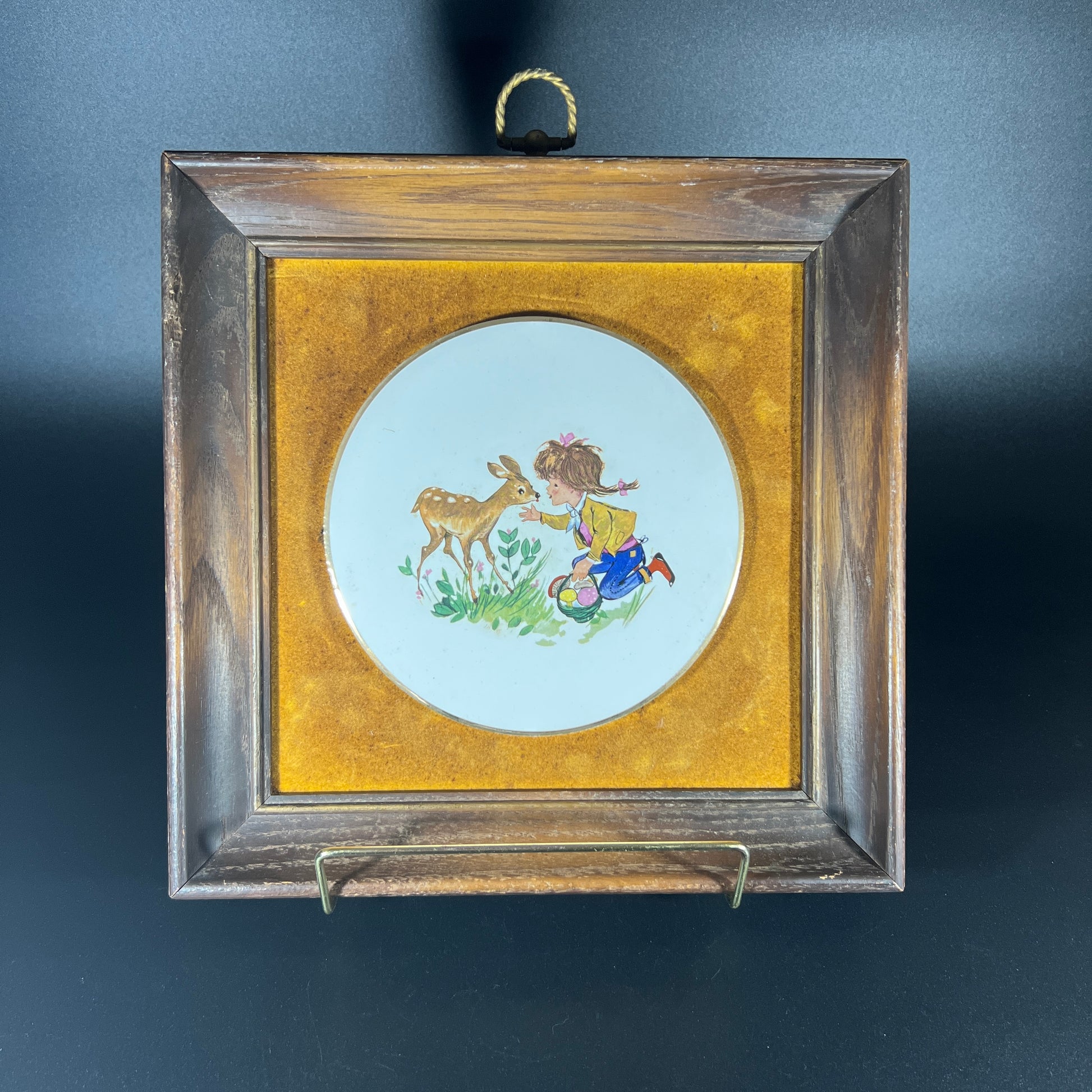 This charming 1960s mid-century decorative trivet, beautifully framed in rich wood, captures a nostalgic scene featuring a sweet child and a graceful doe. The illustration is set against a soft yellowish-orange felt background, adding a warm and inviting touch to any space. The piece, with its retro appeal, is in good vintage condition, showcasing the natural patina and gentle wear that comes with age, making it a unique and character-filled treasure. Measuring 10 inches in width, 10 inches in height, and 1.5 inches in depth, this delightful trivet is a perfect blend of art and function, evoking a sense of timeless charm.