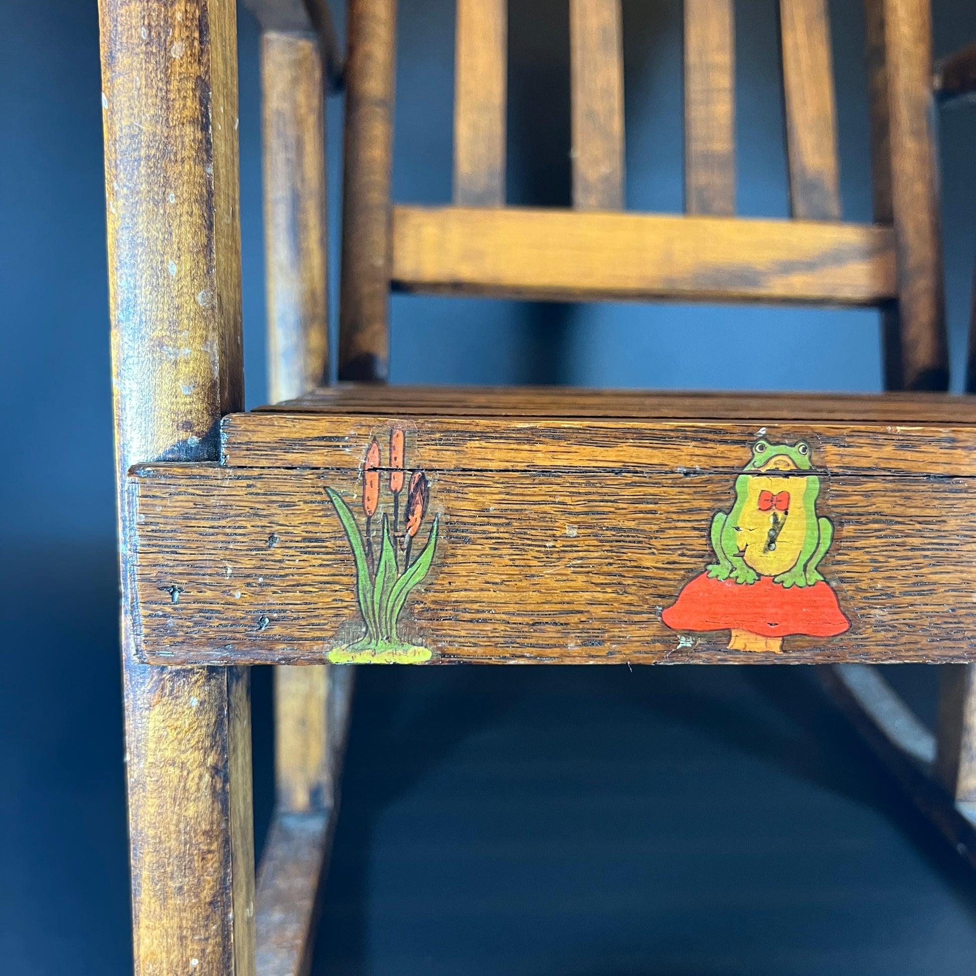 This vintage, possibly antique child's rocking chair is ideal for a small child or a large doll. In fair condition, it shows signs of age, with marks and wear typical for its vintage. The chair features hand applied illustrations of mushrooms, a turtle and frogs, adding a whimsical touch. It's overall dimensions are approximately 13" W x 18" H x 16" D, making it a delightful piece for a nursery or as a collectible.
