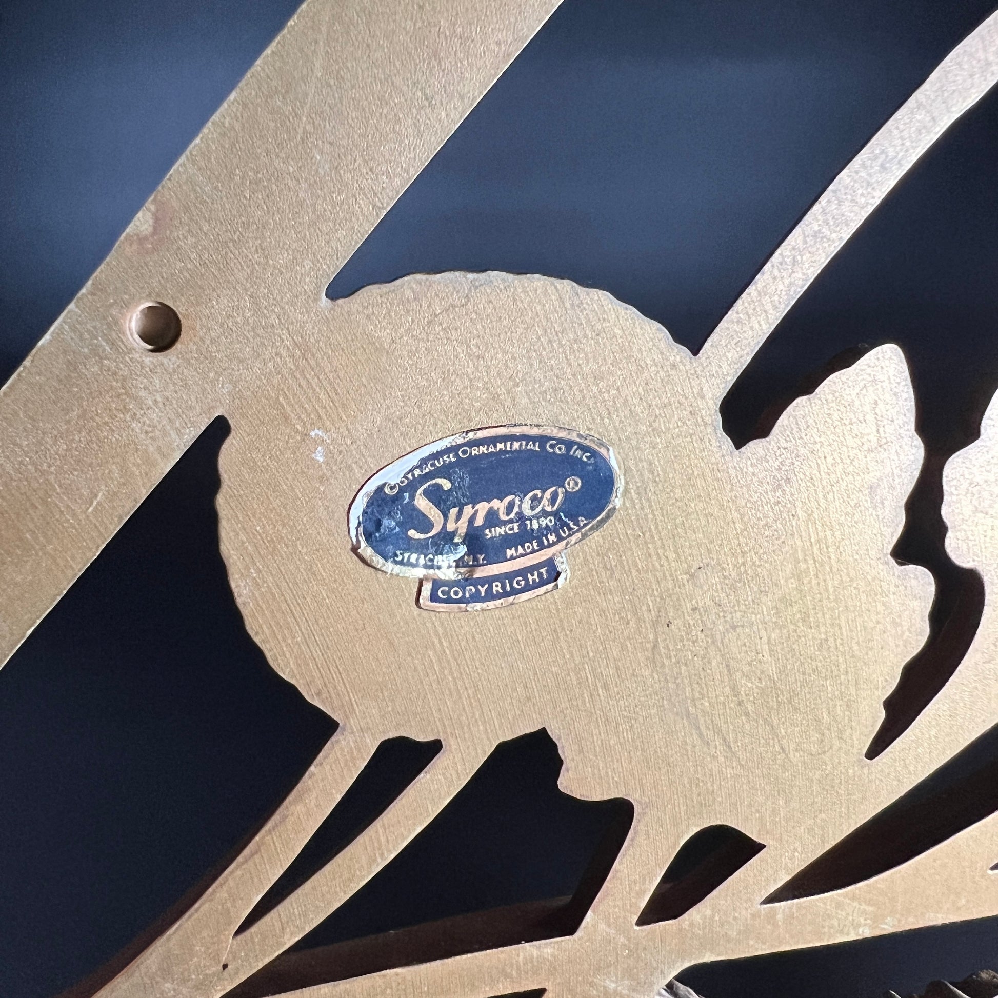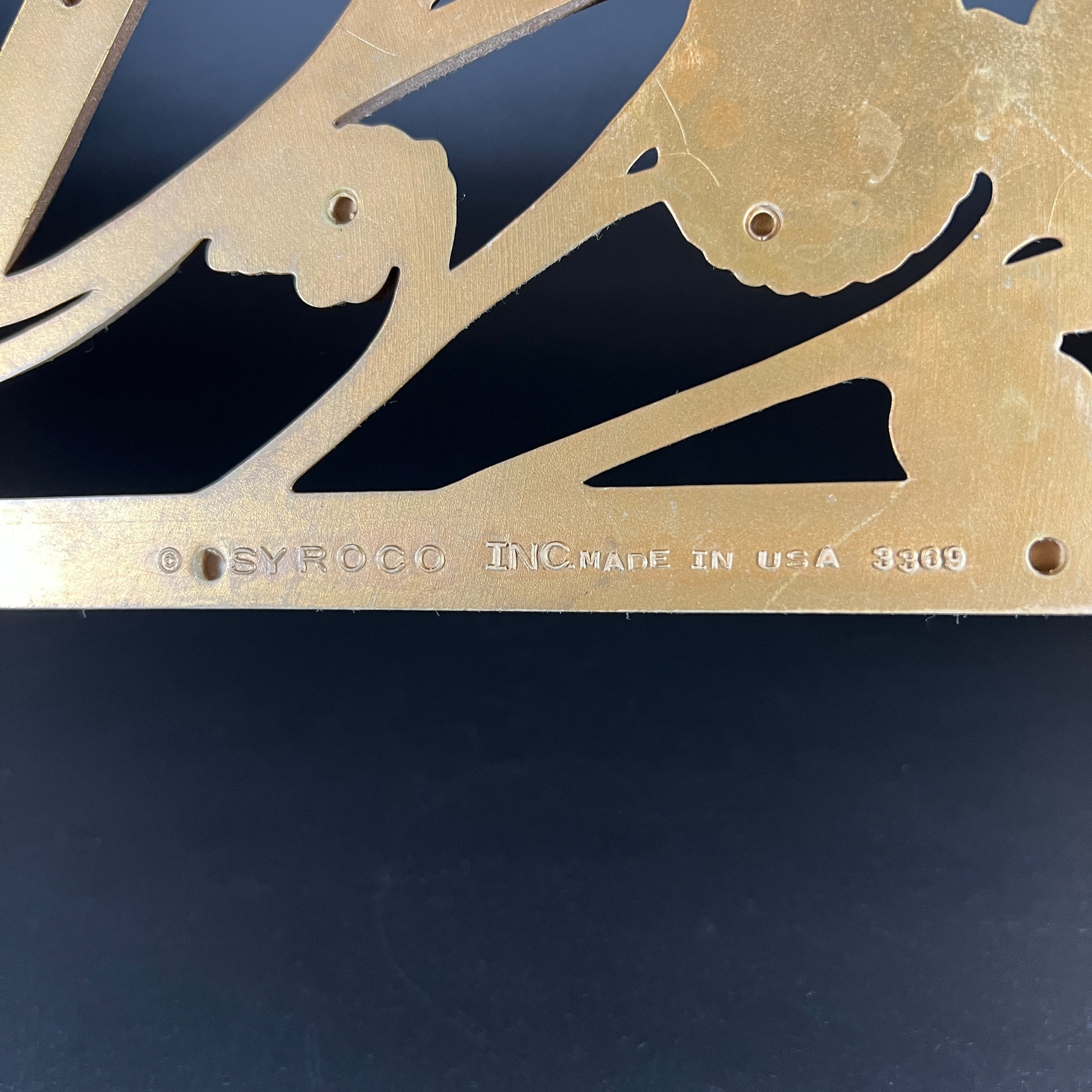 1950s diamond-shaped floral wall hanging by Syroco, made in Syracuse, NY. In good vintage condition with wear typical of age (please refer to photos for details). This charming piece adds a touch of classic Mid-Century Modern style to any room, with its beautiful golden hue. Measures approximately 10" W x 17" L x 0.5" D.