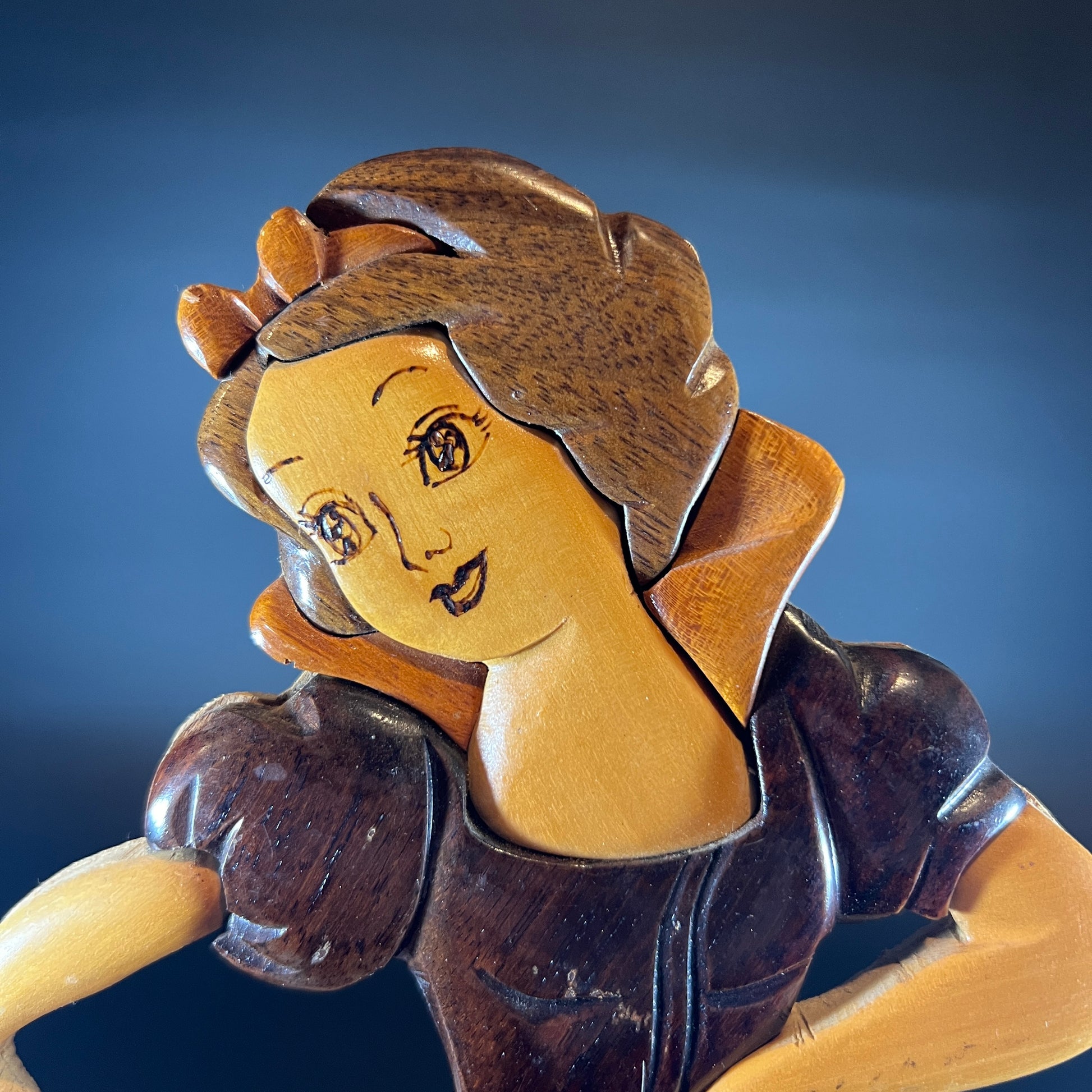 This vintage Disney Snow White with Doc handcrafted 3D wooden layered inlay wall plaque is a wonderful collectible piece of Disney folk art. The intricate design features Snow White and Doc in a charming, dimensional style. Please note that one of Snow White's feet appears to have broken off, which is reflected in the pricing. The plaque measures approximately 10" W x 12.5" H and includes a hook on the back for easy hanging. A unique addition to any Disney collection or wall decor!