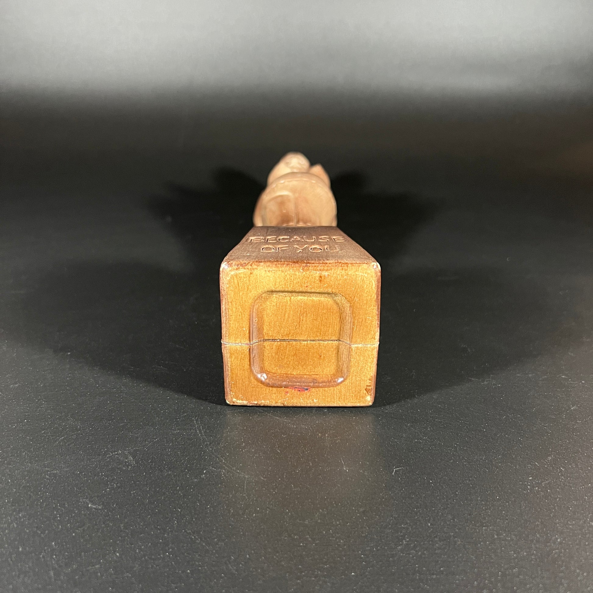This unusual statue is crafted from a hard plastic that mimics the look of wood. It depicts a topless pregnant woman with her hands placed behind her back, standing on a base that reads "Because of You." In good vintage condition, it measures approximately 10.5" in height, 2.25" in width, and 2.25" in depth.