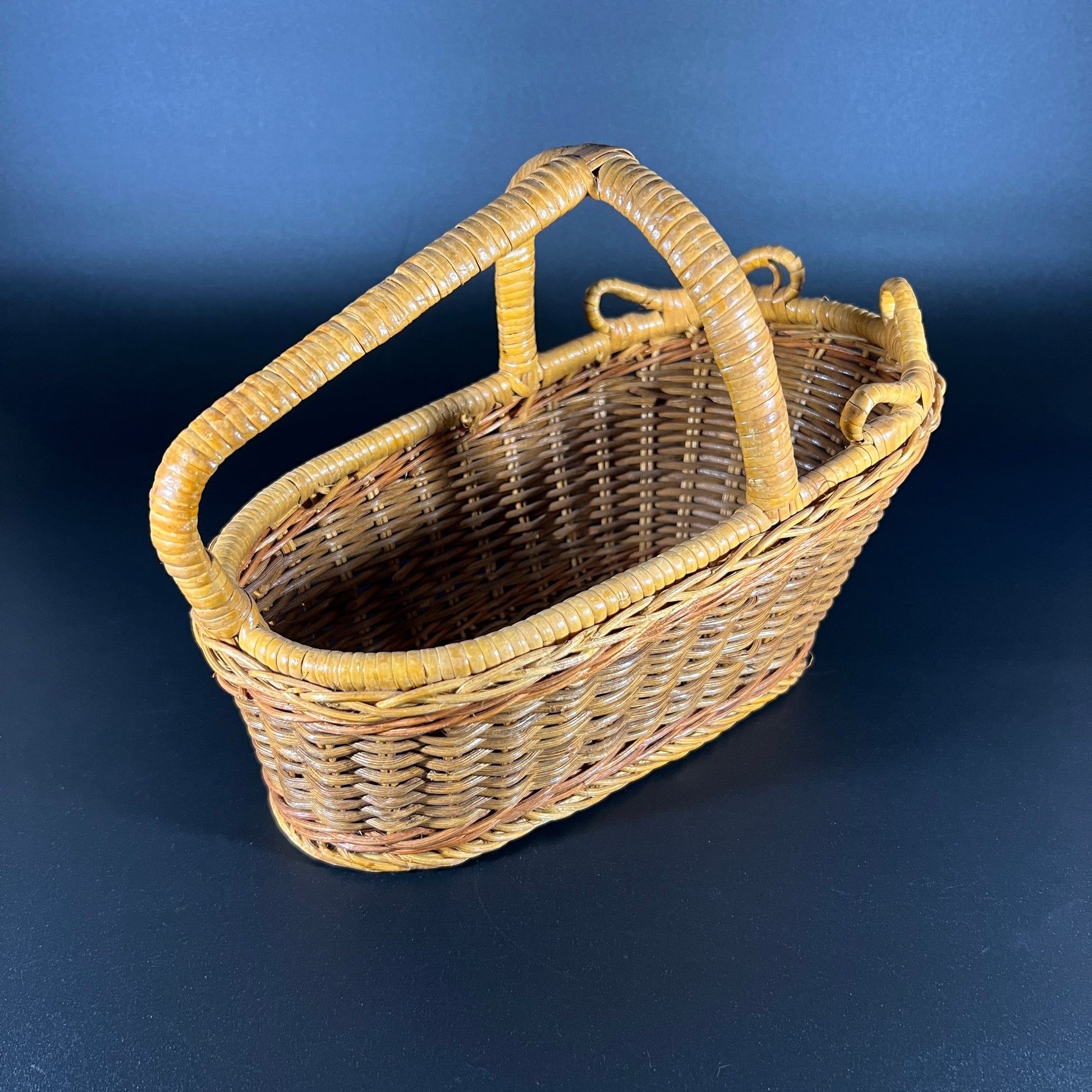 This vintage French rattan bottle holder, a stylish piece of 1960s barware decor, is in very good condition with no damage. Made in France, it combines timeless craftsmanship with functional design. The holder measures approximately 5.25" W x 10" L x 7.25" H, perfect for storing and displaying your favorite bottles in vintage style.