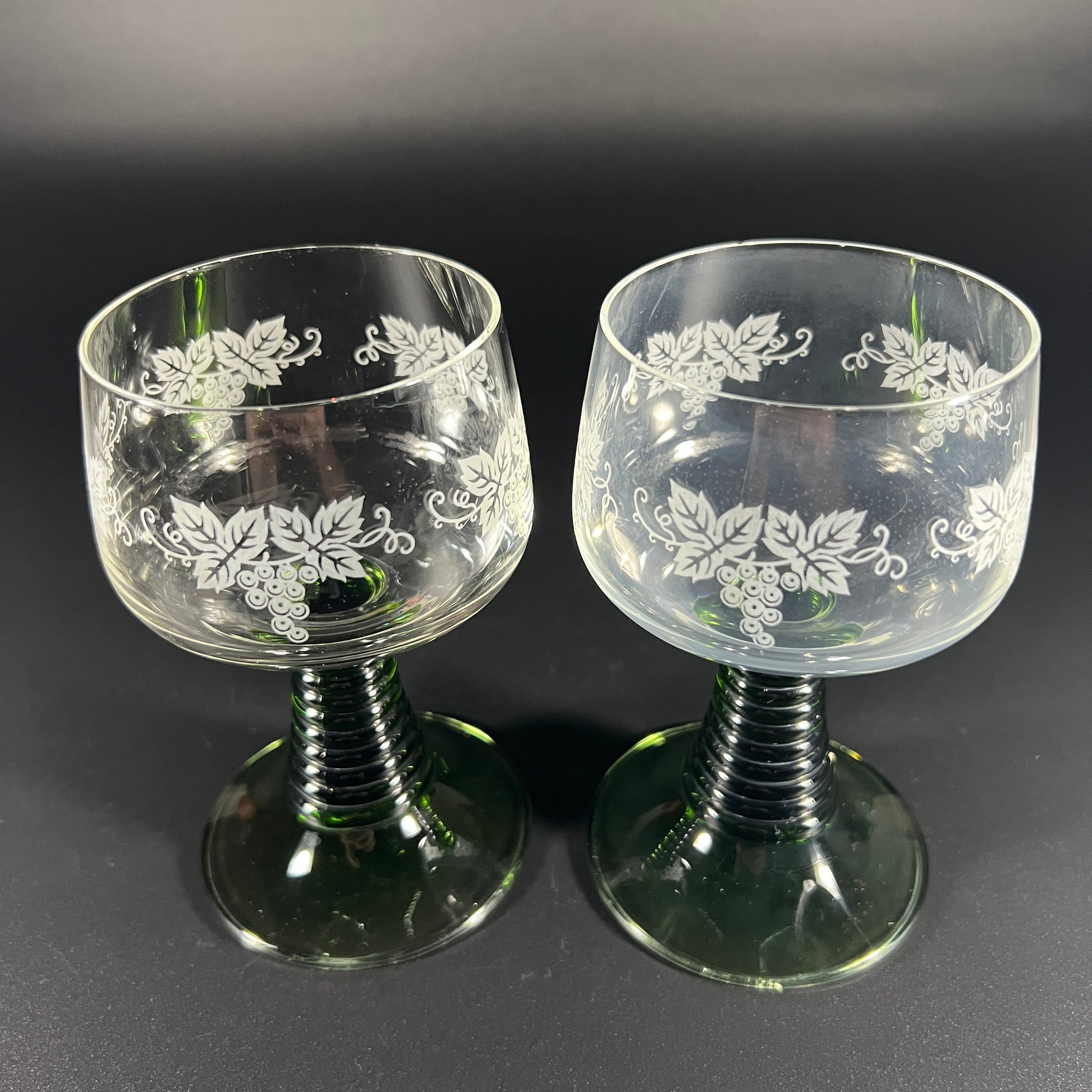 This set of two Roemer wine glasses features beautifully engraved grapevines, with the distinctive green glass rings on the stems that widen toward the base. In good vintage condition, they show wear consistent with age. One of the glasses appears slightly cloudier than the other, which could likely be corrected with proper cleaning; however, I chose not to use harsh cleaners to preserve the integrity of the glass. They have been priced accordingly. Please review the photos for more detail. Each glass measures approximately 5.5" H x 3.5" in diameter. A charming and elegant addition to any collection of vintage glassware!