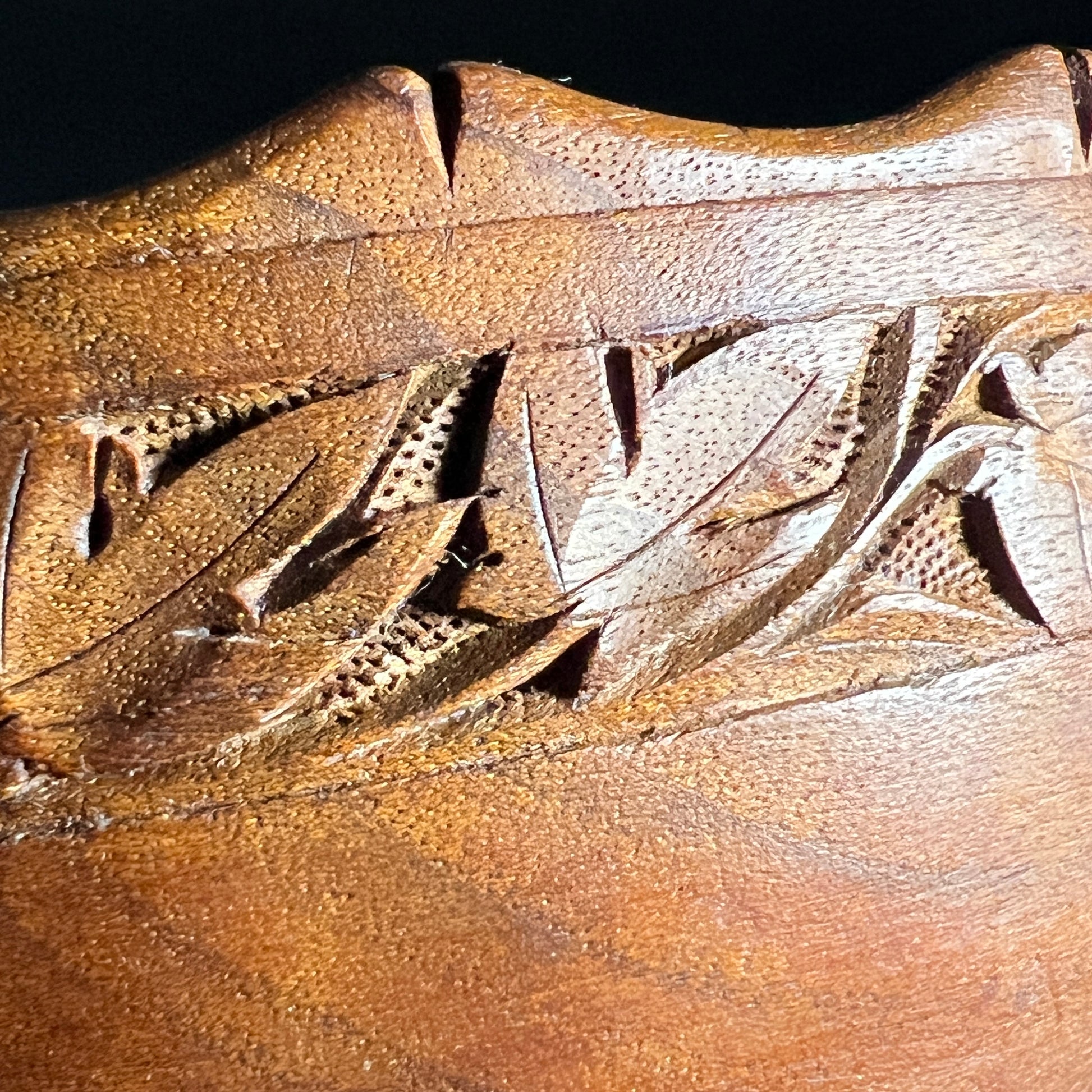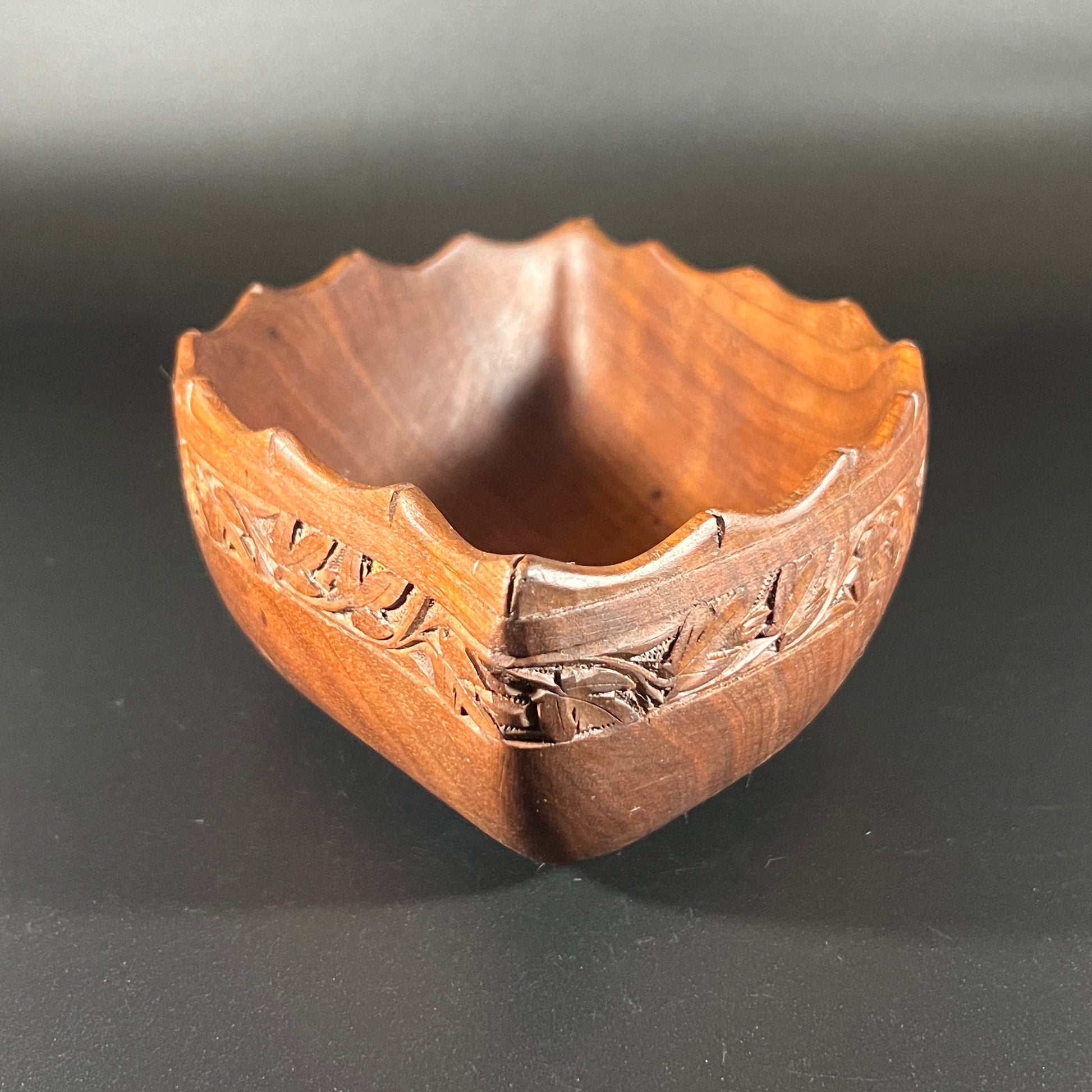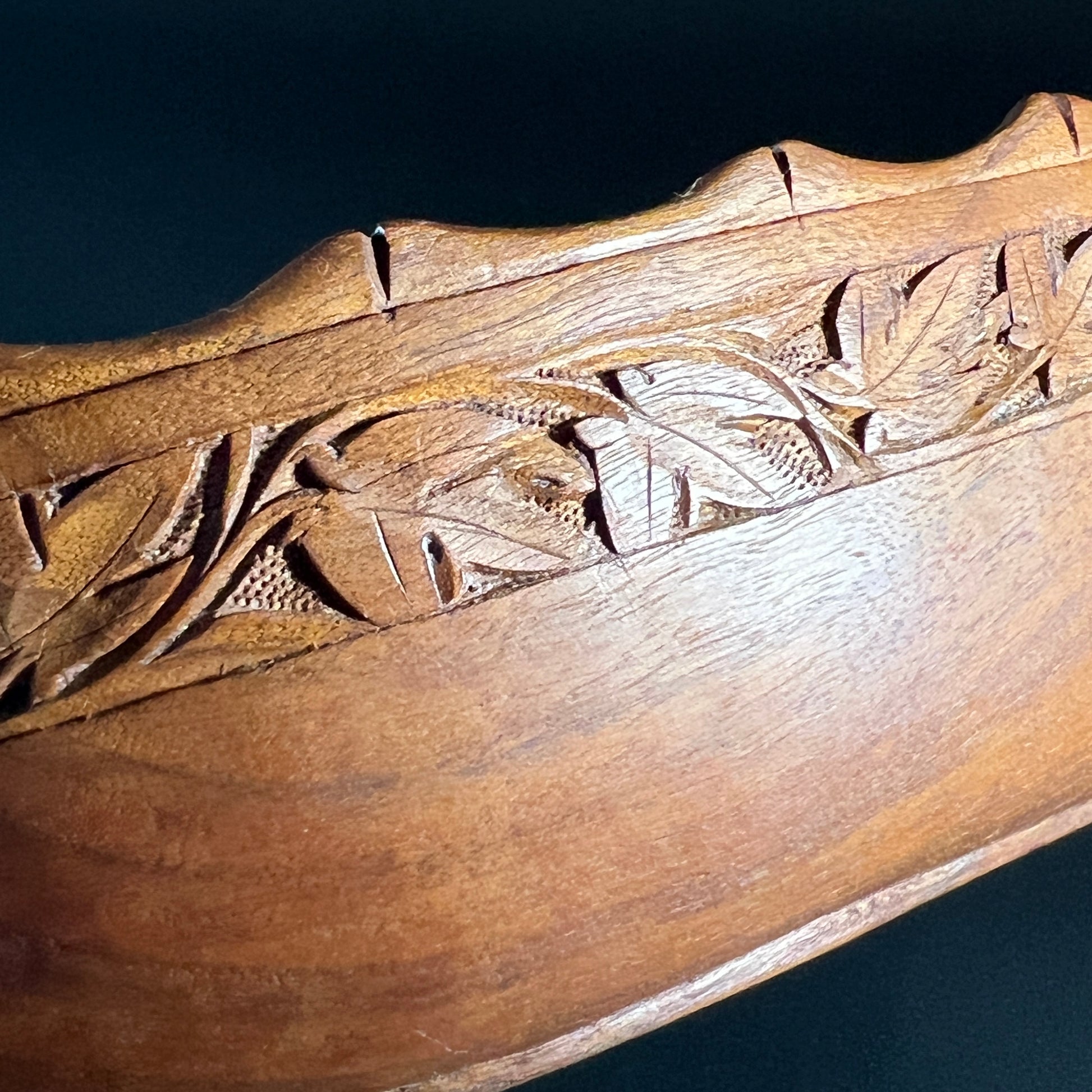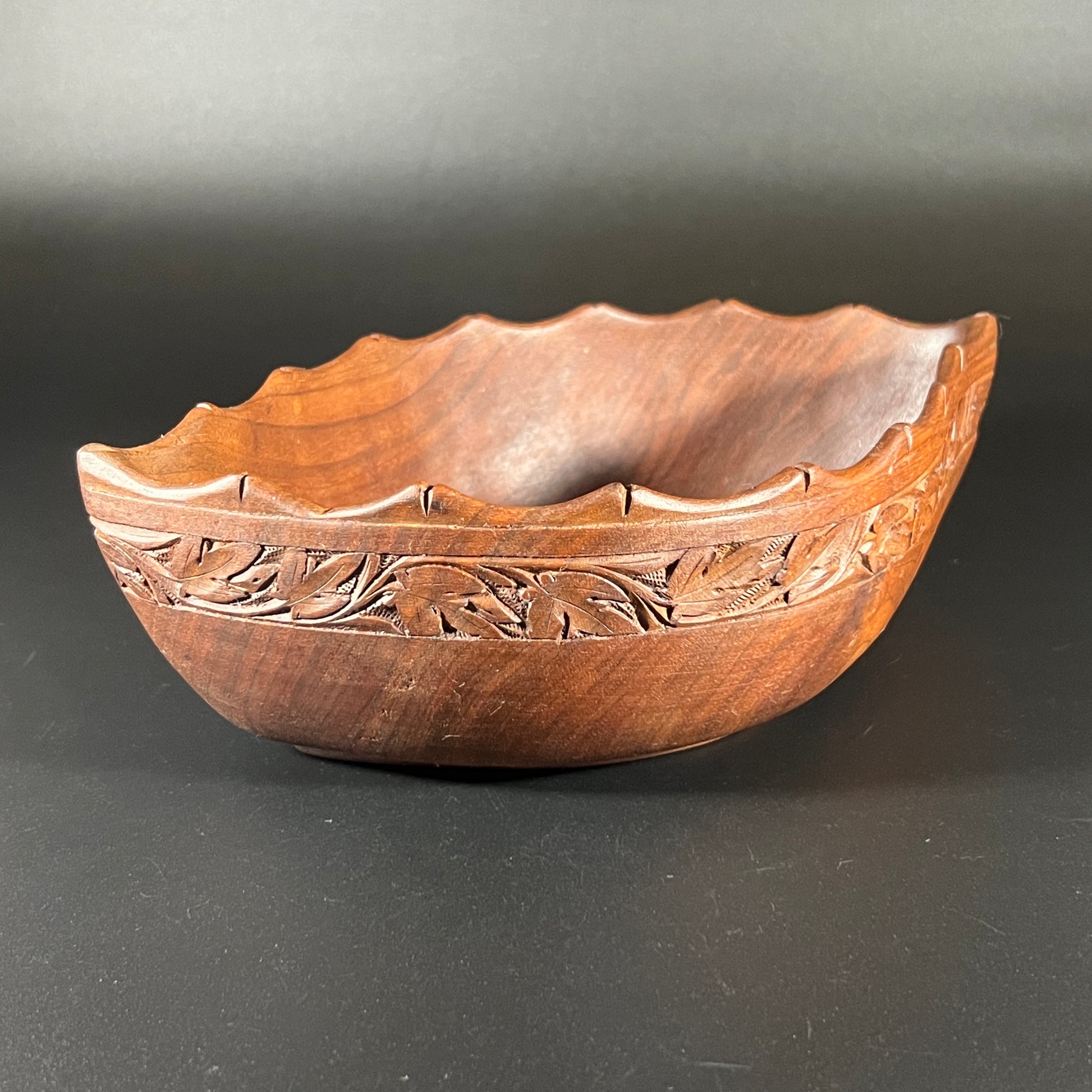 Beautifully crafted vintage wooden bowl, likely made from teak or monkey pod wood. Features intricate hand-carved details in a style reminiscent of traditional Polynesian artistry. In good vintage condition with light wear consistent with age.
