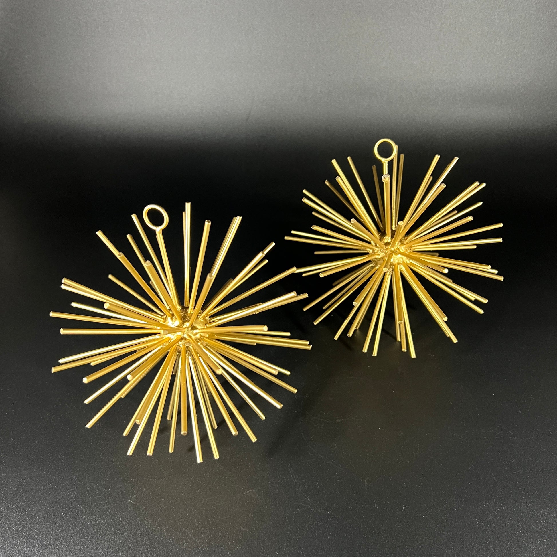 Pair of Atomic Metal Starburst Hanging Balls. These gold-toned decorative pieces feature a sleek starburst design with a hanging arm, adding a retro touch to any space. In excellent vintage condition, each ball measures 6" in diameter, making them a striking addition to mid-century modern or atomic-age decor.