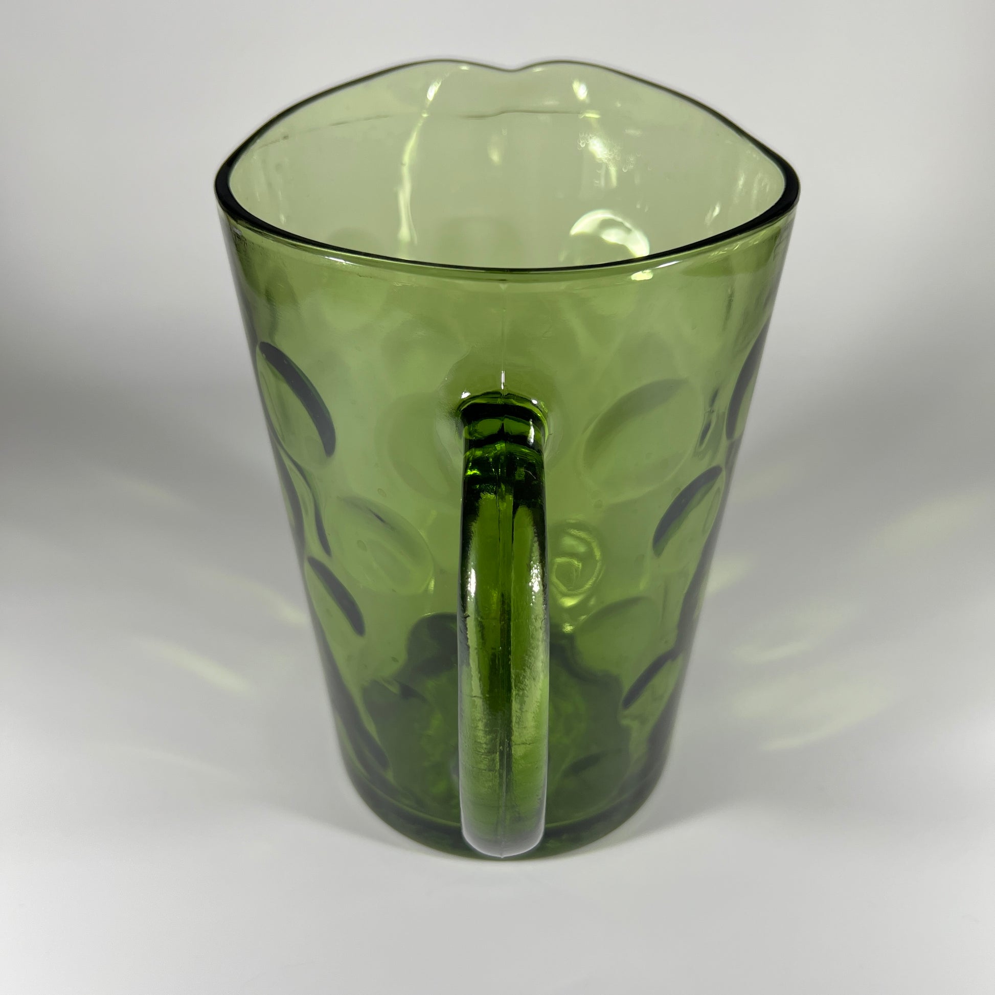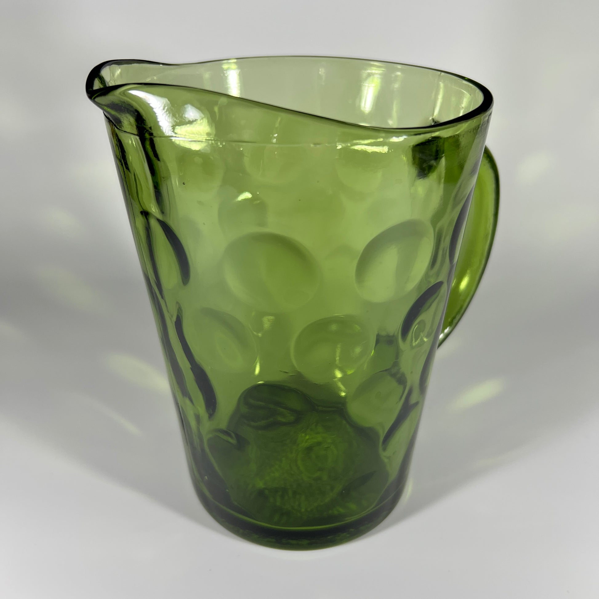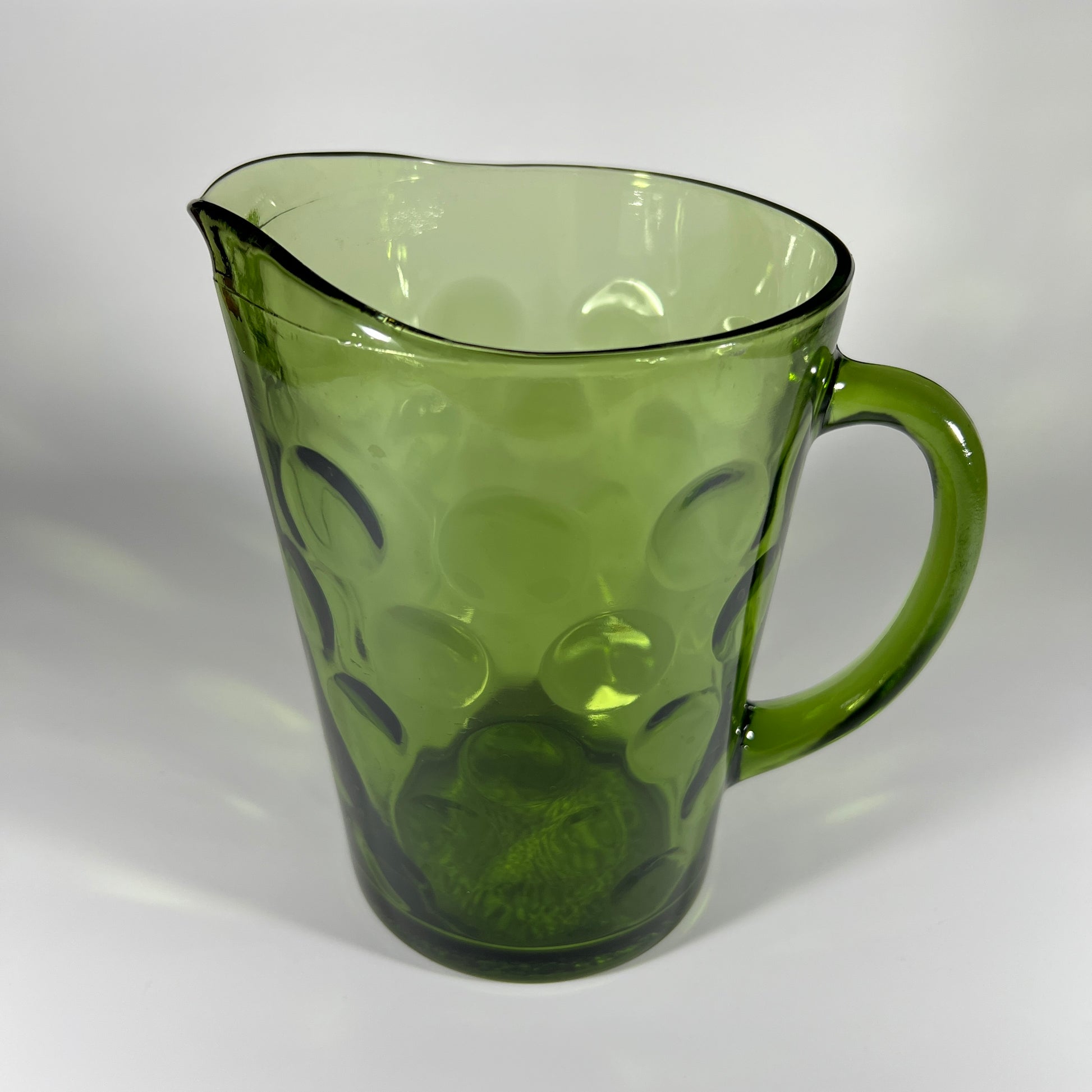 The pitcher is in good vintage condition with light wear consistent with age. Subtle micro bubbles can be seen in some areas—an expected trait of the glassmaking process from this period.