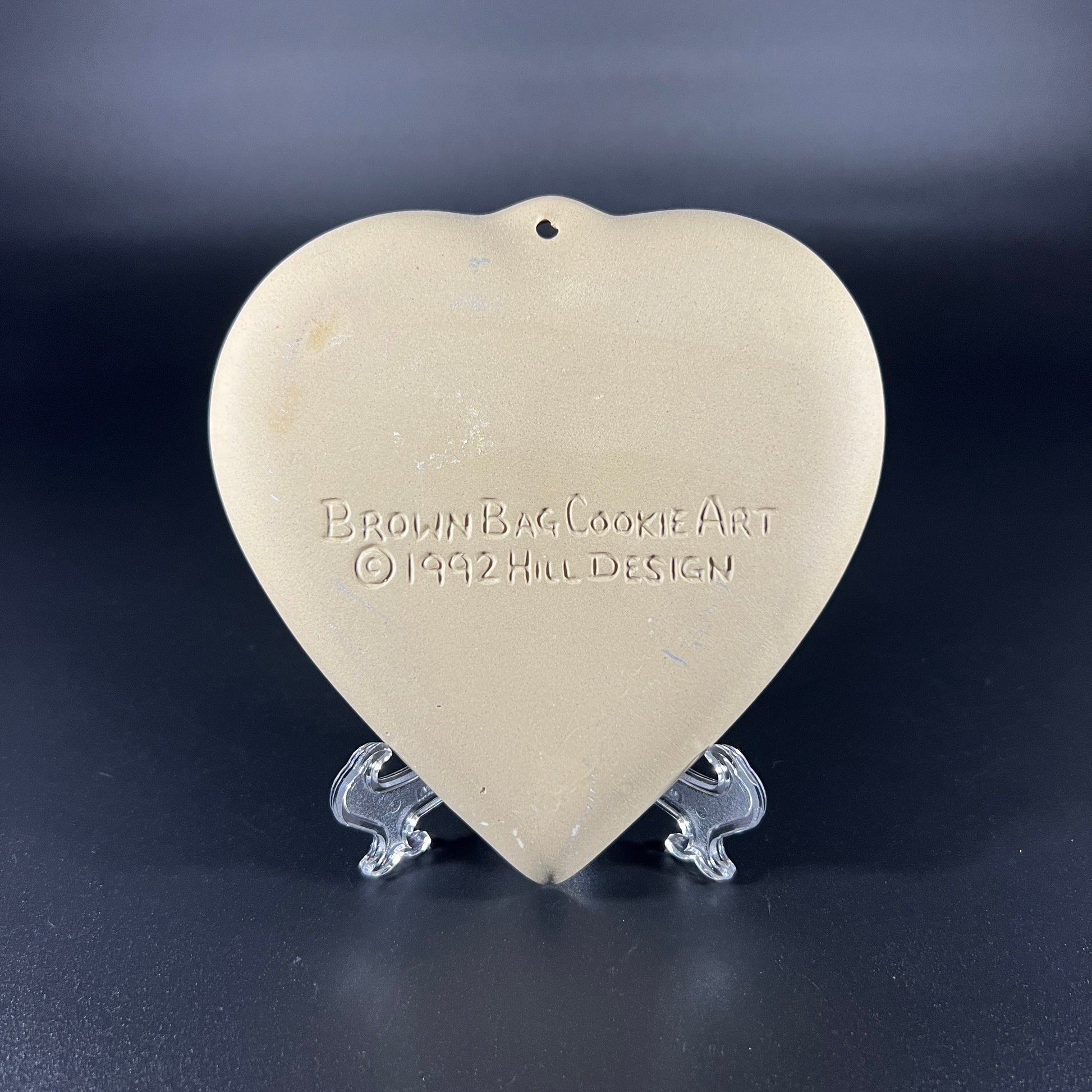 This vintage tan stoneware cookie mold is heart-shaped and features a delicate rose design. Made by Brown Bag Cookie Art Hill Design in 1992, it remains in very nice vintage condition. The mold measures approximately 5.75 inches in height, 5.5 inches in width, and 0.75 inches in depth. A charming and collectible piece for baking enthusiasts or vintage kitchenware collectors.