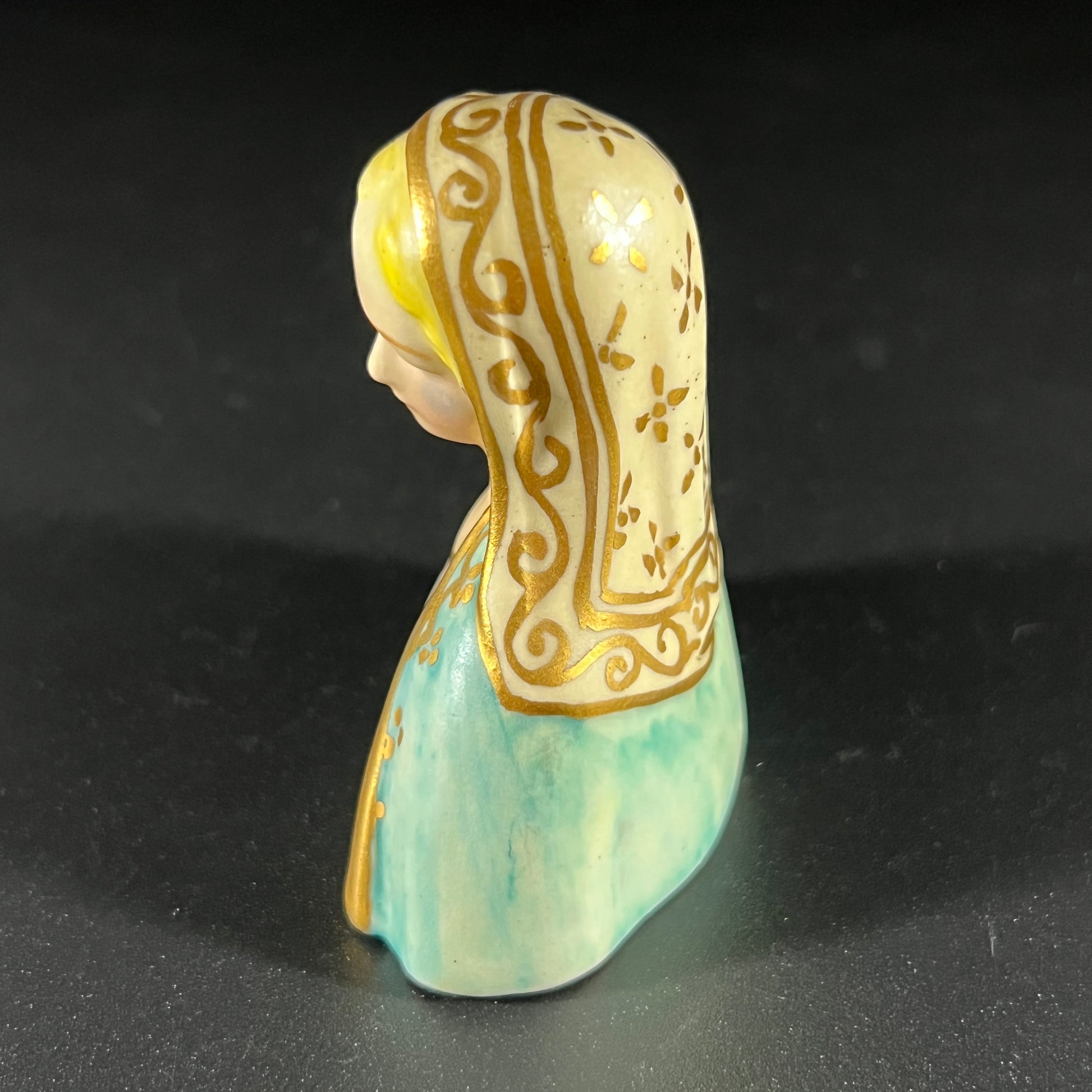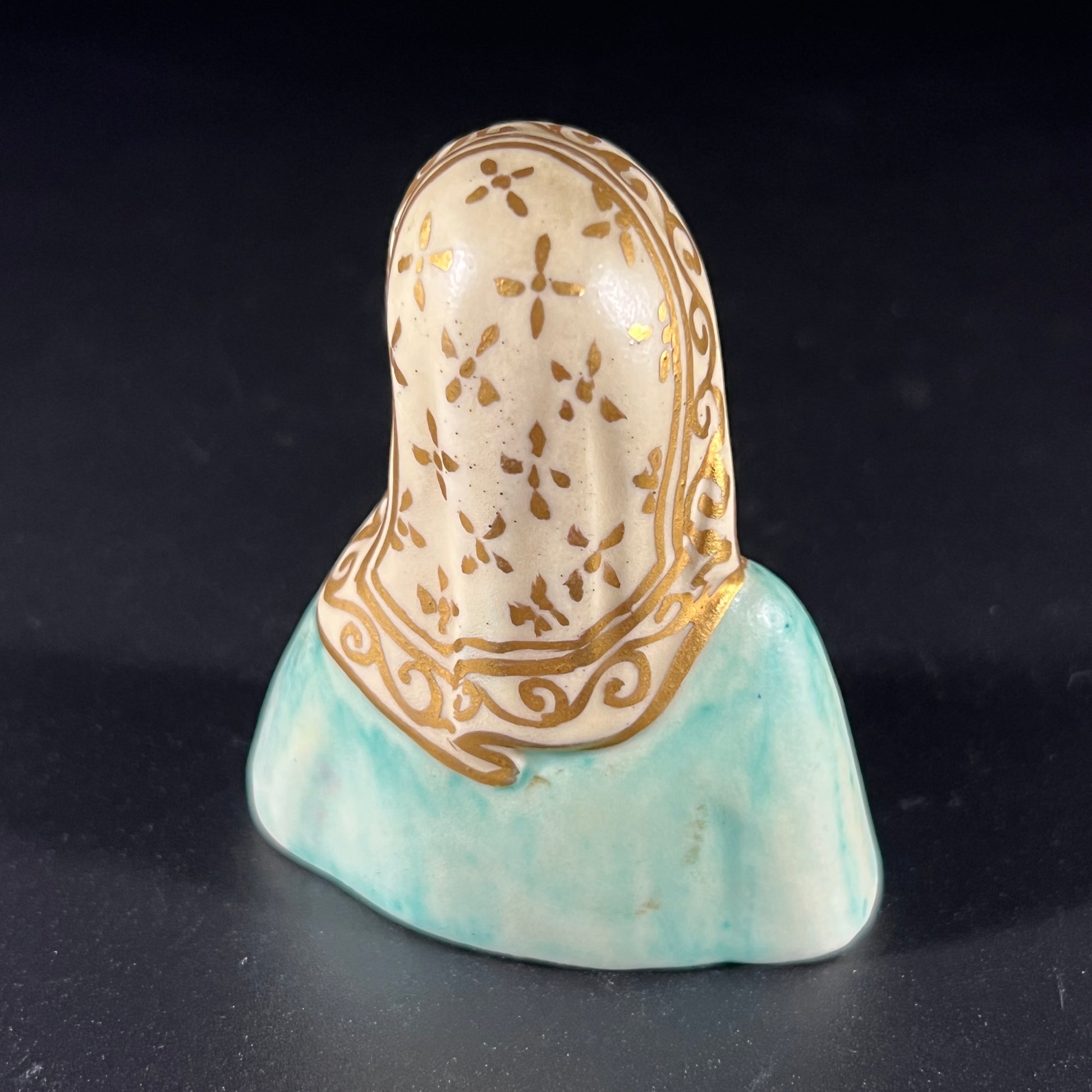 This vintage Italian Madonna figurine is beautifully hand-painted with gold accents and cast from what appears to be plaster. It is signed by the artist on the bottom, adding a personal touch to this lovely piece. In good vintage condition, it shows wear consistent with age. Please refer to the photos for more details. The item measures approximately 3" H x 2.75" W x 1.5" D.