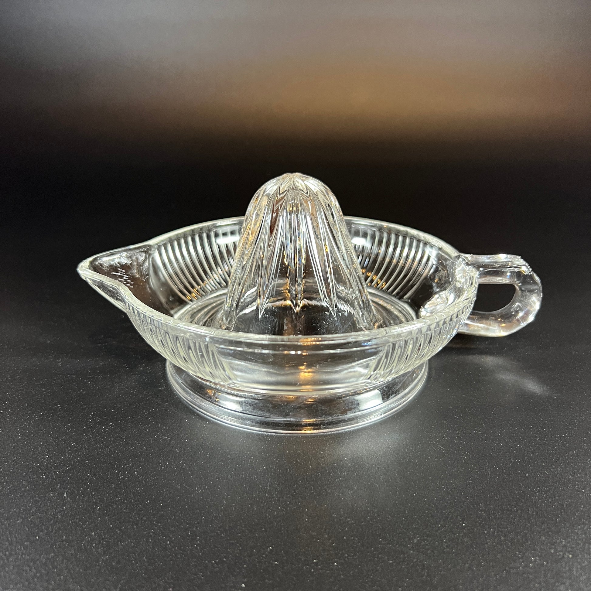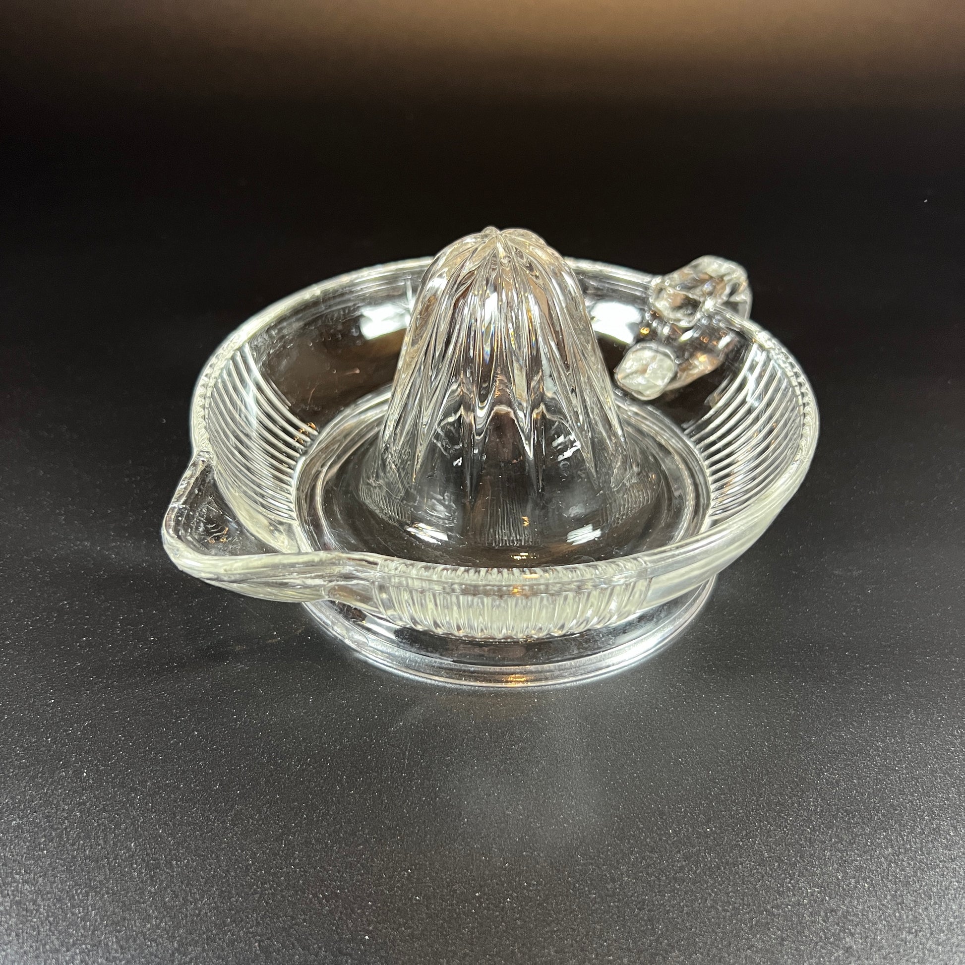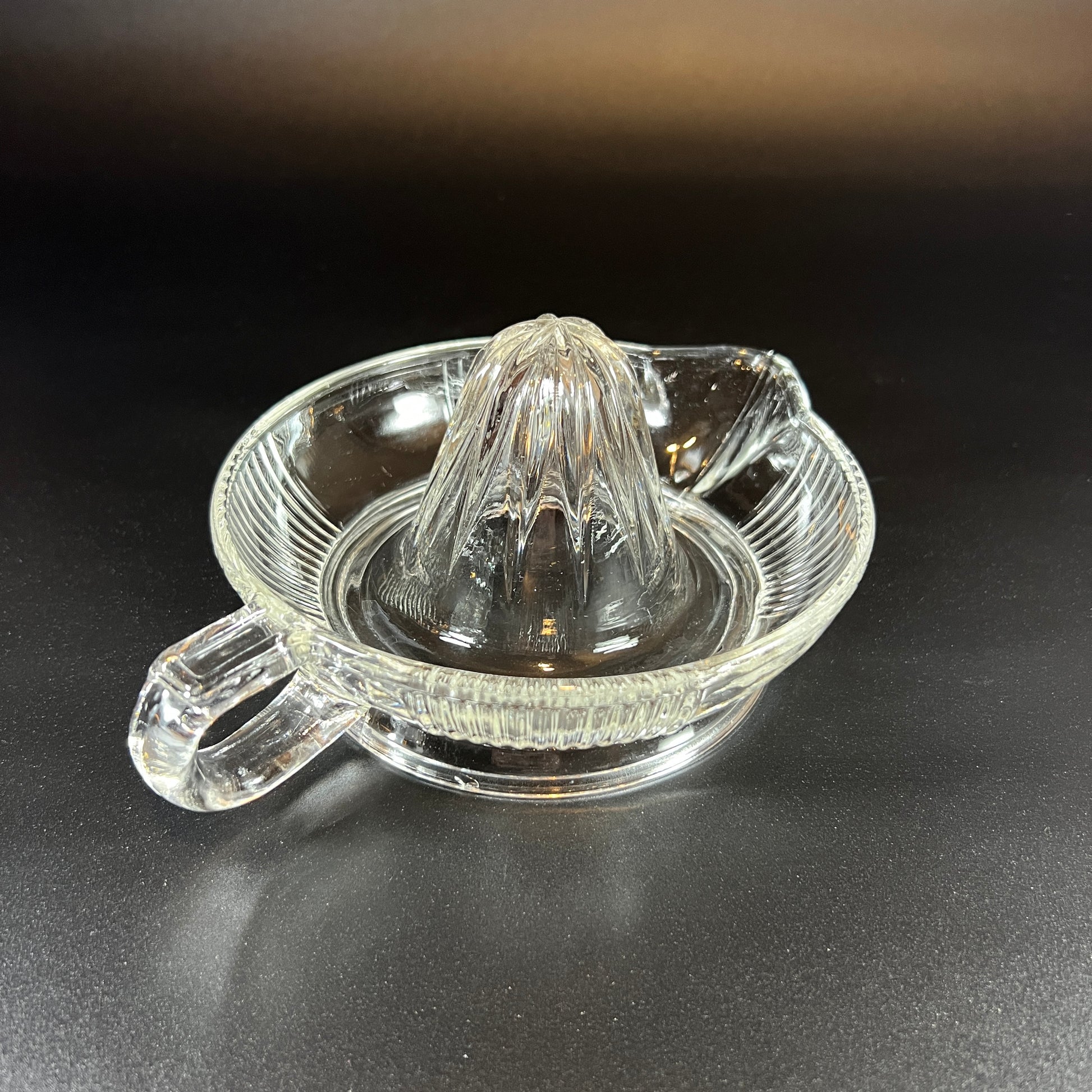 This vintage 1950s Mid-Century clear glass juicer/reamer is in absolutely perfect condition, with no visible flaws. A classic piece, it combines both functionality and retro charm, making it a wonderful addition to any kitchen or collection. It measures approximately 8 W x 3.5 H.