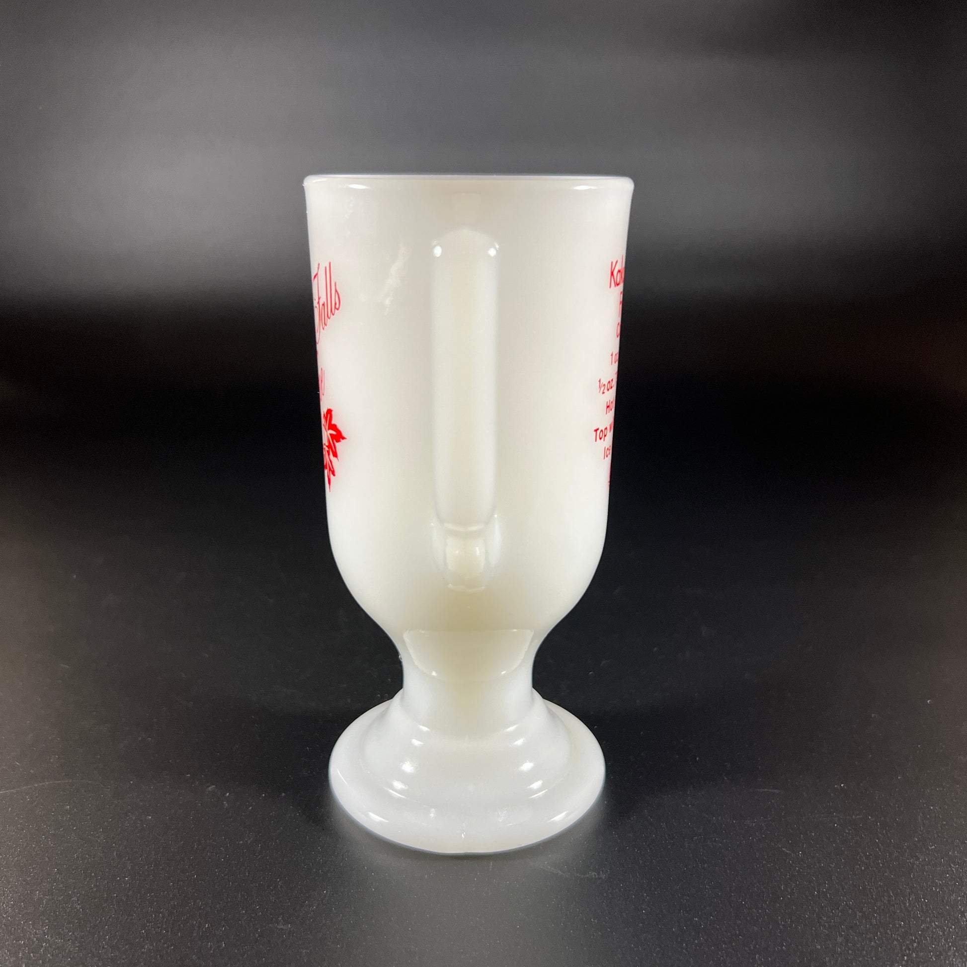 This vintage 1970s souvenir mug is from Kakabeka Falls Coffee, located in Ontario, and features a classic pedestal base. Made from milk glass, it showcases a clean, timeless design that adds charm to any collection. The mug is in excellent vintage condition with minimal signs of use—please see the photos for full details. It measures approximately 5.75 inches in height, 3.75 inches wide including the handle, and has a 2.5-inch opening. A wonderful addition for collectors of vintage mugs or Canadian memorabilia.